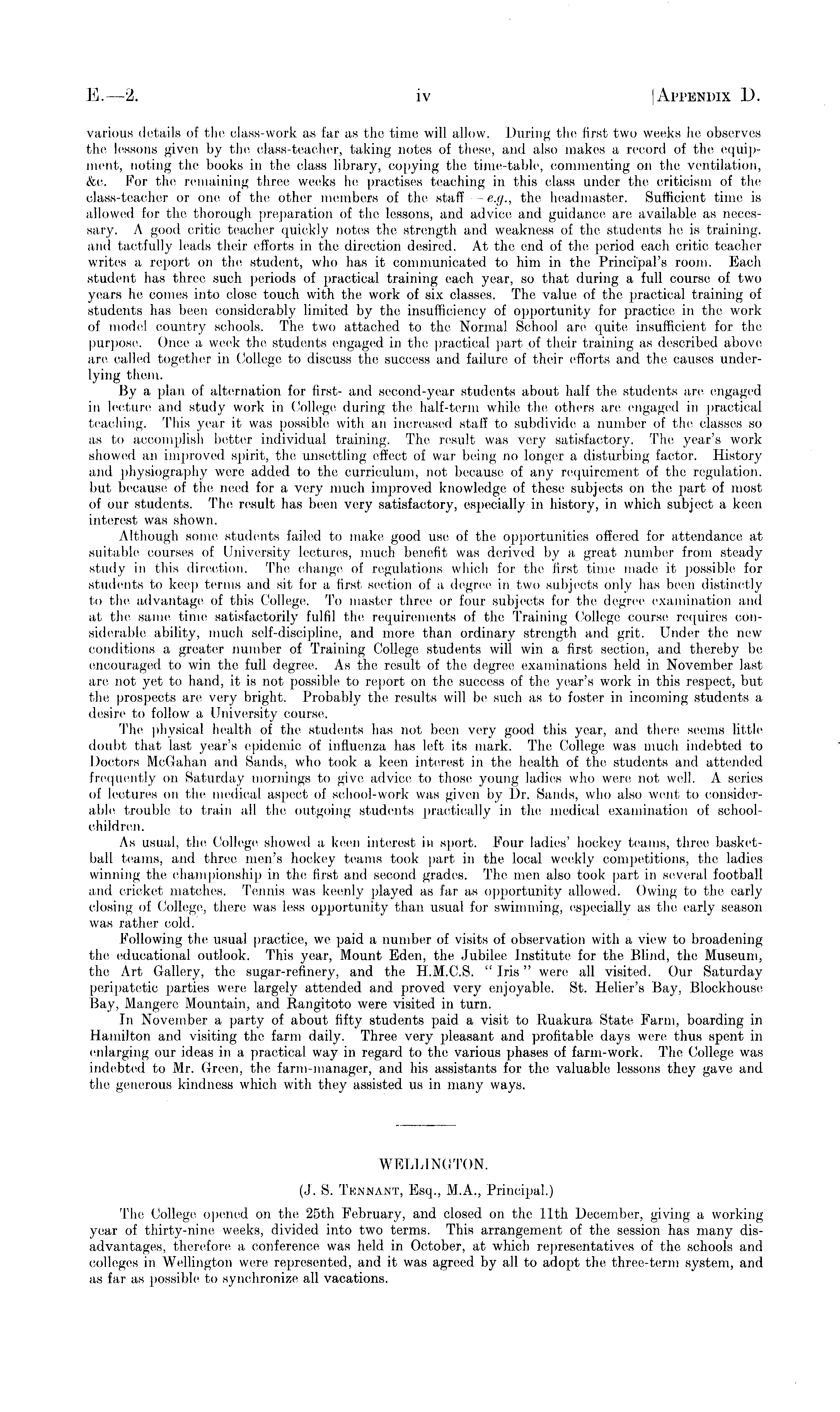 various details of the class-work as far as the time will allow. During the first two weeks he observes the lessons given by the class-teacher, taking notes of these, and also makes a record of the equipment, rioting the books in the class library, copying the time-table, commenting on the ventilation, &c. For the remaining three weeks he practises teaching in this class under the criticism of the class-teacher or one of the other members of the staff • e.g., the headmaster. Sufficient time is allowed for the thorough preparation of the lessons, and advice and guidance are, available as necessary. A good critic teacher quickly notes the strength and weakness of the students he is training, and tactfully leads their efforts in the direction desired. At the end of the period each critic teacher writes a report on the student, who has it communicated to him in the Principal's room. Each student has three such periods of practical training each year, so that during a full course of two years he comes into close touch with the work of six classes. The value of the practical training of students has been considerably limited by the insufficiency of opportunity for practice in the work of model country schools. The two attached to the Normal School are, quite insufficient for the, purpose. Once a week the students engaged in the, practical part of their training as described above are called together in College to discuss the success and failure, of their efforts and the causes underlying them. By a plan of alternation for first- and second-year students about half the students arc engaged in lecture and study work in College during the. half-term while the others are engaged in practical teaching. This year it was possible, with an increased staff to subdivide a number of the classes so as to accomplish better individual training. The result was very satisfactory. The year's work showed an improved spirit, the unsettling effect of war being no longer a disturbing factor. History and physiography were added to the curriculum, not because of any requirement of the regulation, but because of the need for a very much improved knowledge of these subjects on the part of most of our students. The result has been very satisfactory, especially in history, in which subject a keen interest was shown. Although some, students failed to make good use of the opportunities offered for attendance at suitable courses of University lectures, much benefit was derived by a great number from steady study in this direction. The change, of regulations which for the first time made it possible for students to keep terms and sit for a first section of a degree in two subjects only has been distinctly to the advantage, of this College. To master three or four subjects for the degree examination and at the same time satisfactorily fulfil the requirements of the Training College course requires considerable ability, much self-discipline, and more than ordinary strength and grit. Under the new conditions a greater number of Training College students will win a first section, and thereby be encouraged to win the, full degree. As the result of the, degree examinations held in November last are not yet to hand, it is not possible to report on the success of the year's work in this respect, but the prospects are very bright. Probably the results will be such as to foster in incoming students a desire to follow a University course. The physical health of the students has not been very good this year, and there seems little doubt that last year's epidemic of influenza has left its mark. The College was much indebted to Doctors McGahan and Sands, who took a keen interest in the health of the students and attended frequently on Saturday mornings to give advice to those young ladies who were not well. A series of lectures on the medical aspect of school-work was given by Dr. Sands, who also went, to considerable trouble to train all the outgoing students practically in the medical examination of schoolchildren. As usual, tin; College showed a keen interest in sport. Four ladies' hockey teams, three basketball teams, and three men's hockey teams took part in the local weekly competitions, the ladies winning the championship in the first and second grades. The men also took part in several football and cricket matches, Tennis was keenly played as far as opportunity allowed. Owing to the early closing of College, there was less opportunity than usual for swimming, especially as the early season was rather cold. Following the usual practice, we paid a number of visits of observation with a view to broadening the educational outlook. This year, Mount Eden, the Jubilee Institute for the Blind, the Museum, the Art Gallery, the sugar-refinery, and the H.M.C.S. "Iris" were all visited. Our Saturday peripatetic parties were largely attended and proved very enjoyable. St. Helier's Bay, Blockhouse Bay, Mangerc Mountain, and Rangitoto were visited in turn. In November a party of about fifty students paid a visit to Ruakura State, Farm, boarding in Hamilton and visiting the farm daily. Three very pleasant and profitable days were thus spent in enlarging our ideas in a practical way in regard to the various phases of farm-work. The College was indebted to Mr. Green, the farm-manager, and his assistants for the valuable lessons they gave, and the generous kindness which with they assisted us in many ways. WELLINGTON. (J. S. Tbnnant, Esq., M.A., Principal.) The College opened on the 25th February, and closed on the 11th December, giving a working year of thirty-nine weeks, divided into two terms. This arrangement of the session has many disadvantages, therefore a conference, was held in October, at which representatives of the schools and colleges in Wellington were represented, and it was agreed by all to adopt the three-term system, and as far as possible to synchronize all vacations.