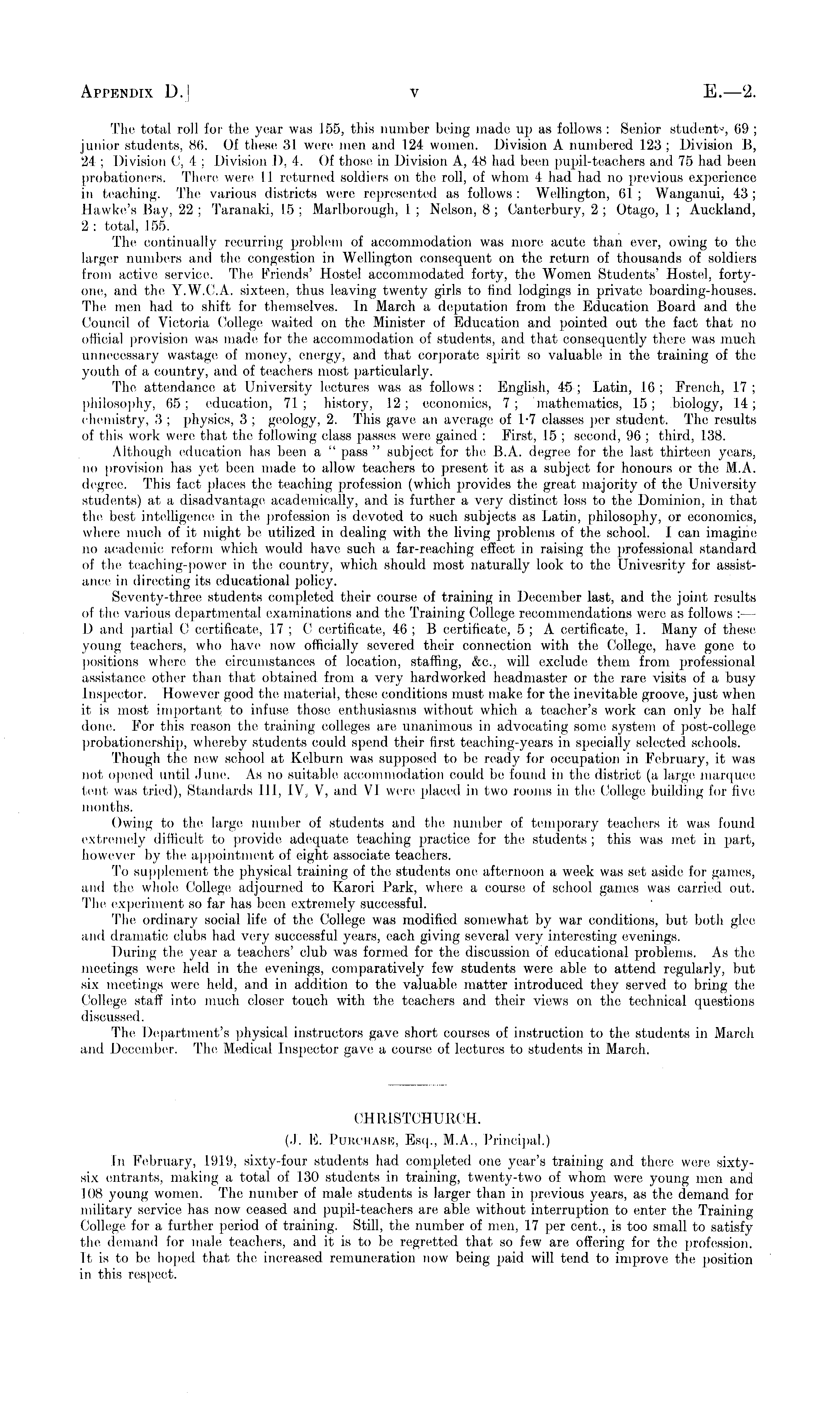 The total roll for the year was 155, this number being made up as follows : Senior student?, 69 ; junior students, 86. Of these 31 were men and 124 women. Division A numbered 123 ; Division B, 24 ; Division C, 4 ; Division I), 1. Of those in Division A, 48 had been pupil-teachers and 75 had been probationers. There were 1 1 returned soldiers on the roll, of whom 4 had had no previous experience in teaching. The various districts were represented as follows: Wellington, 61; Wanganui, 4-3; Hawke's Bay, 22 ; Taranaki, 15 ; Marlborough, 1 ; Nelson, 8 ; Canterbury, 2 ; Otago, 1 ; Auckland, 2: total, 155. The continually recurring problem of accommodation was more acute than ever, owing to the larger numbers and the congestion in Wellington consequent on the return of thousands of soldiers from active service. The Friends' Hostel accommodated forty, the Women Students' Hostel, fortyone, and the Y.W.C.A. sixteen, thus leaving twenty girls to find lodgings in private, boarding-houses. The men had to shift for themselves. In March a deputation from the Education Board and the Council of Victoria College waited on the Minister of Education and pointed out the fact that no official provision was made for the accommodation of students, and that consequently there was much unnecessary wastage of money, energy, and that corporate spirit so valuable in the training of the youth of a country, and of teachers most particularly. The attendance at University lectures was as follows: English, 45; Latin, 16; French, 17; philosophy, 65; education, 71; history, 12; economies, 7; mathematics, 15; biology, 14; chemistry, 3 ; physics, 3 ; geology, 2. This gave an average of 1.-7 classes per student. The results of this work were that the following class passes were gained : First, 15 ; second, 96 ; third, 138. Although education has been a " pass " subject for the B.A. degree for the last thirteen years, no provision has yet been made to allow teachers to present it as a subject for honours or the M.A. degree. This fact places the teaching profession (which provides the groat majority of the University students) at a disadvantage academically, and is further a very distinct loss to the Dominion, in that the best intelligence in the profession is devoted to such subjects as Latin, philosophy, or economics, where much of it might be utilized in dealing with the. living problems of the school. I can imagine no academic reform which would have, such a far-reaching effect in raising the professional standard of the teaching-power in tin; country, which should most naturally look to the Univesrity for assistance in directing its educational policy. Seventy-three students completed their course of training in December last, and the joint results of the various departmental examinations and the Training College recommendatious were as follows : D and partial 0 certificate, 17 ; C certificate, 46 ; B certificate, 5; A. certificate, 1. Many of these young teachers, who have now officially severed their connection with the College, have gone, to positions where the circumstances of location, staffing, &c, will exclude them from professional assistance, other than that obtained from a very hard worked headmaster or the rare visits of a busy Inspector. However good the material, these conditions must make for the, inevitable groove, just when it is most important to infuse those enthusiasms without which a teacher's work can only be half done. For this reason the training colleges are unanimous in advocating some system of post-college probationership, whereby students could spend their first teaching-years in specially selected schools. Though the, new school at Kelburn was supposed to be ready for occupation in February, it was not opened until. June. As no suitable accommodation could be found in the district (a large, marquee lent was tried), Standards 111, IV, V, and VI were placed in two rooms in the College building for five months. Owing to the large number of students and the number of temporary teachers it was found extremely difficult to provide, adequate teaching practice for the students ; this was met in part, however by the appointment of eight associate teachers. To supplement the physical training of the students one afternoon a week was set aside for games, and the whole. College adjourned to Karori Park, where a course of school games was carried out. The experiment so far has been extremely successful. The ordinary social life of the College was modified somewhat by war conditions, but both glee and dramatic clubs had very successful years, each giving several very interesting evenings. During the year a teachers' club was formed for the discussion of educational problems. As the meetings were held in the evenings, comparatively few students were able to attend regularly, but six meetings were held, and in addition to the valuable matter introduced they served to bring the College staff into much closer touch with the teachers and their views on the technical questions discussed. The, Department's physical instructors gave short courses of instruction to the, students in March and December. The Medical Inspector gave a course of lectures to students in March. CHRISTCHURCH. (.1. E. Purchase, Esq., M.A., Principal.) In February, 1919, sixty-four students had completed one year's training and there were sixtysix entrants, making a total of 130 students in training, twenty-two of whom were young men and 108 young women. The number of male students is larger than in previous years, as the demand for military service has now ceased and pupil-teachers are able without interruption to enter the Training College for a further period of training. Still, the number of men, 17 per cent., is too small to satisfy the demand for male teachers, and it is to be regretted that so few are offering for the profession. It is to be hoped that the, increased remuneration now being paid will tend to improve the position in this r