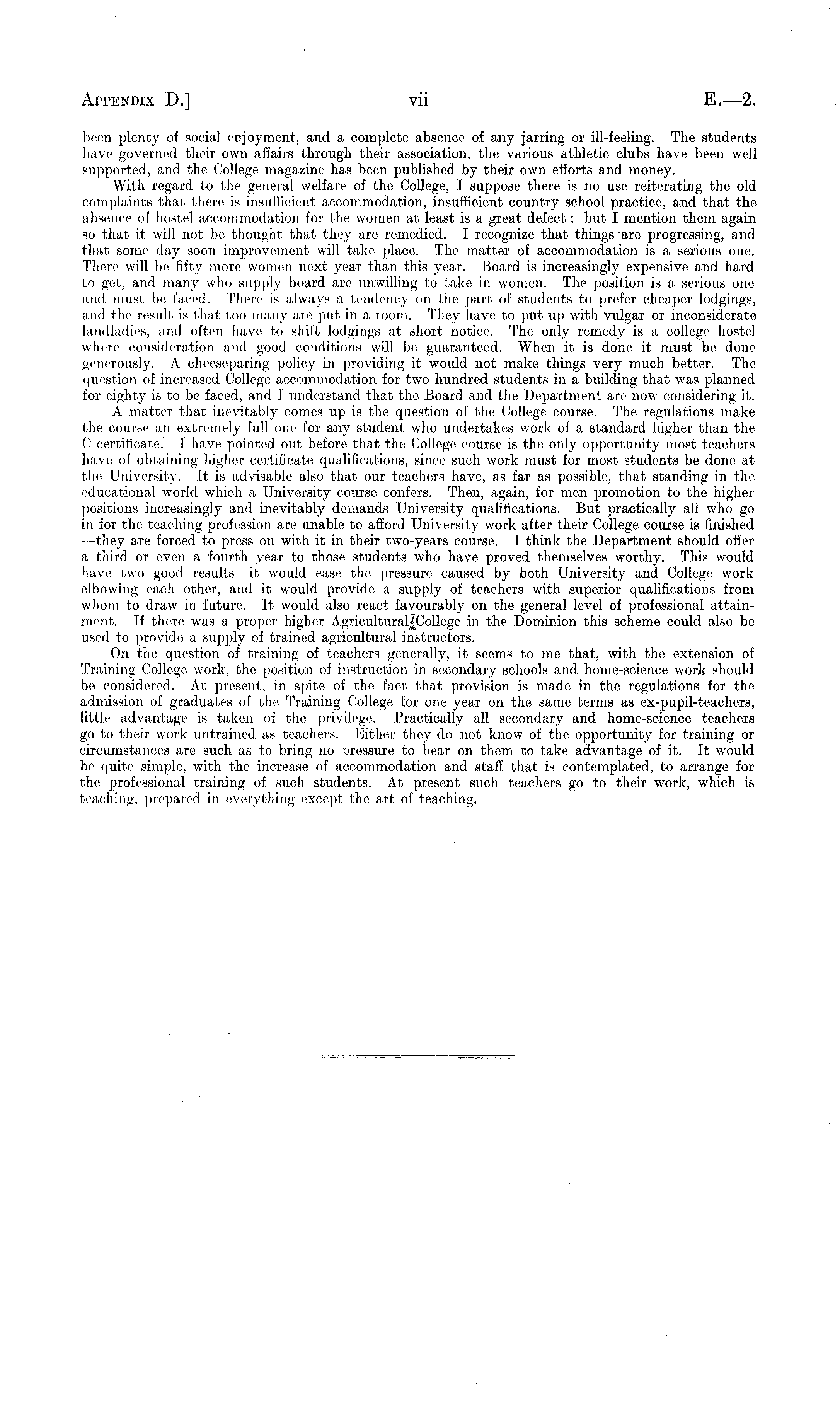 been plenty of social enjoyment, and a complete absence of any jarring or ill-feeling. The students have governed their own affairs through their association, the various athletic clubs have been well supported, and the College magazine has been published by their own efforts and money. With regard to the general welfare of the College, I suppose there is no use reiterating the old complaints that there is insufficient accommodation, insufficient country school practice, and that the absence of hostel accommodation for the women at least is a great defect: but I mention them again so that it will, not be, thought that they are remedied. I recognize that things arc progressing, and that some day soon improvement will take place. The matter of accommodation is a serious one. There will be, fifty more women next year than this year. Board is Increasingly expensive, and hard to get, and many who supply board are unwilling to take in women. The position is a serious one and must, be faced. There is always a tendency on the part of students to prefer cheaper lodgings, and the result is that too many are put in a room. They have to put up with vulgar or inconsiderate landladies, and often have to shift lodgings at short notice. The only remedy is a college hostel where consideration and good conditions will be guaranteed. When it is done it must be done generously. A cheeseparing policy in providing it would not make things very much better. The question of increased College accommodation for two hundred students in a building that was planned for eighty is to be faced, and 1 understand that the Board and the Department are now considering it. A matter that inevitably comes up is the question of the College course. The regulations make the course an extremely full one for any student who undertakes work of a standard higher than the C certificate. I have pointed out before that the College course is the only opportunity most teachers have, of obtaining higher certificate qualifications, since such work must for most students be done at the University. It is advisable also that our teachers have, as far as possible, that standing in the educational world which a University course confers. Then, again, for men promotion to the higher positions increasingly and inevitably demands University qualifications. But practically all who go in for the teaching profession are unable to afford University work after their College course is finished —they are forced to press on with it in their two-years course. I think the Department should offer a third or even a fourth year to those students who have proved themselves worthy. This would have two good results—it would ease the pressure caused by both University and College work elbowing each other, and it would provide, a supply of teachers with superior qualifications from whom to draw in future. It would also react favourably on the general level of professional attainment. If there was a proper higher Agricultural|College in the Dominion this scheme could also be used to provide: a supply of trained agricultural instructors. On the question of training of teachers generally, it seems to me that, with the extension of Training College work, the position of instruction in secondary schools and home-science work should be considered. At present, in spite, of the fact that provision is made in the regulations for the admission of graduates of the, Training College for one year on the same terms as ex-pupil-teachers, little advantage is taken of the privilege. Practically all secondary and home-science teachers go to their work untrained as teachers. Either they do not know of the opportunity for training or circumstances are such as to bring no pressure to bear on them to take, advantage of it. It would be quite simple, with the increase of accommodation and staff that is contemplated, to arrange for the professional training of such students. At present such teachers go to their work, which is teaching, prepared in everything except the art, of teaching.