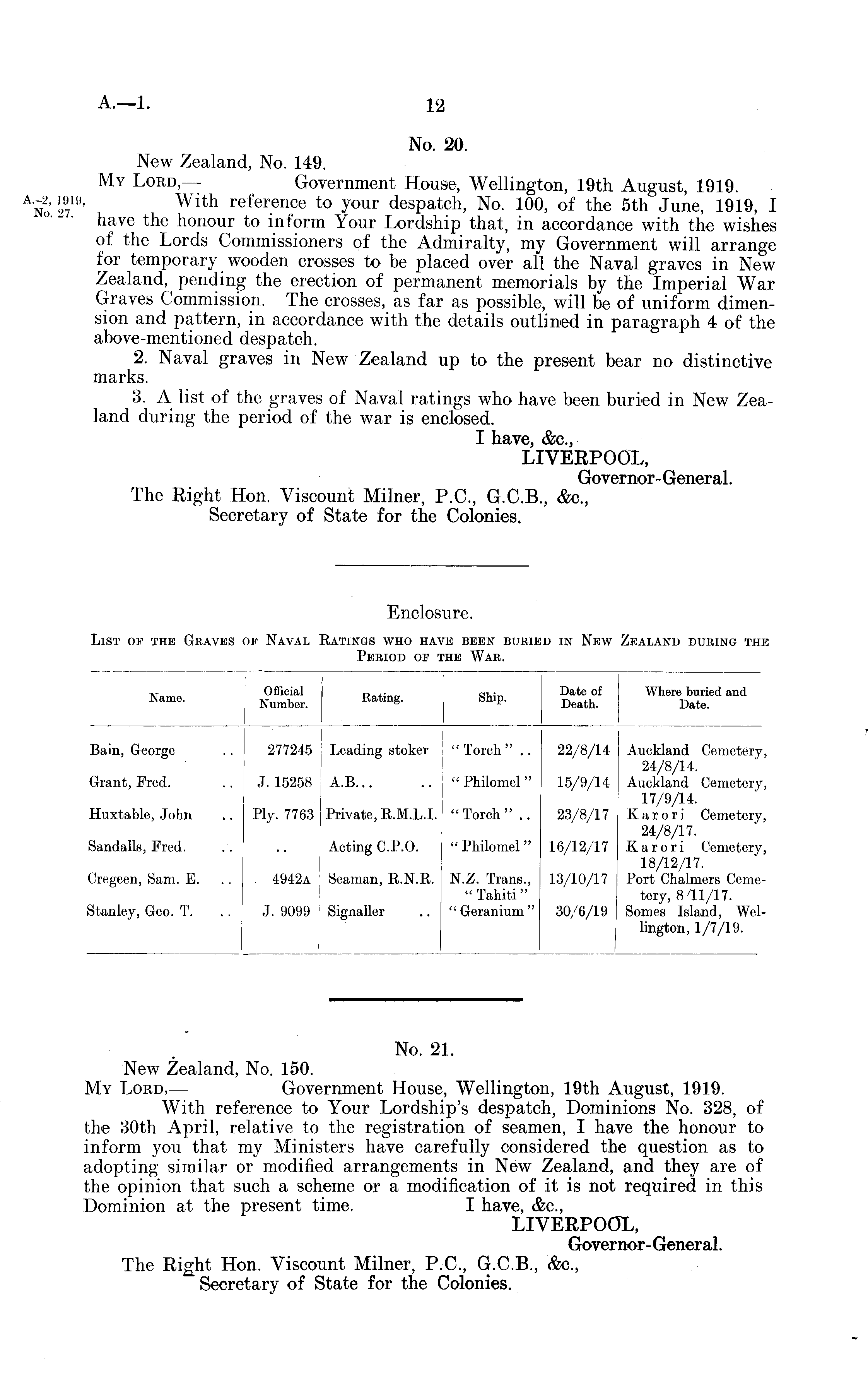 No. 20. New Zealand, No. 149. My Lord, — Government House, Wellington, 19th August, 1919. With reference to your despatch, No. 100, of the sth June, 1919, I have the honour to inform Your Lordship that, in accordance with the wishes of the Lords Commissioners of the Admiralty, my Government will arrange for temporary wooden crosses to be placed over all the Naval graves in New Zealand, pending the erection of permanent memorials by the Imperial War Graves Commission. The crosses, as far as possible, will be of uniform dimension and pattern, in accordance with the details outlined in paragraph 4 of the above-mentioned despatch. 2. Naval graves in New Zealand up to the present bear no distinctive marks. 3. A list of the graves of Naval ratings who have been buried in New Zealand during the period of the war is enclosed. I have, &c, LIVERPOOL, Governor - General. The Right Hon. Viscount Milner, P.C., G.C.8., &c, Secretary of State for the Colonies.
