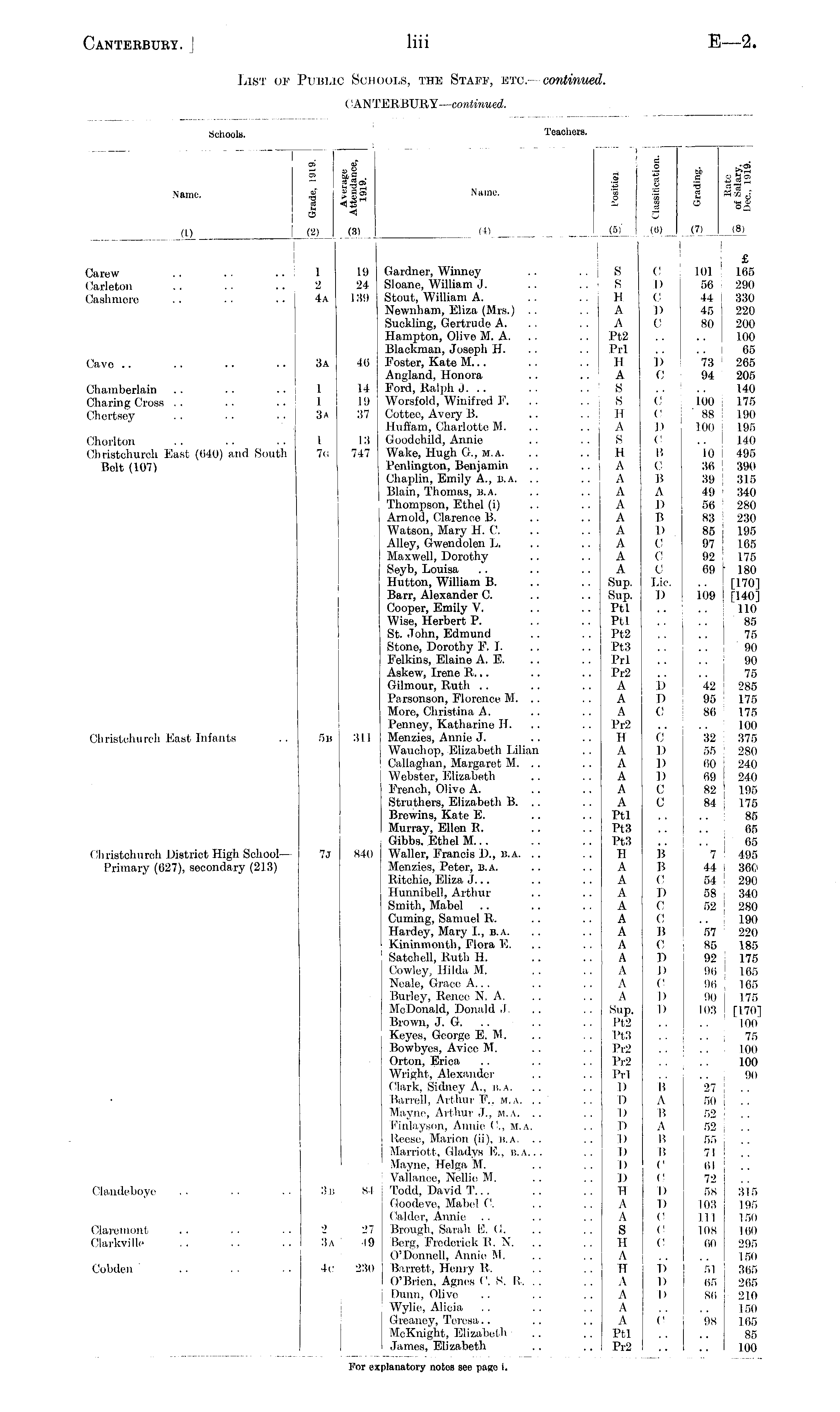 School.. Teachers. ___ X to 2 ___: . 2 -§2 .Name. £ £§2 8 "IS ei O (D. (?) (3) I i .3 Name. '(_ 11) (S)' | a 'ch •a rd ■3 Sad V 3.3. ■ (7) J 8) i Carew .. .. .. 1 19 Carleton .. .. .. 2 24 Cashmere .. •• •• 4a 139 Cavo .. .. .. •• 3a 40 Chamberlain .. .. .. 1 14 Charing Cross . . .. .. 1 19 Chertsey . . • • . • 3a 37 Chorlton .. .. .. 1 Ll Christchurch East (640) and South 70 747 Belt (107) Christclnircli East Infants Cliristchurch District High SchoolPrimary (627), secondary (213) 3a 1 1 3a 1 70 5b 40 14 I!) 37 13 747 311 Gardner, Winney .. ... S SIoane, William J. .. .. S Stout, William A. .. . . H Newnham, Eliza (Mrs.) .. .. A Suckling, Gertrude A. . . A Hampton, Olive M. A. .. .. Pt2 Blackman, Joseph H. .. .. Prl Foster, Kate M... . . .. II Angland, Honora .. .. A Ford, Ralph J. .. . . .. S Worsfold, Winifred F. .. .. S Cottee, Avery I!. .. . . II Hrrfl'am, Charlotte M. .. .. A Goodchild, Annie .. .. S Wake, Hugh G., m.a. .. .. H Penlington, Benjamin .. .. A Chaplin, Emily A., b.a. .. .. A Blain, Thomas, b.a. .. .. A Thompson, Ethel (i) .. .. A Arnold, Clarence B. . . . . A Watson, Mary H. C. .. .. A Alley, Gwendolen L. .. .. A Maxwell, Dorothy .. . . A Seyb, Louisa .. .. .. A Hutton, William B. .. . . Sup. Barr, Alexander C. .. .. Sup. Cooper, Emily V. .. .. Ptl Wise, Herbert P. .. Ptl St. John, Edmund .. .. Pt2 Stone, Dorothy F. I. .. .. Pt3 Felkins, Elaine A. E. .. .. Prl Askew, Irene R... .. .. Pr2 Gilmour, Ruth .. .. .. A Parsonson, Florence M. .. . . A More, Christina A. .. .. A Pcnney, Katharine It. .. .. Pr2 Menzies, Annie J. . . .. H Warrehop, Elizabeth Lilian .. A Callaghan, Margaret M. .. .. A Webster, Elizabeth .. .. A French, Olivo A. .. .. A Struthers, Elizabeth B. .. .. A Brewins, Kate E. .. .. Ptl Murray, Ellen It. .. .. Pt3 Gibbs. Ethel M... .. .. Pt3 Waller, Francis D., b.a. .. .. H Menzies, Peter, b.a. . . . . A Ritchie, Eliza J... .. . . A Hunnibell, Arthur .. .. A Smith, Mabel .. .. .. A Cuming, Samuel R. .. .. A Hardey, Mary I., B.A. .. .. A Kininruonth, Flora E. .. .. A Satchell, Ruth II. .. .. A Cowley, Hilda M. . . .. A Neale, Grace A.. . . . . . A Bill-ley, Itellee N. A. . . . . A McDonald, Donald.I. .. .. Sup. Brown, J. G. .. . . . . Pt2 Keycs, George E. M. .. .. PC! Bowbyes, Avice M. .. .. Pr2 Orton, Erica .. . . . . Pr2 Wright, Alexander .. .. Prl Clark. Sidney A., ii.a. . . . . I) Barrell, Arthur E.. .m.a. .. .. I) Mayne, Ail bur .1.. m.a. . . . . D Pinlayson, Annie ('.. m.a. .. D Reese, Marion (ii), ii.a. . . .. I) Marriott, Gladys E.. b.a... .. I) Mavne. Helen, M. . . . . |) Vallanoe, Nellie M. .. .. D Todd, David T... .. .. H Goodeve, Mabel C. . . . . A ('alder, Annie . . . . . . A Brough, Sarah E. G. .. . . S Berg, Frederick R.N... .. H O'Donnell. Annie M. . . . . A Barrett, Henry B. .. .. H O'Brien, Agnes C. S. It. . . .. A Dunn, Olive .. . . . . A Wylie, Alicia . . .. . . A Greaney, Teresa.. .. .. A MoKnight, Elizabeth .. ..Ptl James," Elizabeth .. .. P r 2 ilanatory notes see page i. C D 0 D c b c c c D c p. c B A D B D C c c Lie. I) b D C 6 ii D I) C (I B B 0 D C c B C D D C I) II B A B A P. i; c c II II c c c D 1) D c c D 0 D c b c c c D c p. c B A D B D C c c Lie. D 1) D C 0 II D I) C (I 1 £ 101 165 56 290 44 i 330 45 220 80 | 200 100 65 73 265 94 205 140 100 175 88 190 100 195 140 1(1 495 36 390 39 315 19 340 50 280 8,'! 230 85 j 195 97 I 105 92 ' 175 69 ' 180 .. [170] 109 [140] 110 85 75 90 90 75 42 ] 285 95 175 80 175 100 32 375 55 280 60 240 69 240 82 ! 195 84 : 175 85 65 65 7 : 495 44 I 360 54 ! 290 58 340 52 | 280 190 57 220 85 185 92 175 96 165 90 165 90 175 103 [170] 100 75 100 100 90 7J 840 B B 0 D C c B C D D C I) II Clandeboye B A B A P. i; c c II 11 c c c 27 .. 50 crt 52 ran 52 55 71 27 50 52 52 55 71 III 72 58 103 I I I los 60 01 Claremont Clarkville Cobden 3b -) 3 a 4c 81 27 ■19 230 I) 1) D 72 58 31 5 103 195 III 150 I0S 100 60 295 150 5] 365 65 265 SO 210 150 98 165 85 100 51 65 80, c 98 For c.-i
