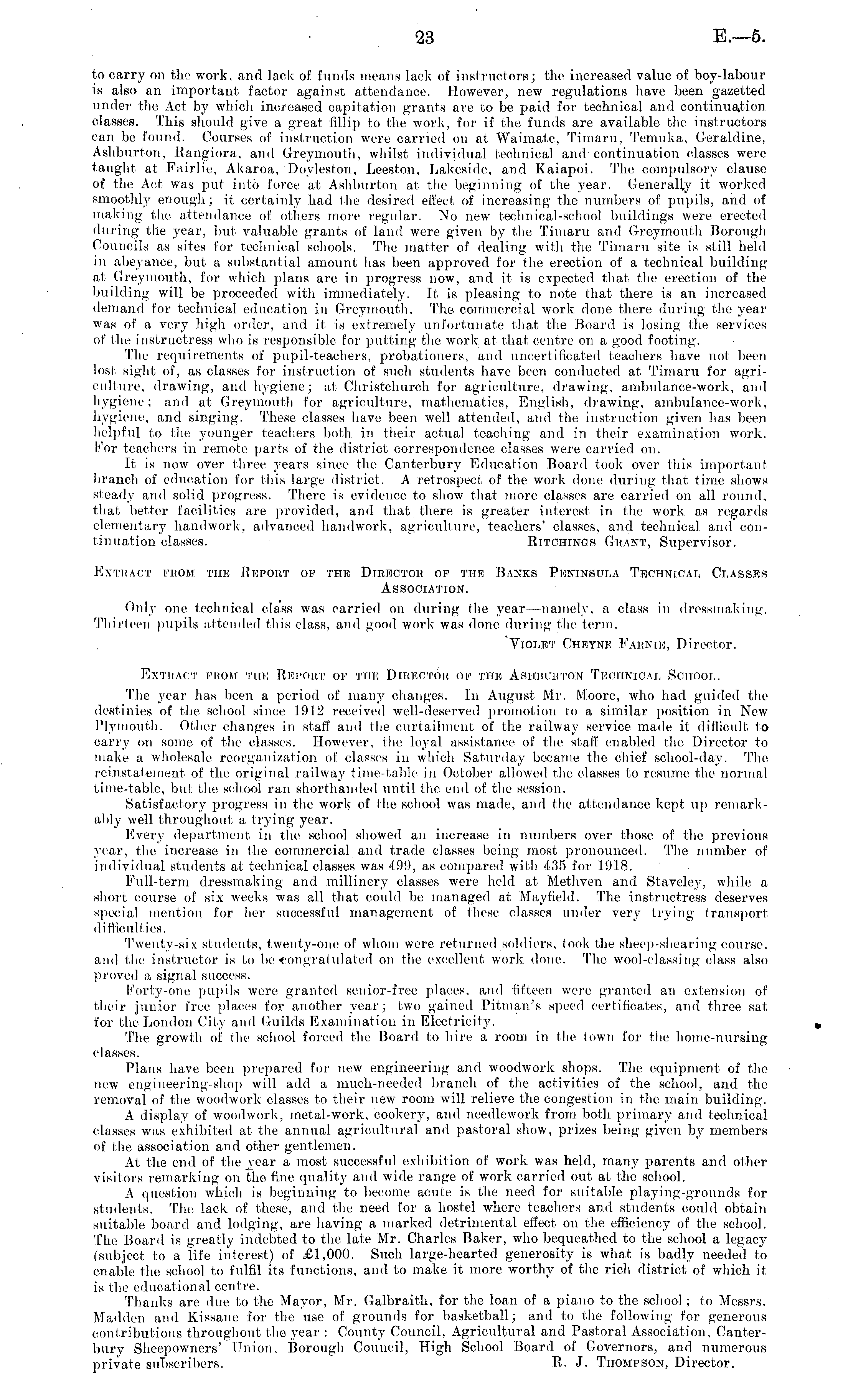 to carry on the work, and lack of funds means lack of instructors; the increased value of boy-labour is also an important factor against attendance. However, new regulations have been, gazetted under the Act by which increased capitation grants are to be paid for technical and continuation classes. This should give a great fillip to the work, for if the funds are available the instructors can be found. Courses of instruction were carried on at Waimate, Timaru, Ternuka, Geraldine, Ashburton, Rangiora, and Greymouth, whilst individual technical and continuation classes were taught at Fairlie, Akaroa, Doyleston, Leeston. Lakeside, and Kaiapoi. The compulsory clause of the Act was put into force at Ashburton at the beginning of the year. Generally it worked smoothly enough.; it certainly had the desired effect of increasing the numbers of pupils, and of making the attendance of others more regular. No new technical-school buildings were erected during the year, but valuable grants of land were given by the Timaru and Greymouth Borough Councils as sites for technical schools. The matter of dealing with the Timaru site is still held in abeyance, but a substantial amount has been approved for the erection of a technical building at Greymouth, for which plans are in progress now, and it is expected that the erection of the building will be proceeded with immediately. It is pleasing to note that there is an increased demand for technical education in Greymouth. The commercial work done there during the year was of a very high order, and it is extremely unfortunate that the Board is losing the services of the instructress who is responsible for putting the work at that centre on a good footing. The requirements of pupil-teachers, probationers, and uncertificated teachers have not been lost sight of, as classes for instruction of such students have been conducted at Timaru for agriculture, drawing, and hygiene; at Christchurch for agriculture, drawing, ambulance-work, and hygiene; and at Greymouth for agriculture, mathematics, English, drawing, ambulance-work, hygiene, and singing. These classes have been well attended, and the instruction given has been helpful to the younger teachers both in their actual teaching and in (heir examination work. For teachers in remote parts of the district correspondence classes were carried on. It is now over three years since the Canterbury Education Board took over this important branch, of education for this large district. A retrospect of the work done during that time shows steady and solid progress. There is evidence to show that more classes are carried on all round, that better facilities are provided, and that there is greater interest in the work as regards elementary handwork, advanced handwork, agriculture, teachers' classes, and technical and continuation classes. Ritchings Grant, Supervisor. Extract from the Report of the Director of the Ranks Peninsula Technical Classes Association. Only one technical class was carried on during the year —namely, a class in dressmaking, Thirteen pupils attended this class, and good work was done during the term. Violet Oheyne Farnie, Director. Extract from the Report op the Dieeotob op the Ashbubton Technical School. The year has been a period of many changes. In August Mr. .Moore, who had guided the destinies of the school since 1912 received well-deserved promotion to a similar position in New Plymouth. Other changes in staff and the curtailment of the railway- service made it difficult to carry On some of the classes. However, the loyal assistance of the staff enabled (he Director to make a wholesale reorganization of classes in which Saturday became the chief school-day. The reinstatement of the original railway time-table in October allowed the classes to resume the normal time-table, but the school ran shorthandod until the end of the session. Satisfactory progress in the work of the school was made, and (he attendance kept up remarkably well throughout a trying year. Every department in the school showed an increase in numbers over those of the previous year, the increase in the commercial and trade classes being most pronounced. The number of individual students at technical classes was 499, as compared with 435 for 1918. Full-term dressmaking and millinery classes were held at Methven. and Staveley, while a short course of six weeks was all that could be managed at Mayfield. The instructress deserves special mention for her successful management of these classes under very trying transport difficulties. Twenty-six students, twenty-one of whom were returned soldiers, took the sheep-shearing course, and the instructor is to be congratulated on the excellent work done. The wool-classing class also proved, a signal success. Forty-one pupils were granted senior-free places, a,nd fifteen were granted an extension of their junior free places for another year; two gained Pitman's speed certificates, and three sat for the London City and Guilds Examination in Electricity. The growth of the school forced the Board to hire a room in tin- town for the home-nursing classes. Plans have been prepared for new engineering and woodwork shops. The equipment of the new engineering-shop will add a much-needed branch of the activities of the school, and the removal of the woodwork classes to their new room will relieve the congestion in the main building. A display of woodwork, metal-work, cookery, and needlework from both primary and technical classes was exhibited at the annual agricultural and pastoral show, prizes being given by members of the association and other gentlemen. At the end of the year a most successful exhibition of work was held, many parents and other visitors remarking on the fine quality and wide range of work carried out at the school. A question which is beginning to become acute is the need for suitable playing-grounds for students. The lack of these, and the need for a hostel where teachers and studen