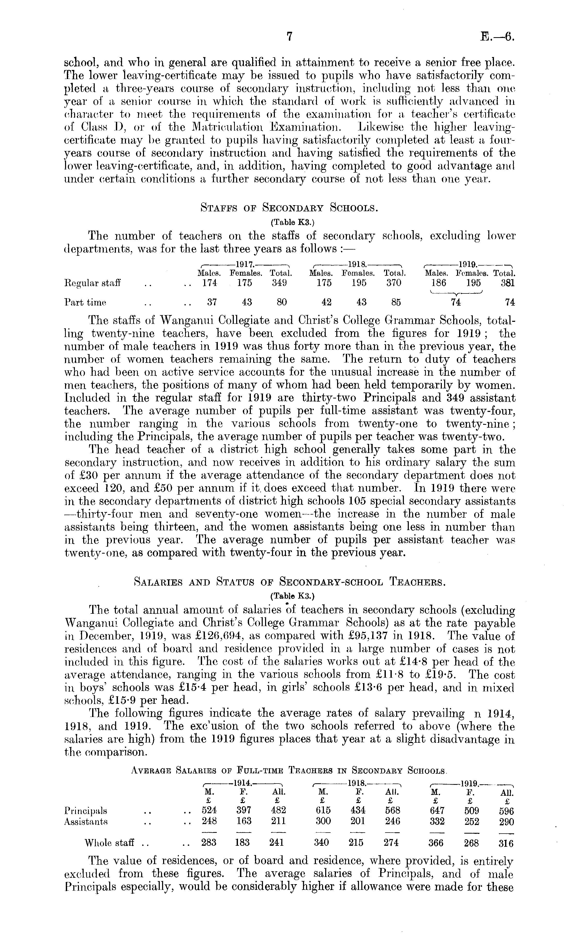 school, and who in general are qualified in attainment to receive a senior free place. The lower leaving-certificate may be issued to pupils who have satisfactorily completed a three-years course of secondary instruction, including not less than one year of a senior course in which the standard of work is sufficiently advanced in character to meet the requirements of the examination for a teacher's certificate of Class D, or of the Matriculation Examination. Likewise the higher leavingcertificate may be granted to pupils having satisfactorily completed at least a fouryears course of secondary instruction and having satisfied the requirements of the lower leaving-certificate, and, in addition, having completed to good advantage and under certain conditions a further secondary course of not less than one year. Staffs of Secondary Schools. (Table K3.) The number of teachers on the staffs of secondary schools, excluding lower departments, was for the last three years as follows : — , 1917. i, , 1918. 1 , 1919. , Males. Females. Total. Males. Females. Tola). Males. Females. Total. Regular staff .. ..174 175 349 175 195 370 186 195 381 Part time .. ..37 43 80 42 43 85 74 74 The staffs of Wanganui Collegiate and Christ's College Grammar Schools, totalling twenty-nine teachers, have been excluded from the figures for 1919 ; the number of male teachers in 1919 was thus forty more than in the previous year, the number of women teachers remaining the same. The return to duty of teachers who had been on active service accounts for the unusual increase in the number of men teachers, the positions of many of whom had been held temporarily by women. Included in the regular staff for 1919 are thirty-two Principals and 349 assistant teachers. The average number of pupils per full-time assistant was twenty-four, the number ranging in the various schools from twenty-one to twenty-nine; including the Principals, the average number of pupils per teacher was twenty-two. The head teacher of a district high school generally takes some part in the secondary instruction, and now receives in addition to his ordinary salary the sum of £30 per annum if the average attendance of the secondary department does not exceed 120, and £50 per annum if it. does exceed that number. In 1919 there were in the secondary departments of district high schools 105 special secondary assistants —thirty-four men and seventy-one women-—the increase in the number of male assistants being thirteen, and the women assistants being one less in number than in the previous year. The average number of pupils per assistant teacher was twenty-one, as compared with twenty-four in the previous year. Salaries and Status of Secondary-school Teachers. (Table K3.) The total annual amount of salaries of teachers in secondary schools (excluding Wanganui. Collegiate and Christ's College Grammar Schools) as at the rate payable in December, 1919, was £126,694, as compared with £95,137 in 1918. The value of residences and of board and residence provided in a large number of cases is not included in this figure. The cost of the salaries works out at £14*8 per head of the average attendance, ranging in the various schools from £11-8 to £19-5. The cost in boys' schools was £15-4 per head, in girls' schools £13-6 per head, and in mixed schools, £15-9 per head. The following figures indicate the average rates of salary prevailing n 1914, 1918, and 1919. The exc'usion of the two schools referred to above (where the salaries are high) from the 1919 figures places that year at a slight disadvantage in the comparison. Average Salaries of Full-time Teachers in Secondary Schools , —1914.- , 1918. , , 1919. , M. F, All. M. F. All. M. F. All. £ £ £ £££ £££ Principals .. .. 524 397 482 615 434 568 647 509 596 Assistants .. ..248 163 211 300 201 246 332 252 290 Whole staff .. .. 283 183 241 340 215 274 366 268 316 The value of residences, or of board and residence, where provided, is entirely excluded from these figures. The average salaries of Principals, and of male Principals especially, would be considerably higher if allowance were made for these