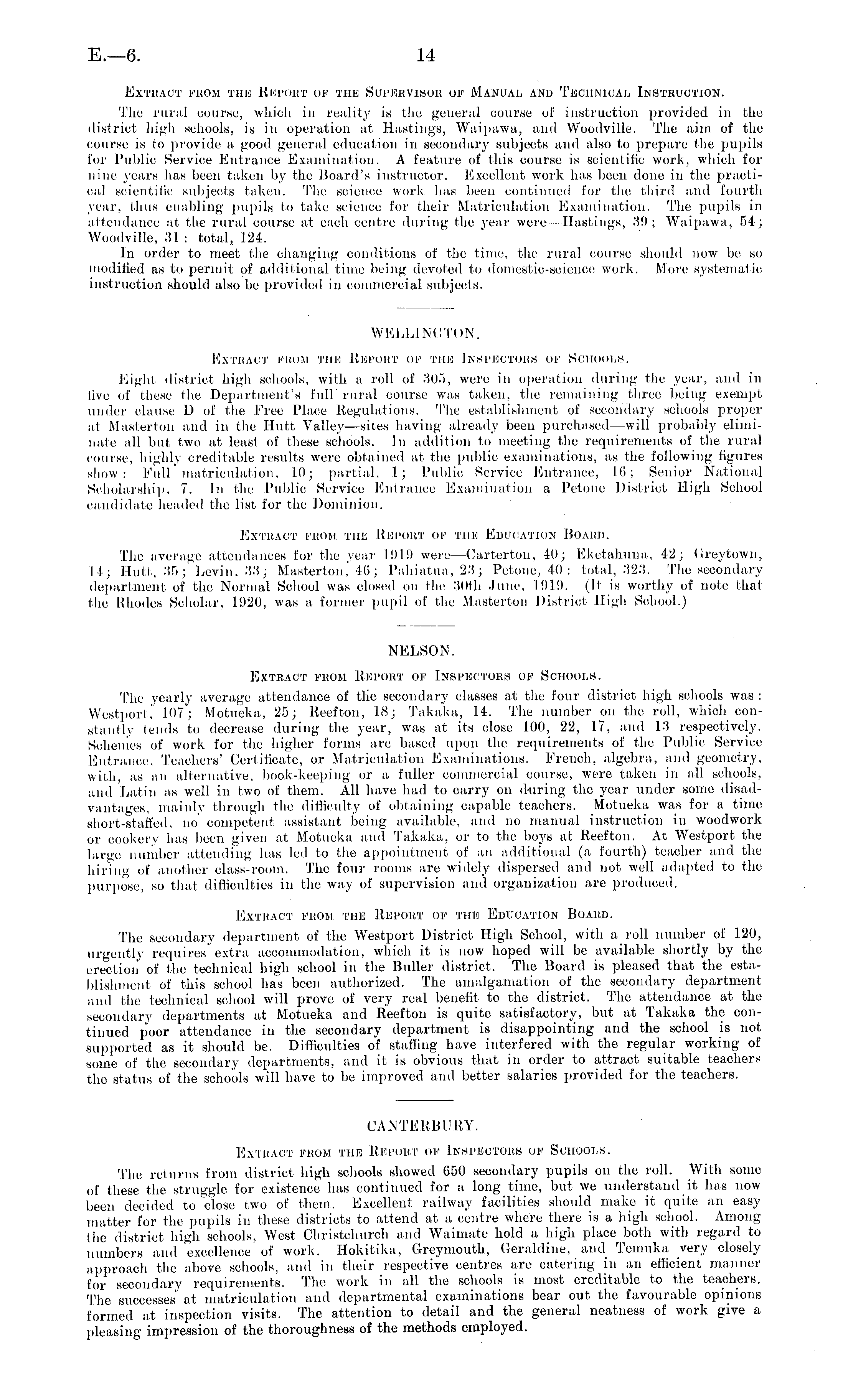 Extract from the Report of the Supervisor of Manual and Technical Instruction. The rural oourse, which in reality is the general course of instruction jjrovided in the district high schools, is in operation at Hastings, Waipawa, and Woodville. The aim of the course is to provide a good general education in secondary subjects and also to prepare (he pupils for Public Service Entrance Examination. A feature of this course is scientific work, which for nine years has been taken by the Board's instructor. Excellent work has been done in the practical scientific subjects taken. The science work lias been continued for the third and fourth year, thus enabling pupils to take science for their Matriculation Examination. The pupils in attendance at the rural course at each centre during the year were —Hastings, 39; Waipawa, 54; Woodville, ;S1 : total, 124. In order to meet the changing conditions of the time, the rural course should now be so modified as to permit of additional lime being devoted to domestic-science work. More systematic instruction should also be provided in commercial subjects. WELLINGTON. Extract fiioji the Report of the Inspectors (if Schools. Eight district high schools, with a roll of 305, were in operation during the year, and in live of These the Department's full rural course was taken, the remaining three being exempt under clause 1) of the Free Place Regulations. The establishment of secondary schools proper at Masterton and in the Hutt Valle\—sites having already been purchased —will probably eliminate all but two at least of these schools. In addition to meeting the requirements of the rural course, highly creditable results were obtained at the public examinations, as the following figures show: Full matriculation, 10; partial. I ; Public Service Entrance, I(i ; Senior National Scholarship, 7. In the Public Service Entrance Examination a, Petoue District High. Seliool candidate headed the list for the Dominion. Extract from the Report ok the Education Hoamt. The average attendances for the year ID I!) were—Carterton, 40; Eketahuna, 42; (ireytown, 14; Hutt, 35; Levin, 33; Masterton,' 40; I'ahiatua, 2.'!; Petone, 40 : total, 323. The secondary department of the Normal School was closed on the 30th June, 1919. (It is worthy of note that the Rhodes Scholar, l!)20, was a former pupil of the Masterton District High School.) NELSON. Extract from Report ok [nbpeotors of Schools. The yearly average attendance of tlie secondary classes at the four district high schools was : Westport,' LOT; Motueka, 25; Reefton, 18; Takaka, 14, The number on the roll, which constantly tends to decrease during the year, was at its close LOO, 22, 17, and 13 respectively. Schemes of work for the higher forms are based upon the requirements of the Public Service Entrance, Teachers' Certificate, or Matriculation Examinations. French, algebra, and geometry, with, as an alternative, book-keeping or a fuller commercial course, were taken in all schools. and Latin as well in two of them. All have had to carry on during the year under some disadvantages, mainly through the difficulty of obtaining capable teachers. Motueka was for a time short-staffed, no competent assistant being available, and no manual instruction in woodwork or cookery has been given at Motueka and Takaka, or to the boys al Reefton. At Westport the large number attending has led to the appointment of an additional (a fourth) teacher and the hiring of another class-room. The four rooms are widely dispersed and not well adapted to the purpose, so that difficulties in the way of supervision and organization are produced. Extract from run Report ok the Education Board. The secondary department of the Westport District High School, with a roll number of 120, urgently requires extra accommodation, which it is now hoped will be available shortly by the erection of the technical high school in the Buller district. The Board is pleased that the establishment of this school has been authorized. The amalgamation of the secondary department and the technical school will prove of very real benefit to the district. The attendance at the secondary departments at Motueka and Reefton is quite satisfactory, but at Takaka the continued poor attendance in the secondary department is disappointing and the school is not supported as it should be. Difficulties of staffing have interfered with the regular working of some of the secondary departments, and it is obvious that in order to attract suitable teachers the status of the schools will have to be improved and better salaries provided for the teachers. CANTERBURY. Extract from the Report ok Inspectors of Schools. The returns from district high schools showed 650 secondary pupils on the roll. With some of these the struggle for existence has continued for a long time, but we understand it has now been decided to close two of them. Excellent railway facilities should make it quite an easymatter for the pupils in these districts to attend at a, centre where there is a high school. Among the district high schools, West Christchurch and Wainiate hold a high place both with regard to numbers and excellence of work. Hokitika, Greymouth, Geraldine, and Temuka very closely approach the above schools, and in their respective centres are catering in an efficient manner for secondary requirements. The work in all the schools is most creditable to the teachers. The successes at matriculation and departmental examinations bear out, the favourable opinions formed at inspection visits. The attention to detail and the general neatness of work give a pleasing impression of the thoroughness of the methods employed.