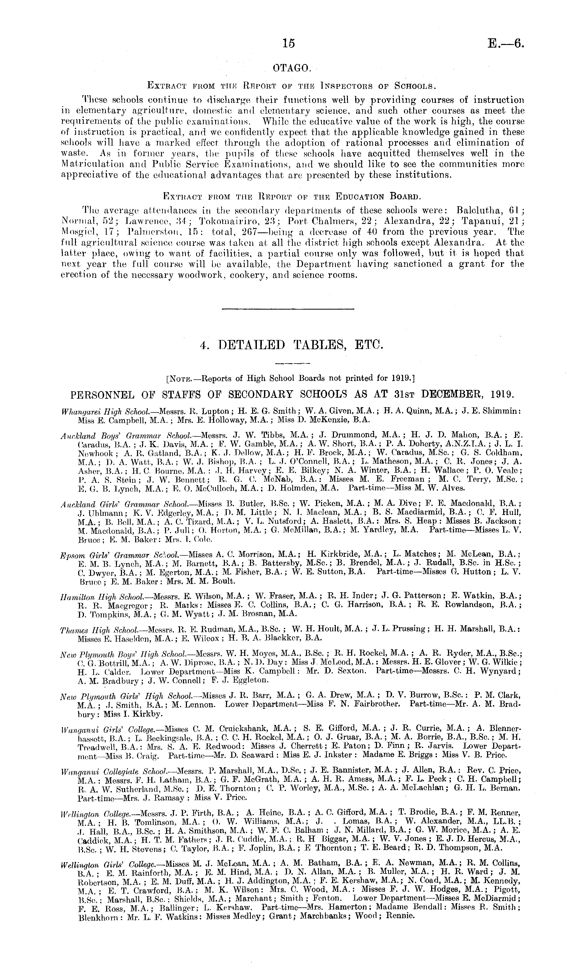 4. DETAILED TABLES, ETC. [Note. —Reports of High School Boards not printed for 1919.] PERSONNEL OF STAFFS OF SECONDARY SCHOOLS AS AT 31st DECEMBER, 1919. Whangarei High School. —Messrs. R. Lupton; H. E. G. Smith; W. A. Given, M.A.; H. A. Quinn, M.A.; J. E. Shimmin: Miss E. Campbell, M.A. ; Mrs. E. Holloway, M.A.; Miss D. McKonzie, B.A. Auckland Boys , Grammar School. —Messrs. J. W. Tibbs, M.A. ; J. Drummond, M.A. ; H. J. D. Malion, B.A. ; E. Caradus, B,A. ;J. K. Davis, M.A. ; F. W. Gamble, M.A.; A. W. Short, 8.A.; P. A. Dohcrty, A.N.Z.T.A. ;J.L. I. Ncwhook ;A. R. Gatland, 8.A.; K. J. Bellow, M.A.; H. F. Brock, M.A.; W. Caradus, M.Sc.; G. S. Coldham, M.A.; I). A. Watt, 8.A.; W. J. Bishop, B.A. ;L. J. O'Oonncll, 8.A.; L, Matheson, M.A. ;C. R. Jones; J. A. Asher, 8.A.; H. C. Bourne, M.A. :J. H. Harvey; E. E. Bilkey; N. A. Winter, B.A. ;H. Wallace ;P. 0. Veale; P. A. S. Stein; J. W. Bennett; R. G. C. 'McNab, B.A.:' Misses M. E. Freeman; M. 0, Terry, M.Sc; E. G. B, Lynch, M.A.; E. 0. MoOuUooh, M.A.; I). Holmden, M.A. Part-time—Miss M. W. Alves. Auckland Girls' Grammar School. —Misses B. Butler, B.Sc. ; W. Pickcn, M.A. ; M. A. Dive; F. E, Macdonald, 8.A.; J. Uhlmann; K. V. Edgerley, M.A.; l>. M. Little; N. I. Maclean, M.A.; B. S. Maodiarmid, 8.A.; (!. F. Hull, M.A.; B. Bell, M.A.; A. C. Tizard, M.A.; V. L. Nutsford ; A. Haslctt, 8.A.: Mrs. S. Heap : Misses B. Jackson; M. Macdonald, 8.A.; P. Jull; 0. Horton, M.A. ;G. McMillan, 8.A.; M. Yardloy, M.A. Part-time —Misses L. V. Bruce; E. M. Baker: Mrs. I. Colo. Epsom Girls' Grammar School. —Misses A. C. Morrison, M.A.; H. Kirkbride, M.A.; L. Matches; M. McLean, 8.A.; E. M. B. Lynch, M.A.; M. Barnett, 8.A.; B. Battersby, M.Sc; B. Brendel, M.A.; J. Rudall, B.Sc. in H.Sc. ; C. Dwyer, 8.A.; M. Egerton, M.A.; M. Fisher, 8.A.; W. E. Sutton, B.A. Part-time—Misses G. Hutton ; L. V. Bruce ; E. M. Baker : Mrs. M. M. Boult. Hamilton High School. —Messrs. E. Wilson, M.A. ; W. Fraser, M.A. ; R. H. Inder; J. G. Patterson; E. Watkin, 8.A.; R. R. Macgregor; R. Maiks: Misses E. 0. Collins, 8.A.; 0. Or. Harrison, B.A. ; R. E. Rowlandson, B.A. ; D. Tompkins, M.A.; G. M. Wyatt; J. M. Brosnan, M.A. Thames High School. —Messrs. R. E. Rudman, M.A., B.Sc. ; W. H. Hoult, M.A. ; J. L. Pressing ; H. H. Marshall, 8.A.: Missea'K Haselden, M.A.; E. Wilcox ;H. B. A. Blaokkcr, B.A. New Plymouth Boys' High School. —Messrs. W. H. Moyos, M.A., B.Sc. ; R. H. Rockel, M.A. ; A. R. Ryder, M.A., B.Sc; 0. G. BottriU, M.A.; A. W. Diprose, 8.A.; N. D. Day : Miss J. MoLeod, M.A.: Messrs. H. E. Glover ;W. G. Wilkic ; H. L. Calder. Lower Department—Miss K. Campbell: Mr. D. Sexton. Part-time —Messrs. C. H. Wynyard; A. M. Bradbury ;J. W. Connell; F. J. Eggleton. New Plymouth Girls' High School. —Misses J. R. Barr, M.A. ; G. A. Drew, M.A. ; D. V. Burrow, B.Sc : P. M. Clark, M.A. ; J. Smith, 8.A.; M. Lennon. Lower Department —Miss F. N. Fairbrother. Part-time —Mr. A. M. Bradbury : Miss I. Kirkby. Wanqanui Girls' College.— Misses C. M. Cruiekshank, M.A. ; S. E. Gifford, M.A. ; J. R. Currie, M.A. ; A. Blennerhassett, 8.A.; L. Beckingeale, B.A. ;C.C. H. Rockel, M.A.; 0. J. Gruar, 8.A.; M. A. Borrie, 8.A., B.Sc ; M. H. Treadwell, 8.A.: Mrs. S. A. E. Redwood: Misses J. Cherrett; E. Paton; D. Finn ; R. Jarvis. Lower Department Miss B. Craig. Part-time —Mr. D. Seaward : Miss E. J. Inkster : Madame E. Briggs : Miss V. B. Price. Wanganui Collegiate School. —Messrs. P. Marshall, M.A., D.Sc. ;J. E. Bannister, M.A. ;J. Allen, 8.A.: Rev. C. Price, M.A.: Messrs. F. H. Latham, 8.A.; G. F. McGrath, M.A. ;A.H. R. Amess, M.A. ; F. L. Peck; C. H. Campbell; R. A.W. Sutherland, M.Sc.; D. E. Thornton; 0. P. Worley, M.A., M.So. ;A. A. McLaohlan ; G. H. L. Bernan. Part-time—Mrs. J. Ramsay : Miss V. Price. Wdlington College.— -Messrs. J. P. Firth, B.A. ; A. Heine, B.A. ; A. 0. Gifford, M.A. ;T. Brodie, 8.A.; F. M. Renner, MA • H. B. Tomlinson, M.A. ; (). W. Williams, M.A.; J. . Lomas, B.A. ; W. Alexander, M.A., LL.B. ; J. Hall, 8.A., B.Sc ; H. A. Smithson, M.A. ; W. F. C. Balham ; J. N. Millard, 8.A.; G. W. Moricc, M.A.; A. E. Caddick, M.A.; H. T. M. Fathers; J. R. Cuddie, M.A.; R. H Biggar, M.A. ; W. V. Jones ; E. J. D. Hercus, M.A., B.Sc. ;W. H. Stevens; C. Taylor, 8.A.; F. Joplin, 8.A.; E Thornton; T. E. Beard; R. D. Thompson, M.A. Wellington Girls' College.— Misses M. J. McLean, M.A. ; A. M. Batham, B.A. ; E. A. Newman, M.A.; R. M. Collins, B.A. ; E. M. Rainforth, M.A. ; E. M. Hind, M.A. ; D. N. Allan, M.A. ; B. Muller, M.A. ; H. R. Ward; J. M. Robertson, M.A. ; E. M. Duff, M.A. ; H. J. Addington, M.A. ;F. E. Kershaw, M.A.; N. Coad, M.A.; M. Kennedy, M.A. ; E.'t. Crawford, 8.A.; M. K. Wilson: Mis. C. Wood, M.A.: Misses F. J. W. Hodges, M.A.; Pigott, B.Sc.'; Marshall, B.Sc : Shields, M.A.; Marchant; Smith; Fenton. Lowor Department—Misses E. McDiarmid; F. E.'Ross, M.A.; Ballinger; L. Kershaw. Part-time —Mrs. Hamerton; Madame Bendall: Misses R. Smith; BlenkhomiMr. L. F. Watkins: Misses Medley; Grant; March banks; Wood; Rennie.