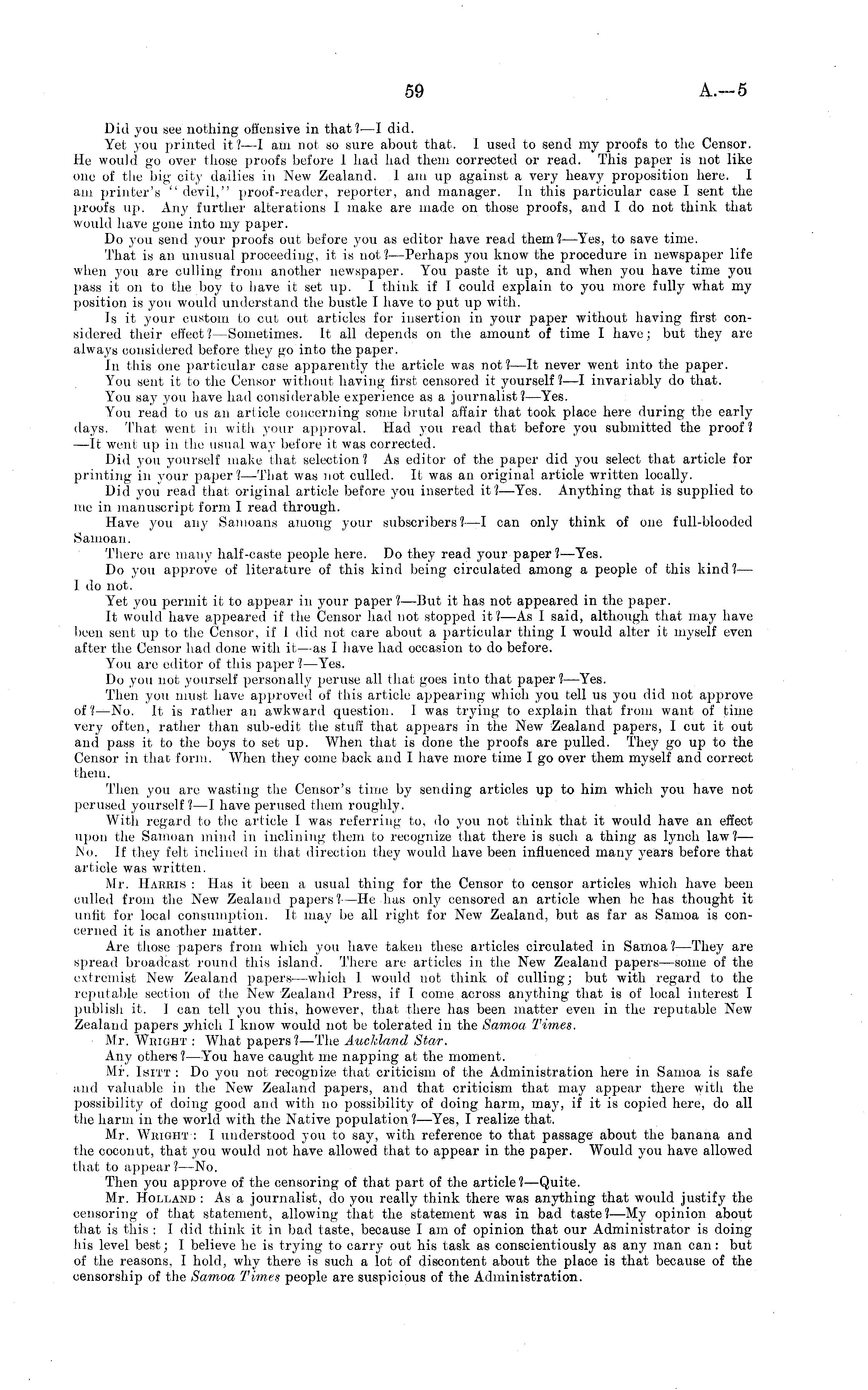 Did you see nothing offensive in that? —I did. Yet you printed it?—l am not so sure about that. I used to send my proofs to the Censor. He would go over those proofs before 1 had had them corrected or read. This paper is not like one of the big city dailies in New Zealand. I am up against a very heavy proposition here. I am printer's " devil," proof-reader, reporter, and manager. In this particular case I sent the proofs up. Any further alterations I make are made on those proofs, and I do not think that would have gone into my paper. Do you send your proofs out before you as editor have read them? —Yes, to save time. That is an unusual proceeding, it is not? —Perhaps you know the procedure in newspaper life when you are culling from another newspaper. You paste it up, and when you have time you pass it on to the boy to have it set up. I think if I could explain to you more fully what my position is you would understand the bustle I have to put up with. Is it your custom to cut out articles for insertion in your paper without having first considered their effect? —Sometimes. It all depends on the amount of time I have; but they are always considered before they go into the paper. In this one particular case apparently (lie article was not?—lt never went into the paper. You sent it to the Censor without having first censored it yourself ?—I invariably do that. You say you have had considerable experience as a journalist? —Yes. You read to us an article concerning some brutal affair that took place here during the early days. That went in with your approval. Had you read that before you submitted the proof? —It went up in the usual way before it was corrected. Did you yourself make that selection? As editor of the paper did you select that article for printing in your paper?— That was not culled. It was an original article written locally. Did you read that original article before you inserted it?— Yes. Anything that is supplied to me in manuscript form I read through. Have you any Samoans among your subscribers? —I can only think of one full-blooded Samoan. There are many half-caste people here. Do they read your paper?— Yes. Do you approve of literature of this kind being circulated among a people of this kind?— I do not. Yet you permit it to appear in your paper?— But it has not appeared in the paper. It would have appeared if the Censor had not stopped it?—As I said, although that may have been sent up to the Censor, if I did not care about a particular thing I would alter it myself even after the Censor had done with it —as I have had occasion to do before. You are editor of this paper ?—Yes. Do you not yourself personally peruse all that goes into that paper?— Yes. Then you must have approved of this article appearing which you tell us you did not approve of?— No. It is rather an awkward question. I was trying to explain that from want of time very often, rather than sub-edit the stuff that appears in the New Zealand papers, I cut it out and pass it to the boys to set up. When that is done the proofs are pulled. They go up to the Censor in that form. When they come back and I have more time Igo over them myself and correct them. Then you are wasting the Censor's time by sending articles up to him which you have not perused yourself? —I have perused them roughly. With regard to the article I was referring to, do you not think that it would have an effect upon the Samoan mind in inclining them to recognize that there is such a thing as lynch law? — No, If they felt inclined in that direction they would have been influenced many years before that article was written. Mr. Harris : Has it been a usual thing for the Censor to censor articles which have been culled from the New Zealand papers? —He has only censored an article when he has thought it unfit for local consumption. It may be all right for New Zealand, but as far as Samoa is concerned it is another matter. Are those papers from which you have taken these articles circulated in Samoa?— They are spread broadcast round this island. There are articles in the New Zealand papers —some of the extremist New Zealand papers—which 1 would not think of culling; but with regard to the reputable section of the New Zealand Press, if I come across anything that is of local interest I publish it. I can tell you this, however, that there has been matter even in the reputable New Zealand papers .which I know would not be tolerated in the Samoa Times. Mr. Wright : What papers?— The Auckland Star. Any others ? —You have caught me napping at the moment. Mr. Isitt :Do j r ou not recognize that criticism of the Administration here in Samoa is safe and valuable in the New Zealand papers, and that criticism that may appear there with the possibility of doing good and with no possibility of doing harm, may, if it is copied here, do all the harm in the world with the Native population?— Yes, I realize that. Mr. Wright : I understood you to say, with reference to that passage about the banana and the coconut, that you would not have allowed that to appear in the paper. Would you have allowed that to appear?— No. Then you approve of the censoring of that part of the article? —Quite. Mr. Holland : As a journalist, do you really think there was anything that would justify the censoring of that statement, allowing that the statement was in bad taste?—My opinion about that is this : I did think it in bad taste, because I am of opinion that our Administrator is doing his level best; I believe he is trying to carry out his task as conscientiously as any man can: but of the reasons, I hold, why there is such a lot of discontent about the place is that because of the censorship of the Samoa Times people are suspicious of the Administration.