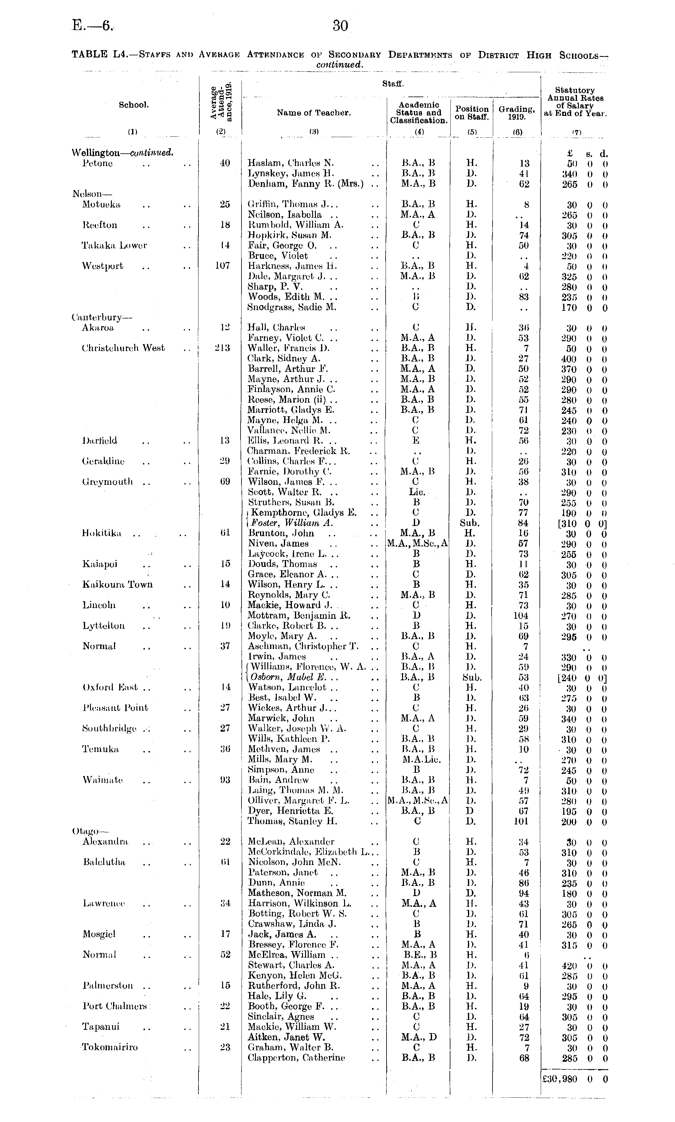School. (1) <D '3 OH d fl-H (2) Name of Teacher. Staff. Academic Status and Classification. (4) Position Grading, on Staff. 1919. (5) (6) Statutory Annual Rates of Salary at End of Year. _0H 17) Wellington— continued. Petone 40 Haslam, Charles N. Lynskey, James H. Denham, Fanny R. (Mrs.) .. B.A., II B.A., B M.A., B H. 13 D. 41 D. 02 £ s. d. 50 0 0 340 0 0 265 0 0 Nelson— Motueka 25 < triffin, Thomas J... Neilson, Isabella Rum hold, William A. Hopkirk, Susan M. Fair, George 0. . . Bruce, Violet Harkncss, James ll. Dale, Margaret .1. .. Sharp, P. V. Woods, Edith M. .. Snodgrass, Sadie M. B.A., B M.A., A C B.A., li C H. 8 I). H. 14 I). 74 11. 50 1). II. 4 I). 62 D. I). 83 D. 30 0 0 205 0 0 30 0 0 305 0 0 30 0 0 22(1 0 0 50 0 0 325 0 0 280 0 0 235 0 0 170 0 0 Reefton 18 Takaka Lower 14 Wostnort 107 B.A., li M.A., li Canterbury— Akaroa 12 ii C Christchurch West Darfiold Geraldine Greymouth .. Hokitika .. Kaiapoi 213 13 29 09 01 15 12 213 13 29 69 01 15 14 Hall, Charles Farney, Violet ('. .. Waller. Francis I). Clark, Sidney A. Barrel!, Arthur F. Mayor, Arthur .1. . . Finlayson, Annie ('. Reese, Marion (ii) Marriott, Gladys E. Mavnc. Ilelga M. Vallance, Nellie M. Ellis, Leonard R. . . Charman, Frederick R. Collins, Charles F.. . Farnie, Dorothy C. Wilson, .lames F. Scott, Walter R. .. Struthers, Susan Ii. I Kempthorne, Gladys E. i foster, William A. liruuton, John Niven, James Laycock, I rem- L. . . Douds, Thomas Grace, Eleanor A. .. Wilson, Henry L. . . Reynolds, Mary C. Mackie, Howard J. Mottram, Benjamin R. Clarke, Robert B. .. Moyle, Mary A. Aschman, Christopher T. Irwin, James (Williams, Florence, W. A. .. ( Osborn, Mabel E. .. Watson, Lancelot Best. Isabel W. .. Wickes, Arthur J... Marwick, John Walker. Joseph W. A. Wills, Kathleen P. Methven, James Mills. Mary M. Simpson, Anne Bain, Andrew Luing, Thomas M. M. Olliver, Margaret F. L. Dyer, Henrietta E. Thomas, Stanley H. C M.A., A B.A., B B.A., 11 M.A., A M.A., ii M.A., A li.A., B B.A., B C c E C M.A., li C Lie. B C I) M.A., li M.A.,M.Sc.,A ii B C li M.A., 11 C I) li B.A., li C H.A., A B.A., B B.A., 11 C B c M.A., A C li.A., li li.A., li M.A.Lic. 15 B.A., B B.A., B M.A.,M.Sc.,A B.A., B C II. 30 !>. 53 H. 7 I). 27 D. 50 I). 52 I). 52 I). 55 I). 71 I). 01 1). 72 H. 50 I). II. 20 1). 50 II. 38 I). I). 70 D. 77 Sub. 84 H. 16 I). 57 I). 73 II. II D. 02 H. 35 I). 71 H. 73 I). 104 II. 15 I). 09 II. 7 D. 24 I). 59 Sub. 53 11. -10 I). 63 II. 20 1). 59 H. 2!) I). 58 H. 10 I). I). 72 II. 7 D. 49 I). 57 1) 67 D. 101 30 0 0 290 0 0 50 0 (I 400 0 0 370 0 0 290 0 0 290 0 0 280 0 0 245 0 0 240 0 0 230 0 0 30 0 0 220 0 0 30 0 0 310 0 0 30 0 0 290 0 0 255 0 0 190 0 0 [310 0 OJ 30 0 0 290 0 0 255 0 0 30 0 0 305 0 0 30 0 0 285 0 0 30 0 0 270 0 0 30 0 (I 295 0 0 Kaikoura Town 14 Lincoln 10 10 Lyttelton 19 19 Normal 37 37 330 0 0 290 0 0 [240 0 0] 30 0 0 275 0 (I 30 0 0 340 0 0 30 0 0 310 0 0 30 0 0 270 0 0 245 0 0 50 0 I) 310 0 0 280 0 0 195 0 0 200 0 0 Oxford East .. 14 14 Pleasant Point 27 27 Sotithbridge .. 27 27 Tena-uka 36 36 Waimate 93 93 Otago— Alexandra 22 Balolutha Lawrence Mosgiel Normal 01 34 17 52 22 01 34 17 52 McLean, Alexander McCorkindale, Elizabeth L... Nicolson, John McN. r?aterson, Janet Dunn, Annie Matheson, Norman M. Harrison, Wilkinson L. Hotting, Robert W. S. Crnwshaw, Linda J. Jack, James A. Bressey, Florence F. McElrea, William Stewart. ('halies A. Kenyon, Helen McG. Rutherford, John R. Hale, Lily G. Booth, George F. Sinclair, Agnes Mackie, William W. Aitken, Janet W. Graham, Walter B. Clapperton, Catherine C Ii C M.A., li B.A., II I) M.A., A C li li M.A., A B.E., H M.A., A B.A., B M.A., A B.A., B li.A., B C C M.A., D C B.A., B II. 34 I). 53 11. 7 I). 46 I). 86 D. 94 11. 43 1). (il I). 71 II. 40 I). 41 II. 0 D. 11 I). (il II. 9 I). 04 II. 19 !). 04 II. 27 I). 72 II. 7 I). 68 .10 0 0 310 0 0 30 0 0 310 0 0 235 0 0 180 0 0 30 0 0 305 0 0 265 0 0 30 0 0 315 0 0 Palmerston . . Port Chalmers 15 22 15 22 420 0 0 285 0 0 30 0 0 295 0 0 30 0 0 305 0 0 30 0 0 305 0 0 30 0 0 285 0 0 Tapanui 21 21 Tokomairiro 23 23 £30,980 0 0