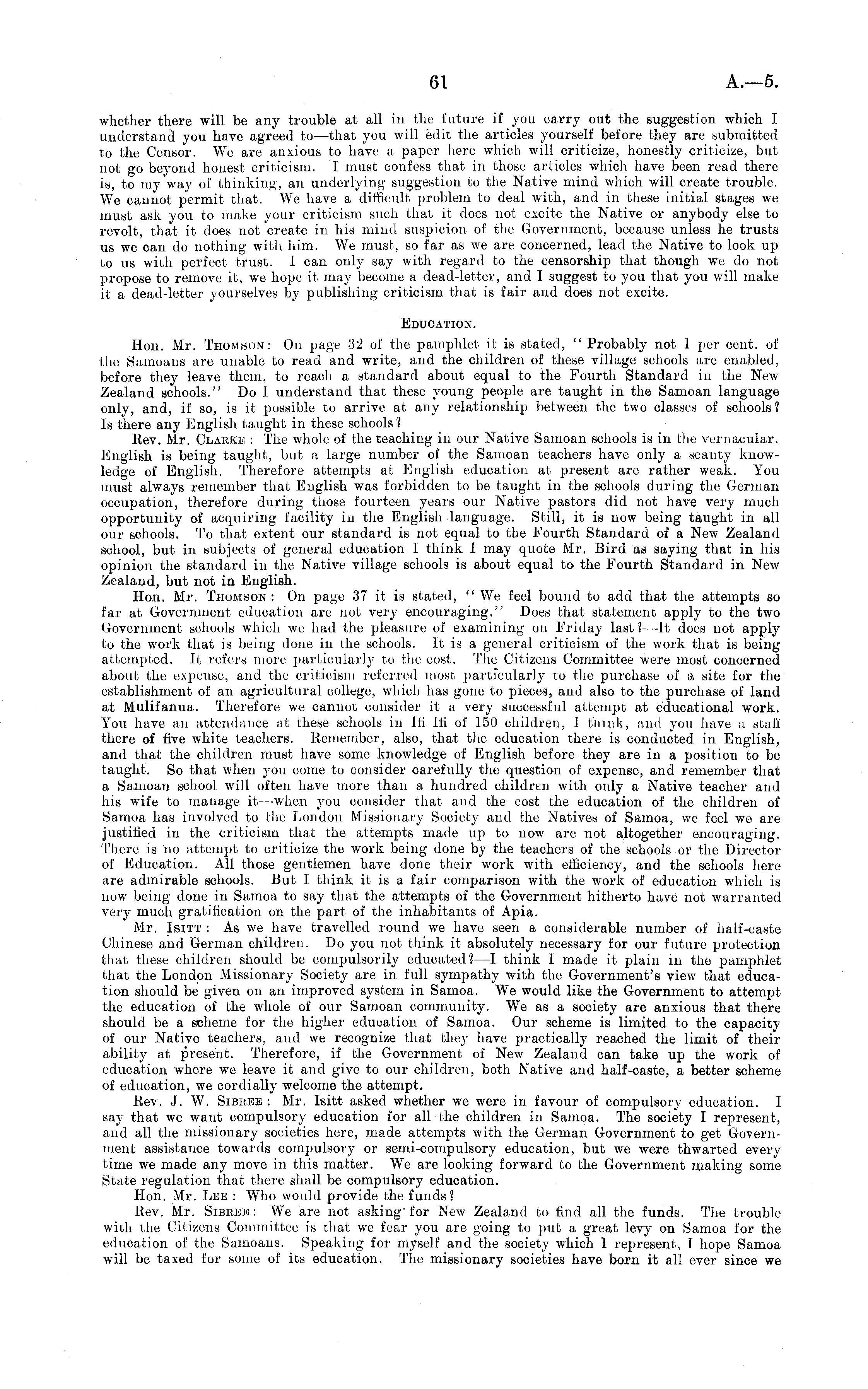 whether there will be any trouble at all in the future if you carry out the suggestion which I understand you have agreed to —that you will edit the articles yourself before they are submitted to the Censor. We are anxious to have a paper here which will criticize, honestly criticize, but not go beyond honest criticism. I must confess that in those articles which have been read there is, to my way of thinking, an underlying suggestion to the Native mind which will create trouble. We cannot permit that. We have a difficult problem to deal with, and in these initial stages we must ask you to make your criticism such that it does not excite the Native or anybody else to revolt, that it does not create in his mind suspicion of the Government, because unless he trusts us we can do nothing with him. We must, so far as we are concerned, lead the Native to look up to us with perfect trust. I can only say with regard to the censorship that though we do not propose to remove it, we hope it may become a dead-letter, and I suggest to you that you will make it a dead-letter yourselves by publishing criticism that is fair and does not excite. Education. Hon. Mr. Thomson: On page 32 of the pamphlet it is stated, " Probably not 1 per cent, of the Samoans are unable to read and write, and the children of these village schools are enabled, before they leave them, to reach a standard about equal to the Fourth Standard in the New Zealand schools." Do J understand that these young people are taught in the Samoan language only, and, if so, is it possible to arrive at any relationship between the two classes of schools? Is there any English taught in these schools ? Rev. Mr. Clarke : The whole of the teaching in our Native Samoan schools is in the vernacular. English is being taught, but a large number of the Samoan teachers have only a scanty knowledge of English. Therefore attempts at English education at present are rather weak. You must always remember that English was forbidden to be taught in the schools during the German occupation, therefore during those fourteen years our Native pastors did not have very much opportunity of acquiring facility in the English language. Still, it is now being taught in all our schools. To that extent our standard is not equal to the Fourth Standard of a New Zealand school, but in subjects of general education I think I may quote Mr. Bird as saying that in his opinion the standard in the Native village schools is about equal to the Fourth Standard in New Zealand, but not in English. Hon. Mr. Thomson: On page 37 it is stated, "We feel bound to add that the attempts so far at Government education are not very encouraging." Does that statement apply to the two Government schools which we had the pleasure of examining on Friday last?—lt does not apply to the work that is being done in the schools. It is a general criticism of the work that is being attempted. It refers more particularly to the cost. The Citizens Committee were most concerned about the expense, and the criticism referred most particularly to the purchase of a site for the establishment of an agricultural college, which has gone to pieces, and also to the purchase of land at Mulifanua. Therefore we cannot consider it a very successful attempt at educational work. You have an attendance at these schools in Iff Ifi of 150 children, I think, and you have a staff there of five white teachers. Remember, also, that the education there is conducted in English, and that the children must have some knowledge of English before they are in a position to be taught. So that when you come to consider carefully the question of expense, and remember that a Samoan school will often have more than a. hundred children with only a Native teacher and his wife to manage it —when you consider that and the cost the education of the children of Samoa has involved to the London Missionary Society and the Natives of Samoa, we feel we are justified in the criticism that the attempts made up to now are not altogether encouraging. There is no attempt to criticize the work being done by the teachers of the schools or the Director of Education. All those gentlemen have done their work with efficiency, and the schools here are admirable schools. But I think it is a fair comparison with the work of education which is now being done in Samoa to say that the attempts of the Government hitherto have not warranted very much gratification on the part of the inhabitants of Apia. Mr. Isitt : As we have travelled round we have seen a considerable number of half-caste Chinese and German children. Do you not think it absolutely necessary for our future protection that these children should be compulsorily educated?—l think I made it plain in the pamphlet that the London Missionary Society are in full sympathy with the Government's view that education should be given on an improved system in Samoa. We would like the Government to attempt the education of the whole of our Samoan community. We as a society are anxious that there should be a scheme for the higher education of Samoa. Our scheme is limited to the capacity of our Native teachers, and we recognize that they have practically reached the limit of their ability at present. Therefore, if the Government of New Zealand can take up the work of education where we leave it and give to our children, both Native and half-caste, a better scheme of education, we cordially welcome the attempt. Rev. J. W. Sibree : Mr. Isitt asked whether we were in favour of compulsory education. I say that we want compulsory education for all the children in Samoa. The society I represent, and all the missionary societies here, made attempts with the German Government to get Government assistance towards compulsory or semi-compulsory education, but we were thwarted every time we made any move in this matter. We are looking forward to the Government making some State regulation that there shall be compulsory education.