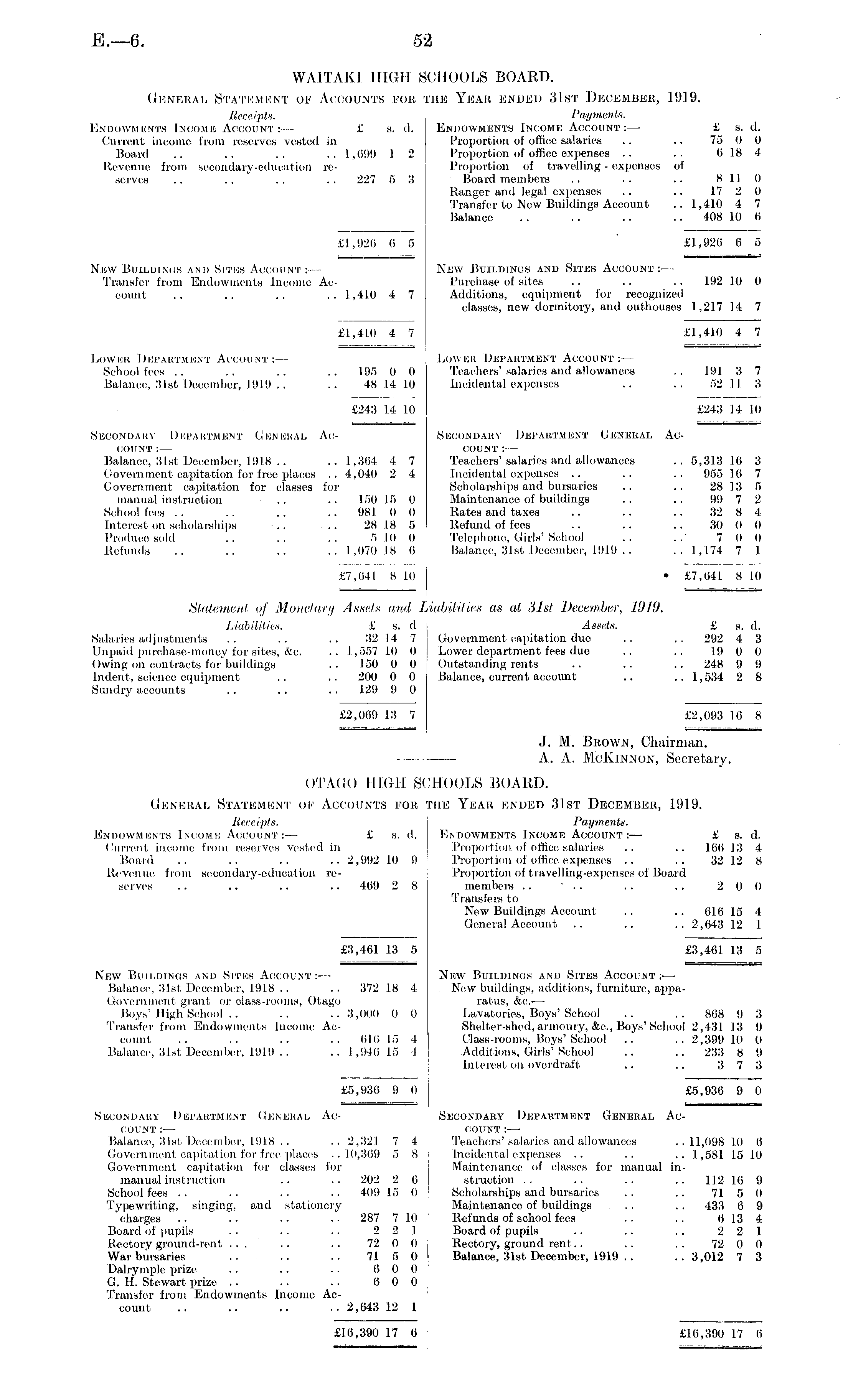 WAITAKi HIGH SCHOOLS BOARD. General Statement of Accounts fob the Yioar ended 31st December, 11)19. Receipts. Payments. Endowments Income Account:— £ 8. d. Endowments Income Account:— £ s. d. Current income from reserves vested in Proportion of office salaries ■• •• 75 I) 0 Board .. .. .. .. 1,099 1 2 Proportion of office expenses .. .. li in 4 Revenue from secondary-education re- Proportion of travelling - expenses of serves .. .. .. .. 227 5 3 Board members .. . • • • silo Banger and legal expenses .. .. 17 2 0 Transfer to New Buildings Account .. 1,410 4 7 Balance .. .. .. .. 408 10 (i £1,920 6 5 £1,926 0 5 Niow Buildings and Sites Account : New Buildings and Sites Account:— Transfer from Endowments Income Ac- Purchase of sites .. .. •■ 192 10 0 count .. .. .. .. 1,410 4 7 Additions, equipment for recognized classes, new dormitory, and outhouses 1,217 14 7 £1,410 4 7 £1,410 4 7 Lower Department Account:— Lower Department Account: — School fees .. .. .. .. lit") 0 0 Teachers'salaries and allowances .. 191 3 7 Balance, 31st December, 1919 .. .. 48 14 10 Incidental expenses .. .. 52 II :i £241! 14 10 £243 14 10 Secondary Department General Ac- Secondary Department General Account: — COUNT: — Balance, 31st December, 1918 . i .. I ~'i(i4 4 7 Teachers'salaries and allowances .. 5,313 10 3 Government capitation for free places .. 4,040 2 4 Incidental expenses .. .. .. 955 l(i 7 Government capitation for classes for Scholarships and bursaries .. .. 28 13 5 manual instruction .. .. 150 15 0 Maintenance of buildings .• .. 9!) 7 2 School fees .. .. .. .. 981 0 0 Elates and taxes .. .. .. 32 8 4 Interest on scholarships .. .. 28 18 5 Refund of fees .. .. .. 80 0 0 Produce sold .. .. .. 5 10 <) Telephone, Girls'School .. ..' 7 0 0 Refunds .. .. .. .. 1,(170 18 (i Balance, 31st December, 1919 .. .. 1,174 7 I £7,041 810 • £7,041 8 10 Statement of Monetary Assets and Liabilities as al 31st December, I'M , .). Liabilities. £ 9, d Assets. £ s. d. Salaries adjustments . . . . .. 1)2 14 7 ] Government capitation due .. .. 292 4 3 Unpaid purohase-money for sites, &C. .. 1,557 10 O Lower department fees due .. .. 19 0 0 Owing on contracts for buildings .. 150 0 0 Outstanding rents .. .. .. 248 i) i) Indent, science equipment .. .. 200 0 0 Balance, ourrent aooount .. .. 1,534 2 8 Sundry accounts .. .. .. 12090 £2,089 L3 7 £2,093 IC. 8 J. M. Bkown, Chairman. A. A. MclviNNON, Secretary. OTAGO lIKMI SCHOOLS BOARD. General Statement ok Accounts foe the Year ended 31st December, 1919. Receipts. Payment*. Endowments Income Account:—■ £ s. d. Endowments [nooms Account:— £ t. d. Current income from reserves vested in Proportion of office salaries .. .. Kili 13 4 Hoard .. .. .. .. 2,992 lo 9 Proportion of office expenses .. .. 32 12 8 Revenue from secondary-education re- Proportion of travelling-expenses of Board .serves .. .. .. .. 409 2 8 members .. ■ .. .. .. 2 0 0 Transfers to New Buildings Account .. . . 818 15 4 General Account .. .. .. 2,043 12 1 £3,401 13 5 £3,4(51 13 5 New Buildings and Sites Account:— New Buildings and Sites Account:— Balance, 31st December, 1918.. .. 372 18 4 New buildings, additions, furniture, appaGovernment grant or olass-rooms, Otago ratue, &o. — Boys' I liuli School .. .. .. 3,000 0 0 Lavatories, Hoys'School .. .. 868 it 3 Transfer from Endowments Income Ac- Shelter-shed. armoury, &0., Boys' School 2,431 13 9 count .. .. .. .. 816 15 4 Class-rooms, Hoys'School .. .. 2,399 10 0 Balance, 31st December, 1919 .. .. 1,946 15 4 Additions, (Jills' , School .. .. 233 8 9 Interest on overdraft .. .. 3 7 3 £5,030 9 0 £5,930 9 0 Secondary Department General Ac- Secondary Department General Account :— count : —■ Balance, 31st December, 1918 .. .. 2,321 7 4 Teachers'salaries and allowances ..11,098 10 (i Government capitation for free places .. 10,389 5 8 Incidental expenses .. .. .. 1,581. 15 10 Government capitation for classes for Maintenance of classes for manual inmanual instruction .. .. 202 2 0 struetion .. .. .. .. 112 Hi 9 School fees .. .. . . .. 409 15 0 Scholarships and bursaries .. .. 715 0 Typewriting, singing, and stationery Maintenance of buildings . . . . 433 0 9 charges .. .. .. .. 287 710 Refunds of school fees .. .. 013 4 Board of pupils .. .. .. 2 2 1 Board of pupils .. .. .. 2 2 1 Rectory ground-rent ... .. .. 72 0 0 Rectory, ground rent.. .. .. 72 0 0 War bursaries .. .. .. 71 5 0 Balance, 31st December, 1919 .. .. 3,012 7 3 Dalrymple prize .. .. .. 0 0 0 G. H. Stewart prize .. .. .. 0 0 0 Transfer from Endowments Income Account .. .. .. .. 2,643 12 1 £10,390 17 0 £10,390 17 0