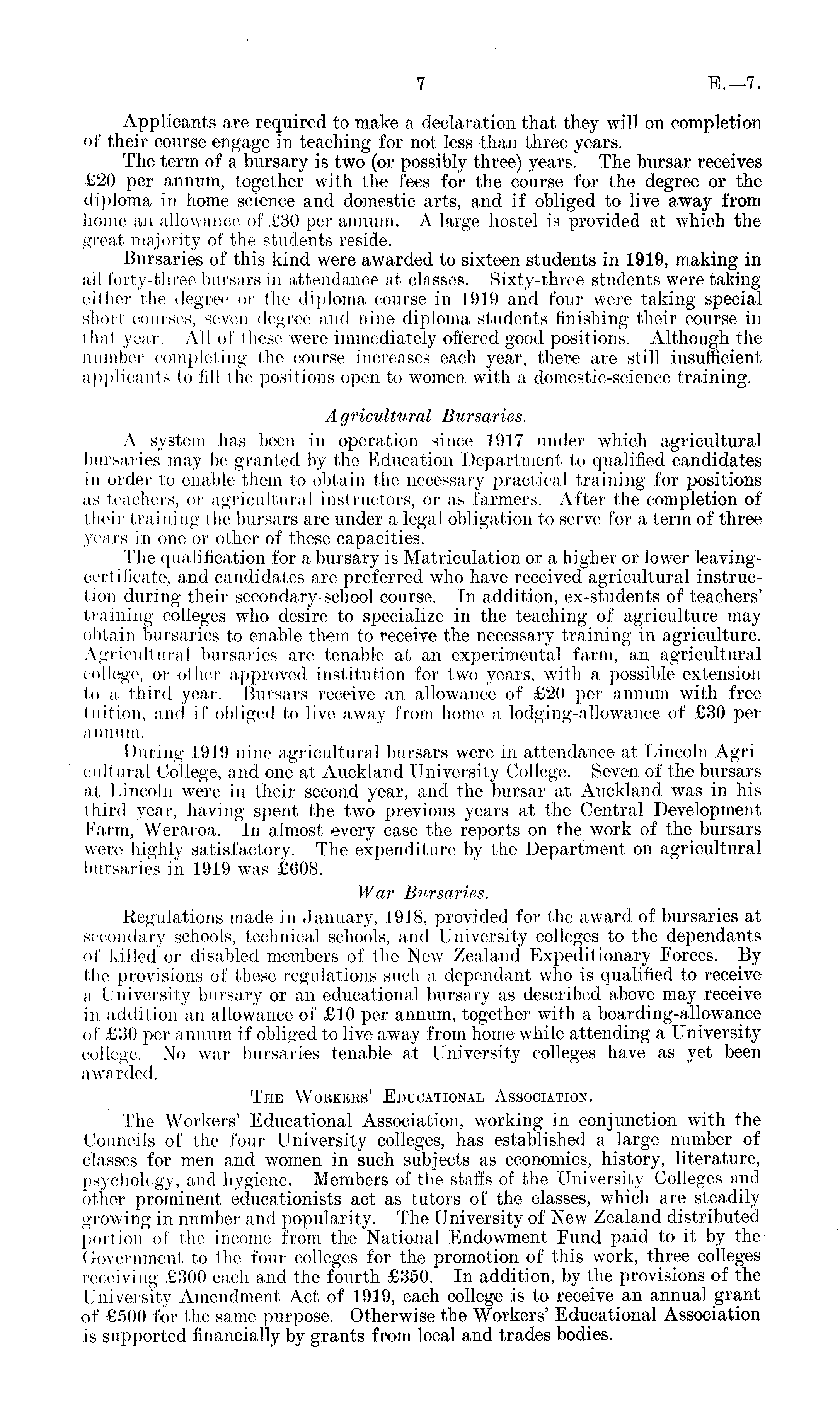 Applicants are required to make a declaration that they will on completion of their course engage in teaching for not less than three years. The term of a bursary is two (or possibly three) years. The bursar receives £20 per annum, together with the fees for the course for the degree or the diploma in home science and domestic arts, and if obliged to live away from home an allowance of £30 per annum. A large hostel is provided at which the great majority of the students reside. Bursaries of this kind were awarded to sixteen students in 1919, making in all forty-three bursars in attendance at classes. Sixty-three students were taking either the degree 1 or (he diploma, course in 1919 and four were taking special short courses, seven degree and nine diploma students finishing their course in that year. All of these were immediately offered good positions. Although the number completing the course increases each year, there are still insufficient applicants to fill the positions open to women with a domestic-science training. A gricultural Bursaries. A system has been in operation since 1917 under which agricultural bursaries may be granted by the Education Department to qualified candidates in order to enable them to obtain the necessary practical training for positions as teachers, or agricultural instructors, or as farmers. After the completion of their training the bursars are under a legal obligation to serve for a term of three years in one or other of these capacities. The qualification for a bursary is Matriculation or a higher or lower leavingcertificate, and candidates are preferred who have received agricultural instruction during their secondary-school course. In addition, ex-students of teachers' training colleges who desire to specialize in the teaching of agriculture may obtain bursaries to enable them to receive the necessary training in agriculture. Agricultural bursaries are tenable at an experimental farm, an agricultural college, or other approved institution for two years, with a possible extension to a third year. Bursars receive an allowance of £20 per annum with free tuition, and if obliged to live away from home a lodging-allowance of £30 per annum. During 1919 nine agricultural bursars were in attendance at Lincoln Agricultural College, and one at Auckland University College. Seven of the bursars at Lincoln were in their second year, and the bursar at Auckland was in his third year, having spent the two previous years at the Central Development Earm, Weraroa. In almost every case the reports on the work of the bursars were highly satisfactory. The expenditure by the Department on agricultural bursaries in 1919 was £608. War Bursaries. Regulations made in January, 1918, provided for the award of bursaries at secondary schools, technical schools, and University colleges to the dependants of killed or disabled members of the New Zealand Expeditionary Forces. By the provisions of these regulations such a, dependant who is qualified to receive a University bursary or an educational bursary as described above may receive in addition an allowance of £10 per annum, together with a boarding-allowance of £30 per annum if obliged to live away from home while attending a University college. No war bursaries tenable at University colleges have as yet been awarded. The Workers' Educational Association. The Workers' Educational Association, working in conjunction with the Councils of the four University colleges, has established a large number of classes for men and women in such subjects as economics, history, literature, psychology, and hygiene. Members of the staffs of the University Colleges and other prominent educationists act as tutors of the classes, which are steadily growing in number and popularity. The University of New Zealand distributed portion of the income from the National Endowment Fund paid to it by the Government to the four colleges for the promotion of this work, three colleges receiving £300 each and the fourth £350. In addition, by the provisions of the University Amendment Act of 1919, each college is to receive an annual grant of £500 for the same purpose. Otherwise the Workers' Educational Association is supported financially by grants from local and trades bodies.