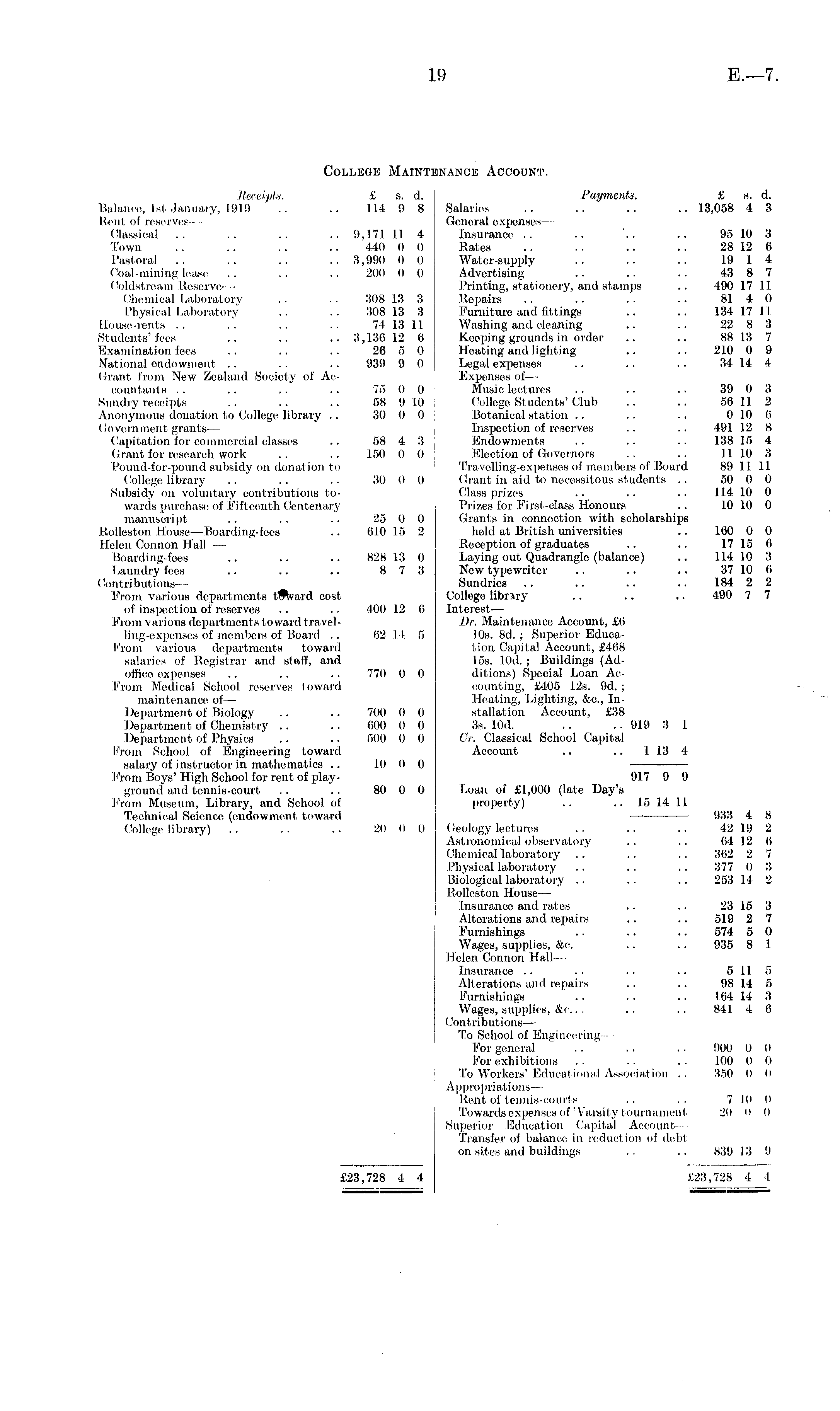 College Maintenance Account. Receipts. £ s. d. Payments. £ s. d. Balance, 1st January, 1919 .. .. 114 9 8 Salaries .. .. .. .. 13,058 4 3 Rent of reserves — General expenses — Classical .. .. .. .. 9,171 11 4 Insurance .. .. '.. .. 95 10 3 Town .. .. .. .. 440 0 0 Rates .. .. .. .. 28 12 fi Pastoral .. .. .. .. 3,990 0 0 Water-supply .. .. .. 19 1 4 Coal-mining lease .. .. .. 200 0 0 Advertising' .. .. .. 43 8 7 Coldstream Reserve — Printing, stationery, and stamps .. 490 17 11 Chemical Laboratory .. . . 308 13 3 Repairs .. .. .. .. 81 4 0 Physical Laboratory .. .. 308 13 3 Furniture and fittings .. .. 134 17 11 House-rents .. .. .. .. 74 13 11 Washing and cleaning .. .. 22 8 3 Students'fees .. .. .. 3,130 12 6 Keeping grounds in order .. .. 88 13 7 Examination fees .. .. .. 26 5 0 Heating and lighting .. .. 210 0 9 National endowment .. .. .. 939 9 0 Legal expenses .. .. .. 34 14 4 ((rant from New Zealand Society of Ac- Expenses of— eountants .. .. .. .. 75 0 0 Music lectures .. .. 39 0 3 Sundry receipts .. .. .. 58 9 10 College Students'Club .. .. 56 II 2 Anonymous donation to College library .. 30 O 0 Botanical station .. .. .. 0 10 6 Government grants— Inspection of reserves .. .. 491 12 8 Capitation for commercial classes .. 58 4 3 Endowments .. .. .. 138 15 4 Grant for research work .. .. 150 0 0 Kleetion of Governors .. .. II 10 3 Pound-for-pound subsidy on donation to Travelling-expenses of members of Board 89 11 II College library .. .. .. 30 0 0 Grant in aid to necessitous students .. 50 0 0 Subsidy on voluntary contributions to- Class prizes .. .. .. 114 10 0 wards purchase of Fifteenth Centenary Prizes for First-class Honours .. 10 10 0 manuscript .. .. .. 25 0 0 Grants in connection with scholarships Rolleston House—Boarding-fees .. 610 15 2 held at British universities .. 160 0 0 Helen Connon Hall — Reception of graduates .. .. 17 15 6 Boarding-fees .. .. .. 828 13 0 Laying out Quadrangle (balance) .. 114 10 3 Laundry fees .. .. .. 8 7 3 New typewriter .. .. .. 37 10 6 Contributions— Sundries .. .. .. .. 184 2 2 From various departments tcVard cost College library .. .. .. 490 7 7 of ins])ection of reserves .. .. 400 12 6 Interest — From various departments toward travel- Dr. Maintenance Account, £6 ling-expenses of members of Board .. 62 14 5 10s. 8d. ; Superior EducaI'Vom various departments toward tion Capital Account, £468 salaries of Registrar and staff, and 15s. lOd. ; Buildings (Adoffice expenses .. .. .. 770 0 0 ditions) Special Loan AcFrom Medical School reserves toward counting, £405 12s. 9d. ; maintenance of — Heating, Lighting, &c, InDepartmont of Biology .. .. 700 0 0 stallation Account, £38 Department of Chemistry .. .. 600 0 0 .'Is. lOd. .. .. 919 3 1 Department of Physics .. .. 500 0 0 Or. Classical School Capital From School of Engineering toward Account .. .. 1 13 4 salary of instructor in mathematics .. 10 0 0 From Boys' High School for rent of play- 917 9 9 ground and tennis-court .. .. 80 0 0 Loan of £1,000 (late Day's From Museum, Library, and School of property) .. .. 15 14 11 Technical Science (endowment toward —■ ■ 933 4 8 College library) .. .. .. 20 (I 0 Geology lectures .. .. .. 42 19 2 Astronomical observatorj .. .. 64 12 6 Chemical laboratory .. .. .. 362 2 7 Physical laboratory .. .. .. 377 0 3 Biological laboratory .. .. .. 253 14 2 Rolleston House-— Insurance and rates .. .. 23 15 3 Alterations and repairs .. .. 519 2 7 Furnishings .. .. .. 574 5 0 Wages, supplies, &c. .. .. 935 8 1 Helen Connon HallInsurance .. .. .. .. 5 11 5 Alterations and repairs .. .. 98 14 5 Furnishings .. .. . ■ 164 14 3 Wages, supplies, &c.. . .. .. 841 4 6 Contributions'— To School of Engineering— For general .. .. .. 900 0 o For exhibitions .. .. .. 100 0 0 To Workers'Educational Association .. 350 0 (I Appropriations— Rent of tennis-courts .. .. 7 10 o Towards expenses of "Varsity tournament 20 o <> Superior Education Capital AccountTransfer of balance in reduction of debt on sites and buildings .. .. 839 13 0 £23,728 4 4 £23,728 4 4