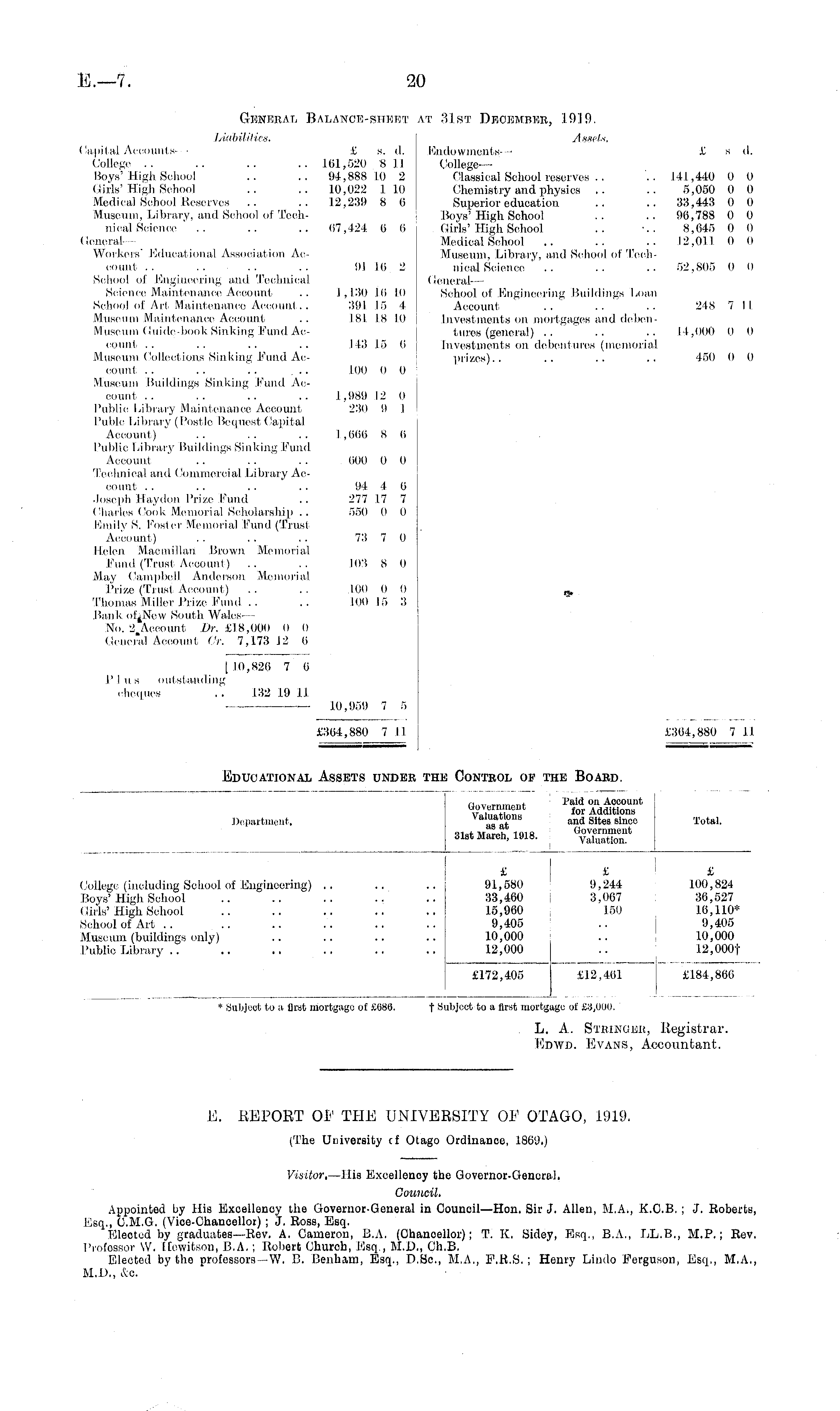 E. REPORT OF THE UNIVERSITY OE OTAGO, 1919. (The University cf Otago Ordinance, 1869.) Visitor, —His Excollonoy the Governor-General. Council. Appointed by His Excellency the Governor-General in Council—Hon. Sir J. Allen, M.A,, 1K.C.8. ; J. Roberts, Esq., C.M.G. (Vice-Chanoellor) ; J. Ross, Esq. Elected by graduates—Rev. A. Cameron, B.A. (Chanoellor); T. K. Sidey, Esq., 8.A., LL.B., M.P.; Rev. Professor \V. (lewitson, 8.A.; Robert Church, Esq., M.D., Oh.B. Elected by the professors—W. B. Benham, Esq., D.Sc, M.A., F.K.S. ; Henry Lindo Ferguson, Esq., M.A,, M.D., &c.