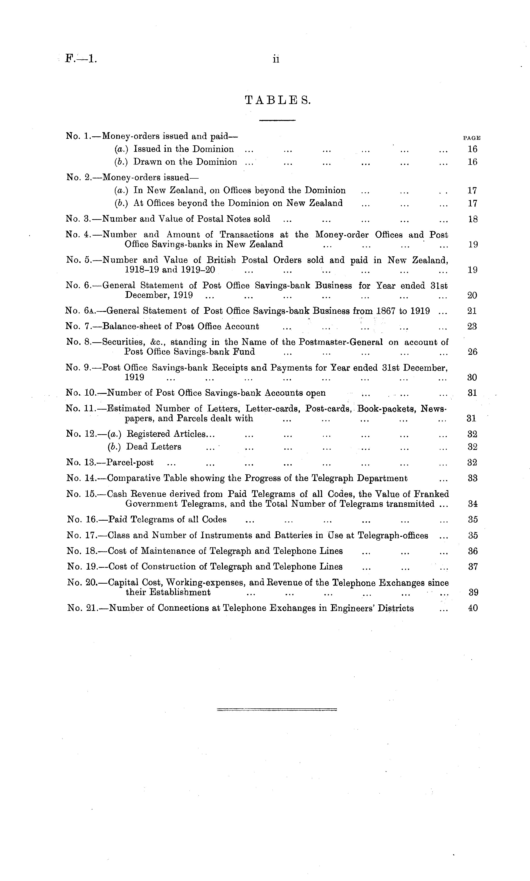 TABLES. No. 1. —Money-orders issued and paid— page (a.) Issued in the Dominion ... ... ... ... ... ... 16 (b.) Drawn on the Dominion ... ... ... ... ... ... 16 No. 2. —Money-orders issued— (a.) In New Zealand, on Offices beyond the Dominion ... ... . . 17 (b.) At Offices beyond the Dominion on New Zealand ... ... ... 17 No. 3.—Number and Value of Postal Notes sold ... ... ... ... ... 18 No. 4.—Number and Amount of Transactions at the Money-order Offices and Post Office Savings-banks in New Zealand ... ... ... ... 19 No. s.—Number and Value of British Postal Orders sold and paid in New Zealand, 1918-19 and 1919-20 ... ... ... ... ... ... 19 No. 6.—General Statement of Post Office Savings-bank Business for Year ended 3lst December, 1919 ... ... ... ... ... ... ... 20 No. 6a.—General Statement of Post Office Savings-bank Business from 1867 to 1919 ... 21 No. 7.—Balance-sheet of Post Office Account ... ... ... ... ... 23 No. 8. —Securities, &c, standing in the Name of the Postmaster-General on account of Post Office Savings-bank Fund ... ... ... ... ... 26 No. 9. —Post Office Savings-bank Beceipts and Payments for Year ended 31st December, 1919 ... ... ... ... ... ... ... ... 30 No. 10.—Number of Post Office Savings-bank Accounts open ... ... 31 No. 11.—Estimated Number of Letters, Letter-cards, Post-cards, Book-packets, Newspapers, and Parcels dealt with ... ... ... ... ... 31 No. 12.— (a.) Registered Articles... ... ... ... ... ... ... 32 (b.) Dead Letters ... ... ... ... ... ... ... 32 No. 13.—Parcel-post ... ... ... ... ... ... ... ... 32 No. 14. —Comparative Table showing the Progress of the Telegraph Department ... 33 No. 15.-—Cash Revenue derived from Paid Telegrams of all Codes, the Value of Franked Government Telegrams, and the Total Number of Telegrams transmitted ... 34 No. 16.—Paid Telegrams of all Codes ... ... ... ... ... ... 35 No. 17. —Class and Number of Instruments and Batteries in Use at Telegraph-offices ... 35 No. 18.—Cost of Maintenance of Telegraph and Telephone Lines ... ... ... 36 No. 19. —Cost of Construction of Telegraph and Telephone Lines ... ... ... 37 No. 20.—Capital Cost, Working-expenses, and Revenue of the Telephone Exchanges since their Establishment ... ... ... ... ... ... 39 No. 21.—Number of Connections at Telephone Exchanges in Engineers' Districts ... 40