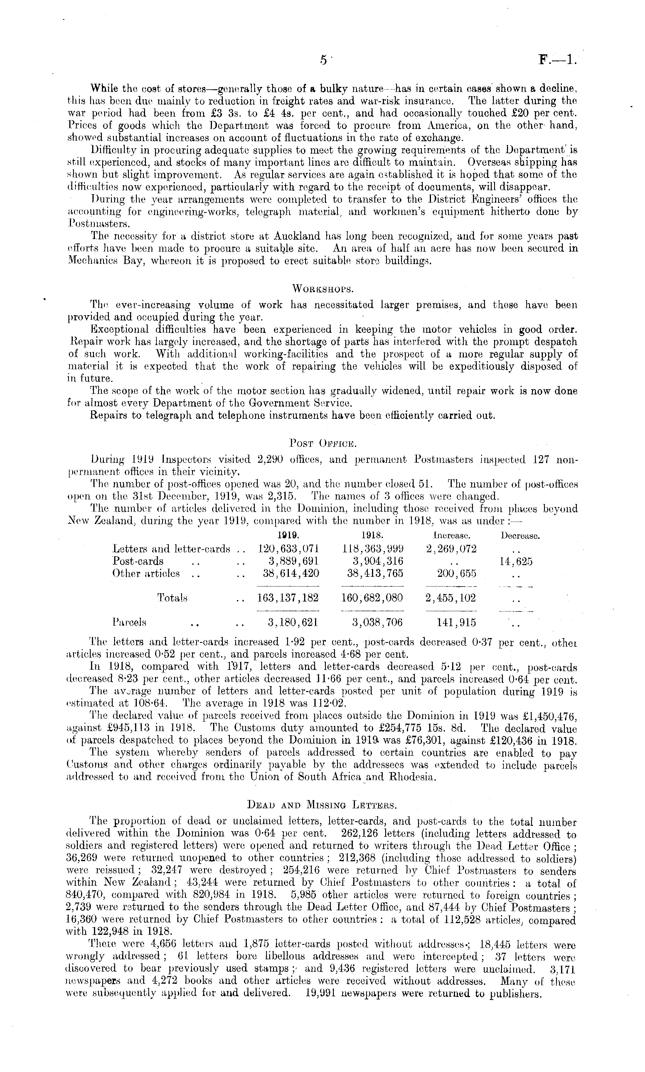 While the cost of stores—generally those of a bulky nature - has in certain cases shown a decline, this has been due mainly to reduction in freight rates and war-risk insurance. The latter during the war period had been from £3 3s. to £4 4s. per cent., and had occasionally touched £20 per cent. Prices of goods which the Department was forced to procure from America, on the other hand, showed substantial increases on account of fluctuations in the rate of exchange. Difficulty in procuring adequate supplies to meet the growing requirements of the Department' is still, experienced, and stocks of many important lines are difficult to maintain. Overseas shipping has shown but slight improvement. As regular services are again established it is hoped that some of the difficulties now experienced, particularly with regard to the receipt of documents, will disappear. During the year arrangements were completed to transfer to the District Engineers' offices the accounting for engineering-works, telegraph material, and. workmen's equipment hitherto done by Postmasters. The necessity for a district store at Auckland has long been recognized, and for some years past efforts have been made to procure a suitable, site. An area of half an acre has now been secured in Mechanics Bay, whereon it is proposed to erect suitable store buildings. WOEKSHOPS. The ever-increasing volume of work has necessitated larger premises, and these have been provided and occupied during the year. Exceptional difficulties have been experienced in keeping the motor vehicles in good order. Repair work has largely increased, and the shortage of parts has interfered with the prompt despatch of such work. With additional working-facilities and the prospect of a more regular supply of material it is expected that the work of repairing the vehicles will be expeditiously disposed of in future. The scope of the work of the motor section has gradually widened, until repair work is now done for almost every Department of the Government Service. Repairs to telegraph and telephone instruments have been efficiently carried out. Post Office. During 1919 Inspectors visited 2,290 offices, and permanent Postmasters inspected. 127 nonpermanent offices in their vicinity. The number of post-offices opened was 20, and the number closed 51. The number of post-offices open, on the 31st December, 1919, was 2,315. The names of 3 offices were changed. The number eif articles delivered in the Dominion, including those received from places beyond New Zealand, during the year 1919, compared with the number in 1918. was as under : — 1919. 1918. Increase-. Decrease. Letters and letter-cards . . 120.633,071 118.363,999 2,269,072 Post-cards .. .. 3,889,691 3,904,316 .. 14.625 Other articles .. .. 38,614,420 38,413,765 200,655 Totals .. 163,137,182 1.60,682,080 2,455,102 Parcels .. .. 3,180,621 3,038,706 141,915 The letters and letter-cards increased T92 per cent., post-cards decreased 0-37 per cent., other articles increased 0-52 per cent., and parcels increased 4-68 per cent. In 1918, compared with T917, letters and. letter-cards decreased 5-12 per cent., post-cards decreased 8-23 per cent., other articles decreased 11-66 per cent., and parcels increased 0-64 per cent. The average number of letters and letter-cards posted per unit of population during 191.9 is estimated at 108-64. The average in 1918 was 112-02. The declared value of parcels received from places outside the Dominion in 1919 was £1,450,476, against £945,113 in 1918. The Customs duty amounted to £254,775 15s. Bd. The declared value of parcels despatched to places beyond the Dominion in 1919. was £76,301, against £120,436 in 1918. The system whereby senders of parcels addressed to certain countries are enabled to pay Customs and other charges ordinarily payable by the addressees was extended to include parcel's addressed to and received from the Union of South Africa and Rhodesia. Dead and Missing Lettees, The proportion of deael or unclaimed letters, letter-cards, and post-cards to the total number delivered within the Dominion was 0-64 per cent. 262,126 letters (including letters addressed to soldiers and registered letters) were opened and returned to writers through the Dead Letter Office ; 36,269 were returned unopened to other countries ; 21.2,368 (including those addressed to soldiers) were reissued; 32,247 were, destroyed; 254,21.6 were returned by Chief Postmasters to senders within New Zealand ; 43,24-4 were returned by Chief Postmasters to other countries : a total of 840,470, compared with 820,984 in 1918. 5,985 other articles were returned to foreign countries ; 2,739 were returned to the senders through the Dead Letter Office, and 87,444 by Chief Postmasters ; 16,360 were returned by Chief Postmasters to other countries: a total of 112,528 articles, compared with 122,948 in 1918. There were 4,656 letters and 1,875 letter-cards posted without 1.8,445 letters were wrongly addressed; 61 letters bore libellous addresses and. were intercepted; 37 letters were discovered to bear previously used stamps ; and 9,436 registered letters were unclaimed. 3,171 newspapers and 4,272 books and either articles were received without addresses. Many of these were subsequently applied for and delivered. 19,991 newspapers were returned to publishers.