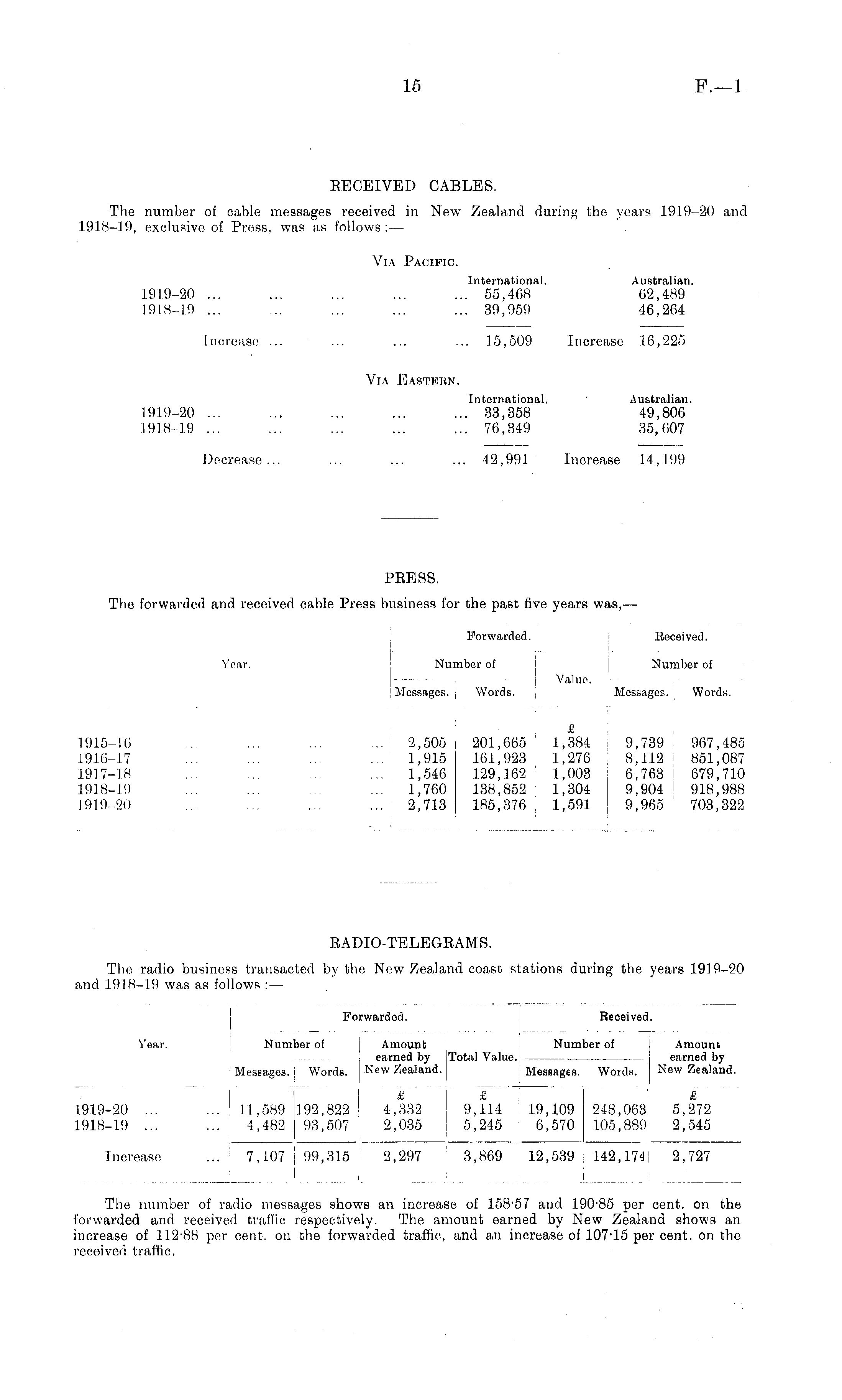 1919-20 1918-19 Year. Forwarded. Received. Number of Amount Number of Amount earned by Total Value. earned by I Messages. Words. New Zealand. Messages. Words. New Zealand. £ £ £ ... 11,589 192,822 ! 4,332 9,114 19,109 248,063 5,272 4,482 9.3,507 2,035 5,245 6,570 105,889 2,545 Increase ... 7,107 I 99,815 2,297 3,869 12,539 142,1741 2,727