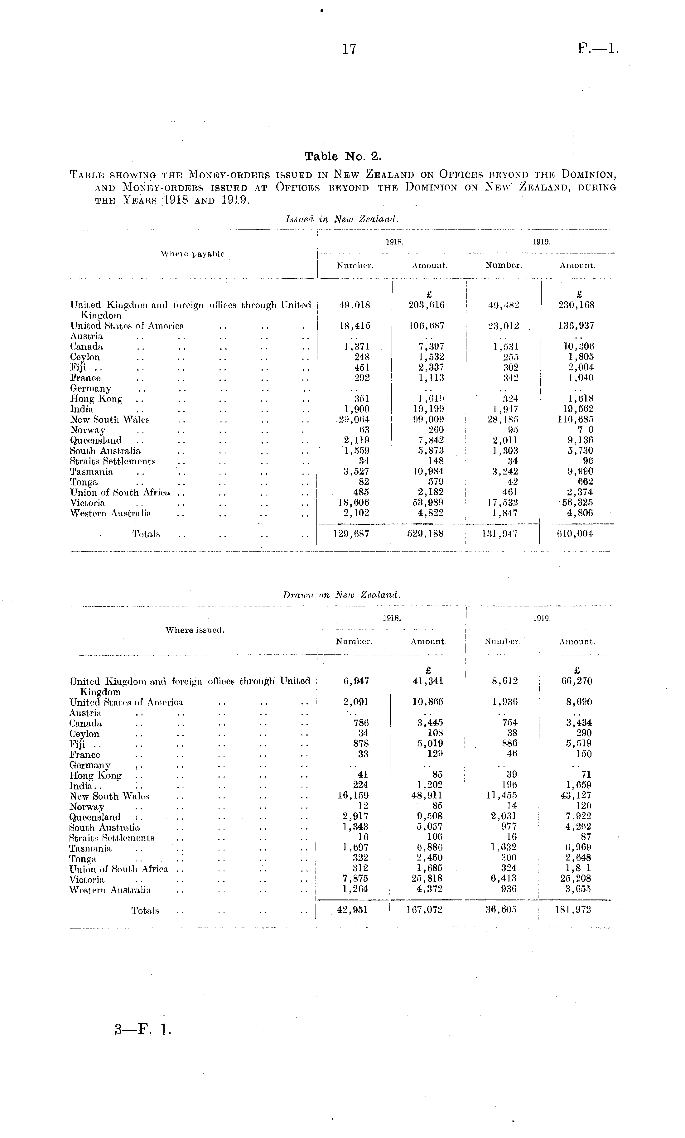 Table No. 2. Table showing the Money-orders issued in New Zealand on Offices beyond the Dominion, and Money-orders issued at Offices beyond the Dominion on New Zealand, during the Years 1918 and 1919. Issued in New Zealand.