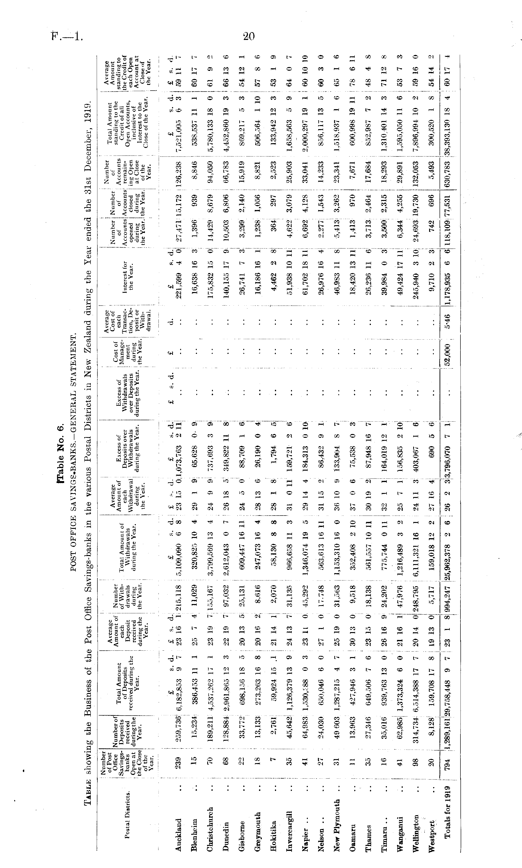 Table No. 6. POST OFFICE SAVINGS-BANKS.— GENERAL STATEMENT. Table showing the Business of the Post Office Savings-banks in the various Postal Districts in New Zealand during the Year ended the 31st December, 1919.