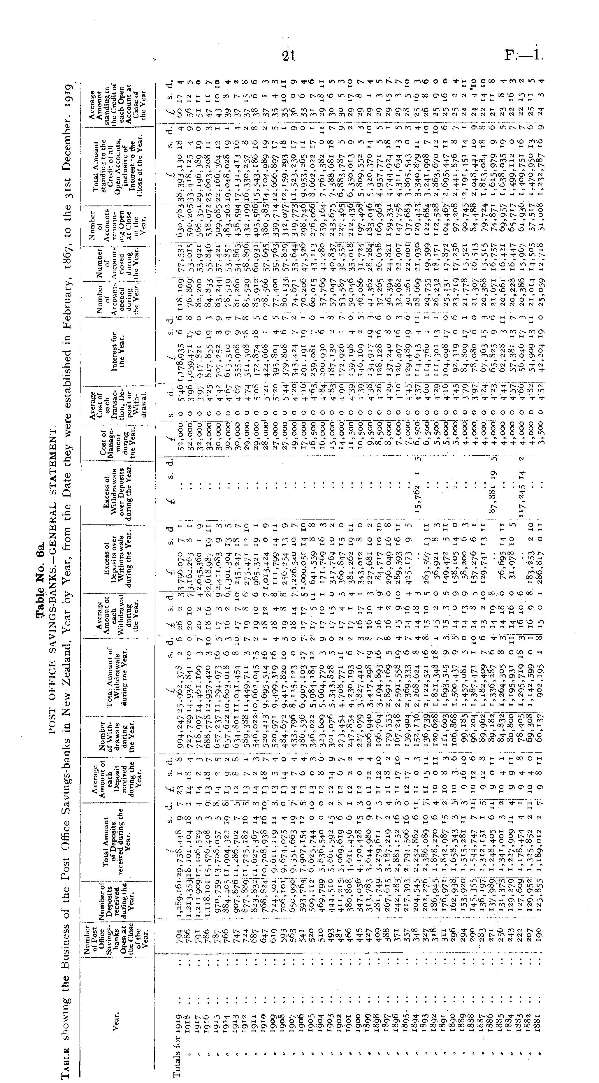 Table No. 6a. POST OFFICE SAVINGS-BANKS.— GENERAL STATEMENT. Table showing the Business of the Post Office Savings-banks in New Zealand, Year by Year, from the Date they were established in February, 1867, to the 31st December, 1919.