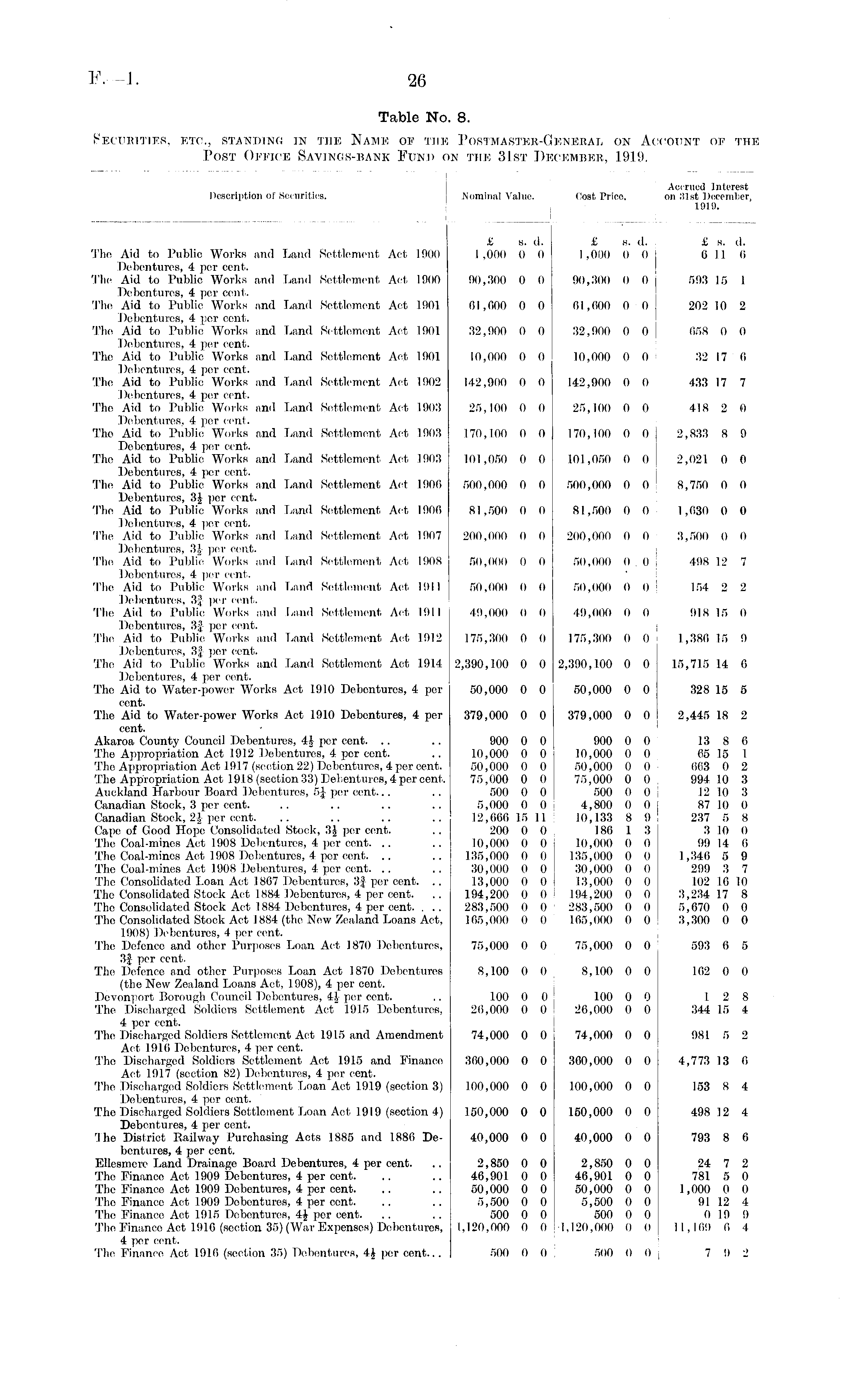 Description ol' Securities. Nominal Value. Cost Price. Accrued Interest on 31st December, 1919. The Aid to Public Works and Land Settlement Act 1900 Debentures, 4 por cent. The Aid to Public Works and Land Settlement Act 1000 Debentures, 4 per cent. The Aid to Public Works and Land Settlement Act 1901 Debentures, 4 per cent. The Aid to Public Works and Land Settlement Act 1901 Debentures, 4 per cent. The Aid to Public Works and Land Settlement Act 1901 Debentures, 4 per cent. The Aid to Public Works and Land Settlement Act 1902 Debentures, 4 per cent. The Aid to Public Works and Land Settlement Act 1903 Debentures, 4 per cent. The Aid to Public Works and Land Settlement Act 1903 Debentures, 4 per cent. The Aid to Public Works and Land Settlement Act 1903 Debentures, 4 por cent. The Aid to Public Works and Land Settlement Act 1906 Debentures, 3J per cent. The Aid to Public Works and Land Settlement Act 1906 Debentures, 4 per cent. The Aid to Public Works and Land Settlement Act 1907 Debentures, 3J per cent. The Aid to Public Works and Land Settlement Act 1908 Debentures, 4 per cent. The Aid to Public Works and Land Settlement Act 1911 Debentures, 3| per cent. The Aid to Public Works and Land Settlement Act 1911 Debentures, 3J per cent. The Aid to Public Works and Land Settlement Act 1912 Debentures, 3J per cent. The Aid to Public Works and Land Settlement Act 1914 Debentures, 4 per cent. The Aid to Water-power Works Act 1910 Debentures, 4 per cent. The Aid to Water-power Works Act 1910 Debentures, 4 per cent. Akaroa County Council Debentures, 4J per cent. The Appropriation Act 1912 Debentures, 4 por cent. The Appropriation Act 1917 (section 22) Debentures, 4 per cent. The Appropriation Act 1918 (section 33) Debentures, 4 per cent. Auckland Harbour Board Debentures, 5J per cent... Canadian Stock, 3 per cent. Canadian Stock, 2|- per cent. Cape of Good Hope Consolidated Stock, 3J per cent. The Coal-mines Act 1908 Debentures, 4 por cent. The Coal-mines Act 1908 Debentures, 4 por cent. The Coal-mines Act 1908 Debentures, 4 per cent. The Consolidated Loan Act 1867 Debentures, 3f per cent. .. The Consolidated Stock Act 1884 Debentures, 4 per cent. The Consolidated Stock Act 1884 Debentures, 4 per cent. , .. The Consolidated Stock Act 1884 (the New Zealand Loans Act, 1908) Debentures, 4 per cent. The Defence and other Purposes Loan Act 1870 Debentures, 3f per cent. The Defence and other Purposes Loan Act 1870 Debentures (the New Zealand Loans Act, 1908), 4 per cent. Dcvonport Borough Council Debentures, 4| per cent. The Discharged Soldiers Settlement Act 1915 Debentures, 4 per cent. The Discharged Soldiers Settlement Act 1915 and Amendment Act 1916 Debentures, 4 per cent. Tho Discharged Soldiers Settlement Act 1915 and Finance Act 1917 (section 82) "Debentures, 4 per cent. The Discharged Soldiers Settlement Loan Act 1919 (section 3) Debentures, 4 per cent. The Discharged Soldiers Settlement Loan Act 1919 (section 4) Debentures, 4 per cent. r Ihe District Railway Purchasing Acts 1885 and 1886 Debentures, 4 per cent. Ellesmerc Land Drainage Board Debentures, 4 per cent. Tho Finance Act 1909 Debentures, 4 per cent. The Finance Act 1909 Debentures, 4 per cent. Tho Finance Act 1909 Debentures, 4 per cent. The Finance Act 1915 Debentures, 4J per cent. The Financo Act 1910 (section 35) (War Expenses) Debentures, 4 per cent. The Finance Act 1916 (section 35) Debentures, 4J per cent... £ s. d. 1,000 0 0 £ s. d. 1,000 0 0 £ s. d. Oil 6 90,300 0 0 90,300 0 0 593 15 1 61,600 0 0 61,600 0 0 202 10 2 32,900 0 0 32,900 0 0 058 0 0 10,000 0 0 10,000 0 0 32 17 6 142,900 0 0 142,900 0 0 433 17 7 25,100 0 0 25,100 0 0 418 2 0 170,100 0 0 170,100 0 0 2,833 8 9 101,050 0 0 101,050 0 0 2,021 0 0 500,000 0 0 500,000 0 0 8,750 0 0 81,500 0 0 81,500 0 0 1,630 0 0 200,000 0 0 200,000 0 0 3,500 0 0 50,(10(1 0 0 50,000 0.0 498 12 7 50,000 0 0 50,000 0 0 ' 154 2 2 49,000 0 0 49,000 0 0 918 15 0 175,300 0 0 2,390,100 0 0 50,000 0 0 379,000 0 0 175,300 0 0 2,390,100 0 0 50,000 0 0 379,000 0 0 1,386 15 9 15,715 14 6 328 15 5 2,445 18 2 900 0 0 10,000 0 0 50,000 0 0 75,000 0 0 500 0 0 5,000 0 0 12,666 15 11 200 0 0 10,000 0 0 135,000 0 0 30,000 0 0 13,000 0 0 194,200 0 0 283,500 0 0 165,000 0 0 900 0 0 10,000 0 0 50,000 0 0 75,000 0 0 500 0 0 4,800 0 0 I 10,133 8 9 ! 186 1 3 10,000 0 0 135,000 0 (I 30,000 0 0 13,000 0 0 194,200 0 0 ; 283,500 0 0 165,000 0 0 13 8 6 65 15 I 668 0 2 994 10 3 12 10 3 87 10 (I 237 5 8 3 10 0 99 14 6 1,346 5 9 299 3 7 102 16 10 3,234 17 8 5,670 0 0 3,300 0 0 75,000 0 0 75,000 0 0 593 6 5 8,100 0 0 8,100 0 0 162 0 0 100 0 0 26,000 0 0 100 0 0 26,000 0 0 1 2 8 344 15 4 74,000 0 0 74,000 0 0 981 5 2 360,000 0 0 j | 360,000 0 0 4,773 13 6 100,000 0 0 100,000 0 0 153 8 4 150,000 0 0 150,000 0 0 498 12 4 40,000 0 0 40,000 0 0 793 8 6 2,850 0 0 46,901 0 0 50,000 0 0 5,500 0 0 500 0 0 1.120.000 0 (I 2,850 0 0 46,901 0 0 50,000 0 0 5,500 0 0 500 0 0 1,120,000 0 0 24 7 2 781 5 0 1,000 0 0 91 12 4 0 19 9 11,169 6 4 500 0 0 500 0 0 7 9 2