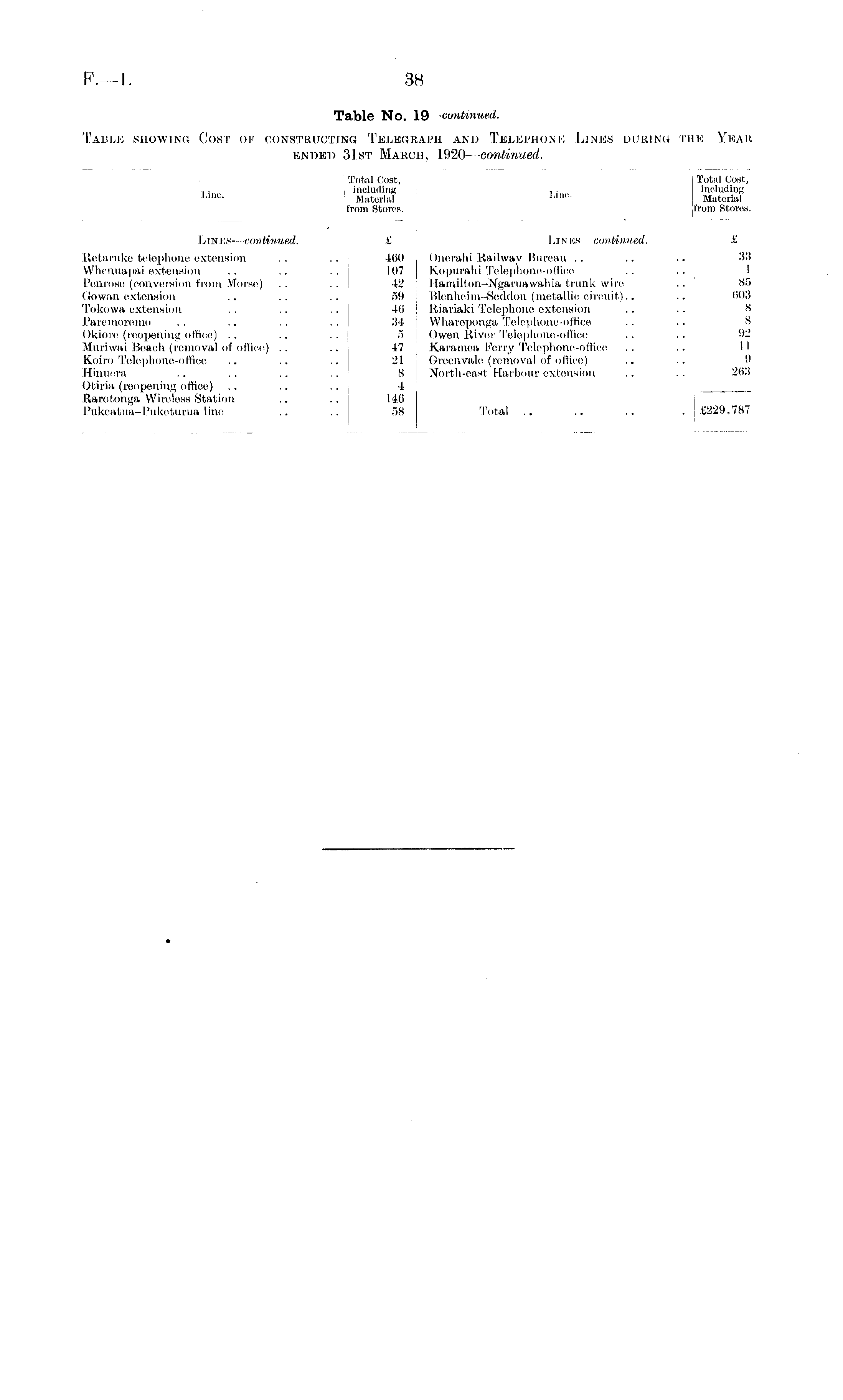 Line. Total (lost, including Material from Stores. Li N ks — continued. £ Onerahi Railway Bureau .. Kopurahi Telephone-office Hainilton-Ngaruawahia trunk wire Bienheim-Seddon (metallic circuit).. Riariaki Telephone extension VVhareponga Telephone-offioe Owen River Telephone-office Karamea Ferry Telephone-office Grecnvale (removal of offioe) North-east Harbour extension 88 I 85 003 8 s 92 II 9 203 Total . £229,787 I