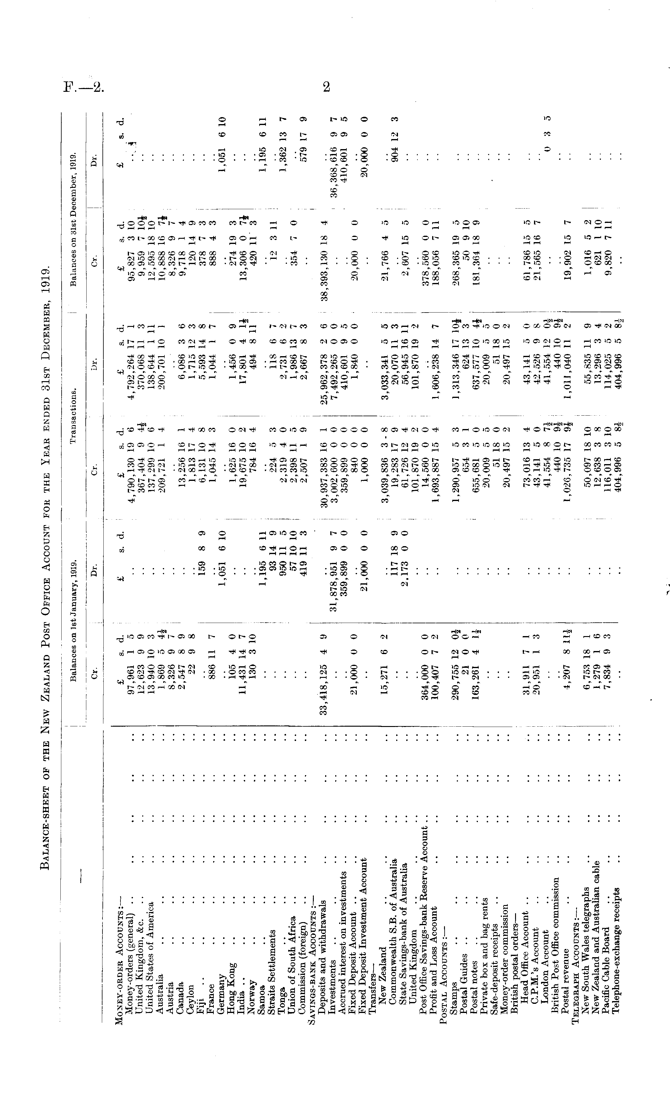 Balances on 1st January, 1919. Transactions. Balances on 31st December, 1919. Cr. Dr. Cr. Dr. Cr. Dr. I I I Money-order Accounts: — Money-orders (general) United Kingdom, &c. United States of America Australia Austria Canada Ceylon Fiji .. France Germany Hong Kong India Norway Samoa Straits Settlements Tonga Union of South Africa Commission (foreign) Savings-bank Accounts :— Deposits and withdrawals Investments Accrued interest on investments Fixed Deposit Account Fixed Deposit Investment Account Transfers — New Zealand Commonwealth S.B. of Australia State Savings-bank of Australia United Kingdom Post Office Savings-bank Reserve Account .. Profit and Loss Account Postal Accounts :— Stamps Postal Guides Postal notes Private box and bag rents Safe-deposit receipts Money-order commission British postal orders — Head Office Account C.P.M.'s Account London Account British Post Office commission Postal revenue Telegraph Accounts :— New South Wales telegraphs New Zealand and Australian cable Pacific Cable Board Telephone-exchange receipts £ s. d. 97,961 1 5 12,623 9 9 13,940 10 3 1,869 5 44. 8,326 9 7 2,547 8 9 22 9 8 886 11 7 105 4 0 11,431 14 7 130 3 10 33,418,125 4 9 21,000 0 0 15,271 6 2 364,000 0 0 100,407 7 2 290,755 12 OJ 21 0 0 163,261 4 14 31,911 7 1 20,951 1 3 4,207 8 Hi 6,753 18 1 1,279 1 6 7,834 9 3 £ s. d. 159 8 9 1,051 6 10 1,195 6 11 93 14 9 950 11 5 57 10 10 419 11 3 31,878,951 9 7 359,899 0 0 21,000 0 0 117 18 9 2.173 0 0 £ s. d. £ s. d. 4,790,130 19 6 4,792,264 17 1 367,404 9 4J 370,068 11 3 137,299 10 6 138,644 1 11 209,721 1 4 200,701 10 1 13,256 16 1 6,086 3 6 1,813 17 4 1,715 12 3 6,131 10 8 5,593 14 8 1,045 14 3 1,044 1 7 1,625 16 0 1,456 0 9 19,675 10 2 17,801 4 H 784 16 4 494 8 11 224 5 3 118 6 7 2,319 4 0 2,731 6 2 2,398 11 5 1,986 13 7 2,507 1 9 2,667 8 3 30,937,383 16 1 25,962,378 2 0 3,002,600 0 0 7,492,265 0 0 359,899 0 0 410,601 9 5 840 0 0 1,840 0 0 1,000 0 0 3,039,836 3 - 8 3,033,341 5 5 19,283 17 9 20,070 11 3 61.726 12 4 56,945 16 11 101,870 19 2 101,870 19 2 14,560 0 0 1,693,887 15 4 1,606,238 14 7 1,290,957 5 3 1,313,346 17 10£ 654 3 1 624 13 3 655,681 5 0 637,577 10 4$ 20,009 5 5 20,009 5 5 51 18 0 51 18 0 20,497 15 2 20,497 15 2 73,016 13 4 43,141 5 0 43,141 5 0 42,526 9 8 41,554 8 74 41,554 12 0£ 440 10 9| 440 10 9J 1,026,735 17 9| 1,011,040 11 2 50,097 18 10 55,835 11 9 12,638 3 8 13,296 3 4 116,011 3 10 114,025 5 2 404,996 5 84 404,996 5 8! £ s. d. 95,827 3 10 9,959 7 104 12,595 18 10 10,888 16 7J 8,326 9 7 9,718 1 4 120 14 9 378 7 3 888 4 3 274 19 3 13,306 0 7£ 420 11 3 12 3 11 354 7 0 38,393,130 18 4 20,000 0 0 21,766 4 5 2,607 15 5 378,560 0 0 188,056 7 11 268,365 19 5 50 9 10 181,364 18 9 61,786 15 5 21,565 16 7 19,902 15 7 1,016 5 2 621 1 10 9,820 7 11 £ s. d. 1,051 6 10 1,195 6 11 1,362 13 7 579 17 9 36,368,616 9 7 410,601 9 5 20,000 0 0 904 12 3 0 3 5