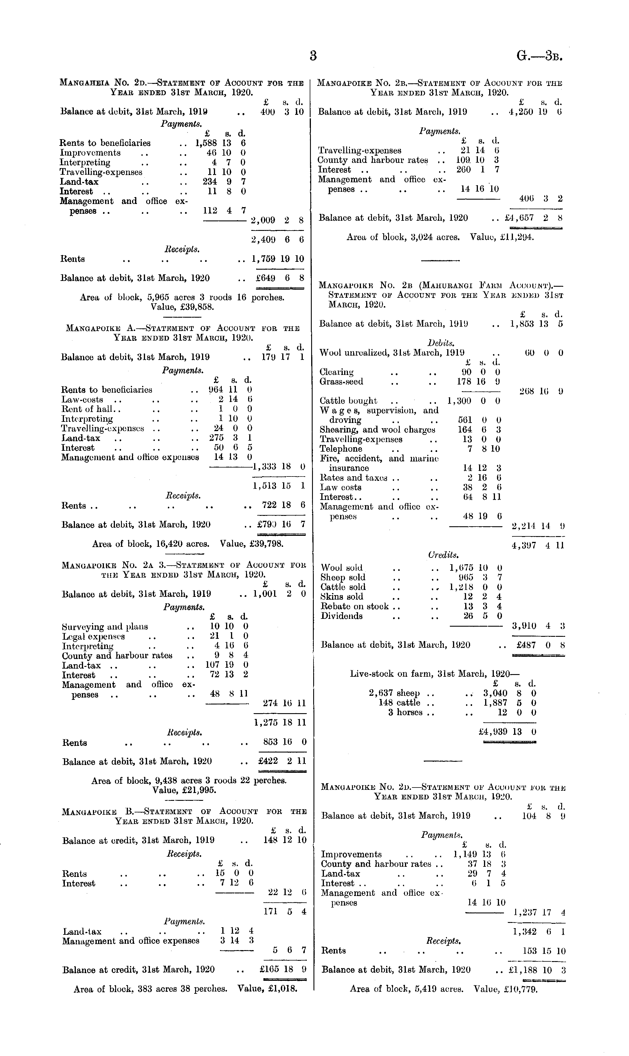 Mangaheia No. 2d.—Statement of Account for the Manoapoike No. 2b.—Statement of Account for the Year ended 31st March, 1920. Year ended 31st March, 1920. £ s. d. £ s. d. Balance at debit, 31st March, 1919 .. 400 310 Balance at debit, 31st March, 1919 .. 4,250 19 6 Payments. £ s. d. Payments. Rents to beneficiaries .. 1,588 13 6 £ s. d. Improvements .. .. 46 10 0 Travelling-expenses .. 21 14 0 Interpreting .. .. 4 7 0 County and harbour rates .. 109 10 3 Travelling-expenses" '.'. 11 10 0 Interest .. .. .. 200 1 7 Land-tax .. .. 234 9 7 Management and office exInterest .. .. .. 11 8 0 penses .. .. .. 14 10 10 Management and office ex- 4 °6 3 2 penses .. .. .. 112 4 7 2 009 2 8 Balance at debit, 31st March, 1920 .. £4,057 2 8 2 409 6 0 Area of block, 3,024 acres. Value, £11,294. Receipts. Rents .. .. .. .. 1,759 19 10 Balance at debit, 31st March, 1920 .. £649 6 8 Mangapoike No. 2b (Mahurangi Farm Account). — Area of block, 5,905 acres 3 roods 10 porches. Statement of Account for the Year ended 31st Value, £39,858. March, 1920. £ s. d. Mangapoike A—Statement of Account for the Balance at debit, 3ist March, 1919 .. 1,853 13 5 Year ended 31st March, 1920. ~ , ~ £ s d Debits. Balance at debit, 31st March, 1919 .. 179 17 l" Wool unrealized, 31st March, 1919 00 0 0 £ s. d. Payments. Clearing .. .. 90 0 0 £ s. d. Grass-seed .. .. 178 10 9 Rents to bonoficiaries .. 904 II 0 9(jy jg 9 Law-costs .. .. .. 214 0 Cattle bought .. .. 1,300 0 0 Rent of hall.. .. .. 10 0 Wages, supervision, and Interpreting .. .. 1 10 0 droving .. .. 50.1 0 0 Travelling-expenses .. .. 24 0 0 Shearing, and wool charges 164 0 3 Land-tax .. .. .. 275 3 1 Travelling-expenses .. 13 0 0 Interest .. .. .. 50 0 5 Telephone .. .. 7 810 Management and office expenses 14 13 0 Fire, accident, and marine 1,333 18 0 insurance 14 12 3 ' —' Rates and taxes .. .. 2 10 0 1,513 15 1 Law costs .. .. 38 2 0 Receipts. _ Interest.. .. .. 04 8 11 Rents .. .. .. .. .. 722 18 6 Management and office c.\penses .. .. 48 19 6 Balance at debit, 31st March, 1920 .. £79;) 10 7 2,214 14 9 Area of block, 10,420 acres. Value, £39,798. 4,397 4 11 Credits. Mangapoike No. 2a 3.—Statement of Account for Wool sold .. .. 1,075 10 0 the Year ended 31st March, 1920. Sheet) sold '.'. '905 3 7 * s - d - Cattle sold .. .. 1,218 0 0 Balance at debit, 31st March, 1919 .. 1,001 2 0 (Skins sold 12 2 4 Payments. lie bate on stock .. .. 13 3 4 £ s. d. Dividends .. .. 20 5 0 Surveying and plans .. 10 10 0 3,910 4 3 Legal expenses .. .. 21 I 0 Interpreting .. .. 410 0 Balance at debit, 31st March, 1920 .. £487 0 8 County and harbour rates .. 9 8 4 1 —1 — ' **=m^ Land-tax .. .. .. 107 19 0 Interest .. .. .. 72 13 2 Live-stock on farm, 31st March, 1920 — Management and office ex- £ s. d. penses .. .. .. 48 811 2,037 sheep .. .. 3,040 8 0 274 10 11 148 cattle .. .. 1,887 5 0 3 horses .. .. 12 0 0 1,275 18 11 — Receipts. £4,939 13 0 Rents .. .. .. 853 10 0 Balance at debit, 31st March, 1920 .. £422 2 11 Area of block, 9,438 acres 3 roods 22 perches. ~ „ „ A Value £21 995. Mangapoike No. 2d.—Statement of Account for the ' '_ Year ended 31st March, 1920. Mangapoike 8.-Statement of Account for the Balance at debit, 31st March, 1919 .. 104 %li Year ended 31st March, 1920. Balance at credit, 31st March, 1919 .. 148 12 10 Receipts. Improvements .. .. 1,149 1.3 (i £ s. d. County and harbour rates .. 37 18 3 Rents .. .. .. 15 0 0 Land-tax .. .. 29 7 4 Interest .. .. .. 7 12 6 Interest .. .. .. 0 15 22 12 0 Management and office expenses 1.4 16 10 171 5 4 1,237 17 4 Payments. .— Land-tax .. .. .. 1 12 4 1,342 6 1 Management and office expenses 3 14 3 Receipts. 5 0 7 Rents .. .. .. .. 153 15 10 Balance at credit, 31st March, 1920 .. £105 18 9 Balance at debit, 31st March, 1920 ..£l,lBB 10 3 Area of block, 383 acres 38 perches. Value, £1,018. Area of block, 5,419 acres. Value, £10,779.