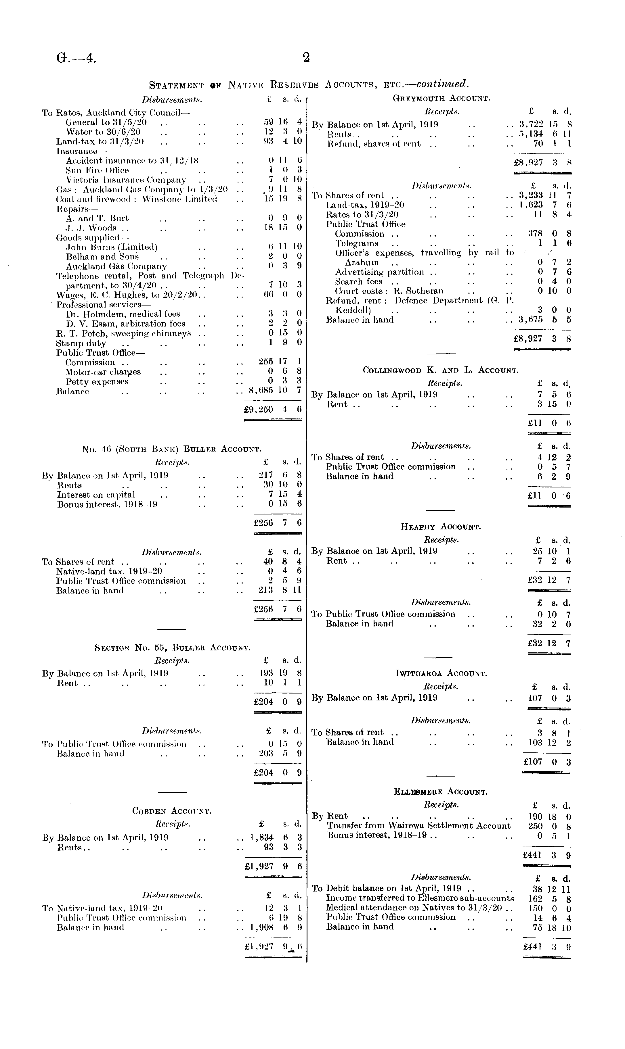 Statement »f Native Reserves Accounts, etc. — continued. Disbursements. £ s. d. Gruymouth Account. To Rates, Auckland City Council— Receipts. £ s. d. General to 31/5/20 .. .. .. 59 16 4By Balance on Ist April, 1919 .. ..3,722 15 8 Water to 30/6/20 12 3 0 ' ~,,,„,,, ./ 0(134 6 ~ Land-tax to 31/3/20 .. .. .. 98 110 Refund, shares of rent .. .. .. 70 1 1 Insurance — Accident insurance to 31/12/18 0 11 6 £g 927 -J s Sun Fire Office .. .. .. 10 3 ... 1-Z. Victoria Insurance Company .. 7 010 (las: Auckland (!as Company t„ 4/3/20 .. ,9 11 «~~_ 1. . Disbursements. £ S. d. Coal and lircw l:\VinstoiicLiiiiitcil .. 15 19 8 Co 8D&M! of Mt .. .. .. .. 3,233 II 7 Rennirs - Land-tax, 1919-20 .. .. .. 1,623 7 6 A. and T.Burt 0 9 0 Rates to 31/3/20 11 8 4 J.J.Woods 18 15 0 I'ul.lic Trust OfficeGoods supplied- Commission 178 0 8 John Burns (Limited) .. .. 6 1110 Iclegrams .. 11 6 Belham and Sons .. .. 20 0 Officer's expenses, travelling by mil to . Auckland Gas Company '.. .. 03 9 Arahura . ll a Telephone rental, Post and Telegraph Do- Advertising partition 0 7 6 partment, to 30/4/20 7 10 3 Search tees 0 4 0 Wages, B.C. Hughes, to 20/2/20.. .. 66 0 0 (ourt costs: R. Sotheran ■• •• 010 0 Professional services- H ."";• ''f 11 * : Defence Department (G. P. Dr. Holmdem, medical fees .. .. 3 3 0 rvcddell) 3 0 0 D. V. Esam, arbitration fees .. .. 2 2 0 Balance m hand 3,b75 5 5 R. T. Petch, sweeping chimneys .... 0 15 0 Stamp duty 19 0 ™<-> 11 6 S Public Trust Office— Commission .. .. .. .. 255 17 I Motor-car charges .. .. .. 0 6 8 Collingwood K. and L. Account. Petty expenses .. .. .. 0 3 3 Receipts. £ s. d. Balance B'(iBs8 ' (i85 10 7By Balance on Ist April, 1 ill 9 .. .. 75 6 £9,250 4 6 Rent •• •• • •• 315 " — £1] 0 (i No. 46 (South Bank) Buller Account. Disbursements. ii s. d. „ . . .. , To Shares of rent .. .. .. .. 412 2 Kereipt.-. b s, <i. Public Trust Office commission .. .. 0 5 7 By Balance on Ist April, 1919 .. .. 217 6 8 Balance in hand .. .. .. 6 2 9 Rents .. .. .. . . 30 10 0 Interest on capital .. .. .. 7 15 4 £11 o (i Bonus interest, 1918-19 .. .. 0 15 6 £2GO 7 6 Heaphy Account. Receipts. £ s. d. Disbursements. £ s. d. By Balance on Ist April, 1919 .. .. 25 10 1 To Shares of rent .. .. .. .. 40 8 4 Rent .. .. .. .. .. 726 Native-land tax, 1919-20 .. .. 0 4 6 Public Trust Office commission .. .. 2 5 9 £32 12 7 Balance in hand .. .. .. 213 8 11 —■ Disbursements. £ s. d. To Public Trust Office commission .. .. 010 7 Balance in hand .. .. .. 32 2 0 £32 12 7 Section No. 55, Buller Account. Receipts. £ s. d. By Balance on Ist April, 1919 .. .. 193 19 8 Iwituaroa Account. ' Rent 10 ] ' Receipts. £ B . d. £204 0 9 By Balance on Ist April, 1919 .. .. 107 O 3 Disbursements. £ s. d. Disbursements. £ s. .1. To Shares of rent .. .. .. .. 3 8 1 To Public Trust Office commission .. .. 015 0 Balance in hand .. .. .. 103 12 2 Balance in hand .. .. .. 203 5 9 £107 0 3 £204 0 9 i rMMMMIT^ Ellbsmere Account. ~ . Receipts. £ s . d. Cobden Account. ~ .. ,„. ~ By Rent .. .. .. .. 190 18 0 Receipts. £ s. d. Transfer from Wairewa Settlement Account 250 0 8 By Balance on Ist April. 1919 .. .. 1,834 6 3 Bonus interest, 1918-19 .. .. .. 05 1 Rents.. .. .. .. .. 93 3 3 £441 3 9 £1,927 9 0 == ===== Disbursements. £ g. d. To Debit balance on Ist April, 1919 .. .. 38 12 11 Disbursements. £ s. .1. I niuine transferred to Ellesmcre sub-accounts 162 5 8 To Native-land tax, 1919-20 .. .. 12 3 I Medical attendance on Natives to 31/3/20 . . 150 0 0 Public Trust Offioe commission .. .. 6 19 8 Public Trust Office commission .. .. 14 6 4 Balance in hand .. .. .. 1,908 6 9 I'm lance in hand .. .. .. 75 18 10 £1,927 9_Ji £441 3 9