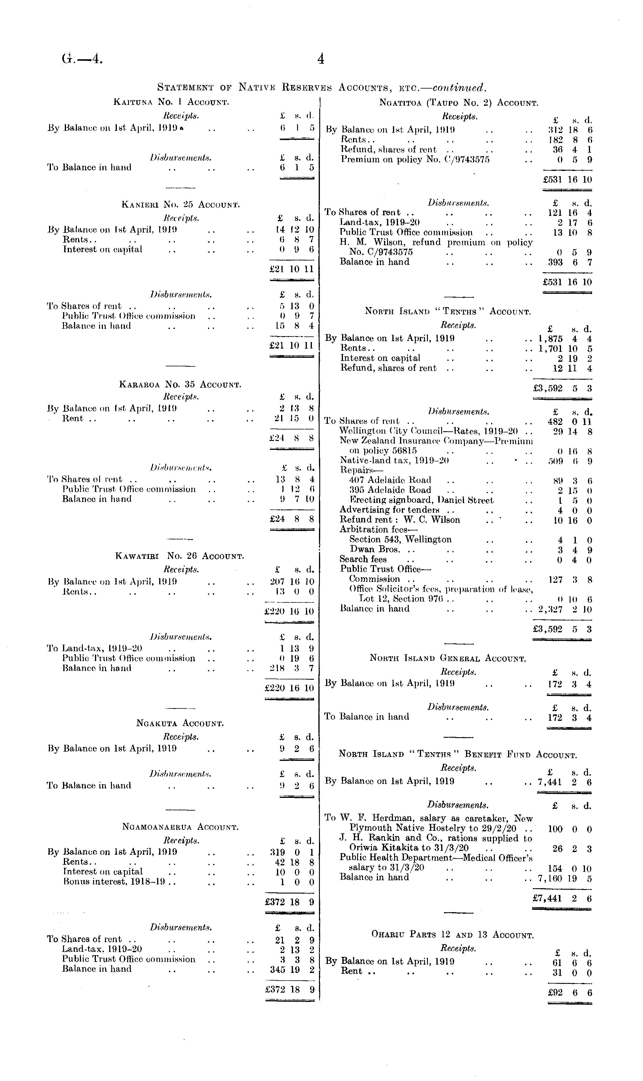Statement of Native .Reserves Accounts, etc. — continued. Kaitcna No. I Account. Nuatitoa (Taupo No. 2) Account. Receipts. £ s. .1. Receipts. £ j By Balance on Ist April, 1919« .. .. 6 15 By Balance on lsl April. 1919 .. .. 312 18 6 ' Rents.. .. .. .. 182 8 6 Refund, shares of rent . . . . . . 36 4 1 Disbursements. £ s. d. Premium on policy No. ('/9743575 .. 0 5 9 To Balance in hand .. .. .. 6 15 ' £531 16 10 Kanieri No. 25 Account. Disbursements. £ s. d. . . ~i 'I'o Shares of rent .. .. .. 121 16 4 /•«'<'<?><*• £ »• d - Land-tax, 1919-20 2 17 6 By Balance on Ist April, 1919 .. .. 14 12 10 Public Trust Office commission .. .. 13 10 8 Rents.. .. .. .. .. 6 8 7 H. M. Wilson, refund premium on policy Interest on capital .. .. .. 0 9 6 No. C/ 9743575 .. .. .. 0 5 9 Balance in hand .. .. .. 393 6 7 £21 10 11 —"——" £531 16 10 Disbursements. £ s. d. ~ To Shares of rent .. .. .. .. 5 13 0 , T , „ m „ . t> vi- tit , ~,. ~ „ -, North Island lunths Account. Public I rust Office commission .. .. 0 9 7 Balance in hand .. .. .. 15 8 4 Receipts. £ H j — By Balance on Ist April, 1919 .. .. 1,875 4 4 £21 10 11 Bents.. .. .. .. .. 1,701 10 5 ~—"~* — Interest on capital .. . . .. 219 2 Refund, shares of rent . . .. . . 12 11 4 Kar/Iroa No. 35 Account. £3 .gj g 3 Receipts. £ s. d. By Balance on Ist April, 1919 .. .. 2 13 8 Disbursements. £ s. d. R ent •• •• •• •• •• 21 15 0 To Shares of rent .. .. .. .. 482 011 — Wellington City Council— Rates, 1919-20 .. 29 14 8 £** * ° New Zealand Insurance Company—Premium '"" = on policy 56815 .. .. .. 016 8 Native-land tax, 1919-2(1 .. • .. 509 6 9 Disbursement*. £ s. d. Repairs To Shares ol rent .. .. .. .. 13 8 4 407 Adelaide Road .. .. . . 89 3 0 Public Trust Offioe commission .. .. I 12 (i 395 Adelaide Road .. .. .. 215 0 Balanco in hand .. .. .. 9 7 10 Ereoting signboard, Daniel Street .. 16 0 Advertising for tenders .. .. .. 400 £24 8 8 Refund rent :W. C. Wilson ..' .. 10 18 0 Arbitration fees—■ Section 543, Wellington .. .. 4 1 0 ~ „- . I)wan Bros. .. .. .. .. 3 4 9 Kawatiri No. 26 Account. Search fees . . .. .. .. 0 4 0 Receipts. £ s. d. Public Trust Office— By Balance on Ist April, 1919 .. .. 207 16 10 Commission .. .. .. .. 127 3 8 Rents 13 0 0 Office Solicitor s fees, preparation of lease, Lot 12, Section 976 . . . . . . 0 10 6 £220 16 10 Balance in hand .. .. .. 2,327 2 10 £3,592 5 3 Disbursements. £ s. d. To Land-tax, 1919-20 .. .. .. L 13 9 Public Trust Office, commission .. .. 019 6 North Island Cen eral Account. Balance in hand 218 3 7 Receipts. £ s. d. £220 16 10 Balance on Ist April, 1919 .. .. 172 3 4 Disbursements. £ s. d. To Balance in hand . . .. .. 172 3 4 Ngakuta Account. ' Receipts. £ s. d. ———■ By Balance on Ist April, 1919 .. .. 9 2 6 « turn >> t. th . J 1 ._,___ North Island Tenths Benefit Fund Account. Disbursements. £ s. d. £ S. d. To Balance in hand 9 2 6 By Balance on Ist April, 1919 .. •• 7,441 2 6 Disbursements. £ s. d. To W. E. Hcrdman, salary as caretaker, New Ngamoanaebua Account. Plymouth Native Hostelry to 29/2/20 .. 100 (I (I Receipts £ s d B ar, ki n an< l Co., rations supplied to By Balance on Ist April, 1919 ' .. .. 319 0 1 0™K«»t»31/3/2(l 26 2 3 Rpntni d.9 is s Public Health Department—Medical Officer s Interest on capital 7 7 7 10 0 0 31/3/20 .. 154.110 Bonus interest. 1918-19 .. 1 0 0 lUlilUo ° m halld 7 ' ltio 19 5 £372 18 9 £I>Ul1 > Ul ' 2 « Disbursements. £ s. d. _ To Shares of rent 212 9 Oharkt Parts 12 and 13 Account. Land-tax, 1919-20 .. .. .. 213 2 Receipts. £ s d Public Trust Office commission .. .. 3 3 8 By Balance on Ist April, 1919 .. .. 61 6 6 Balance in hand .. .. .. 345 19 2 Rent .. .. .. .. .. 310 0 •M 72 18_» £92 6 6