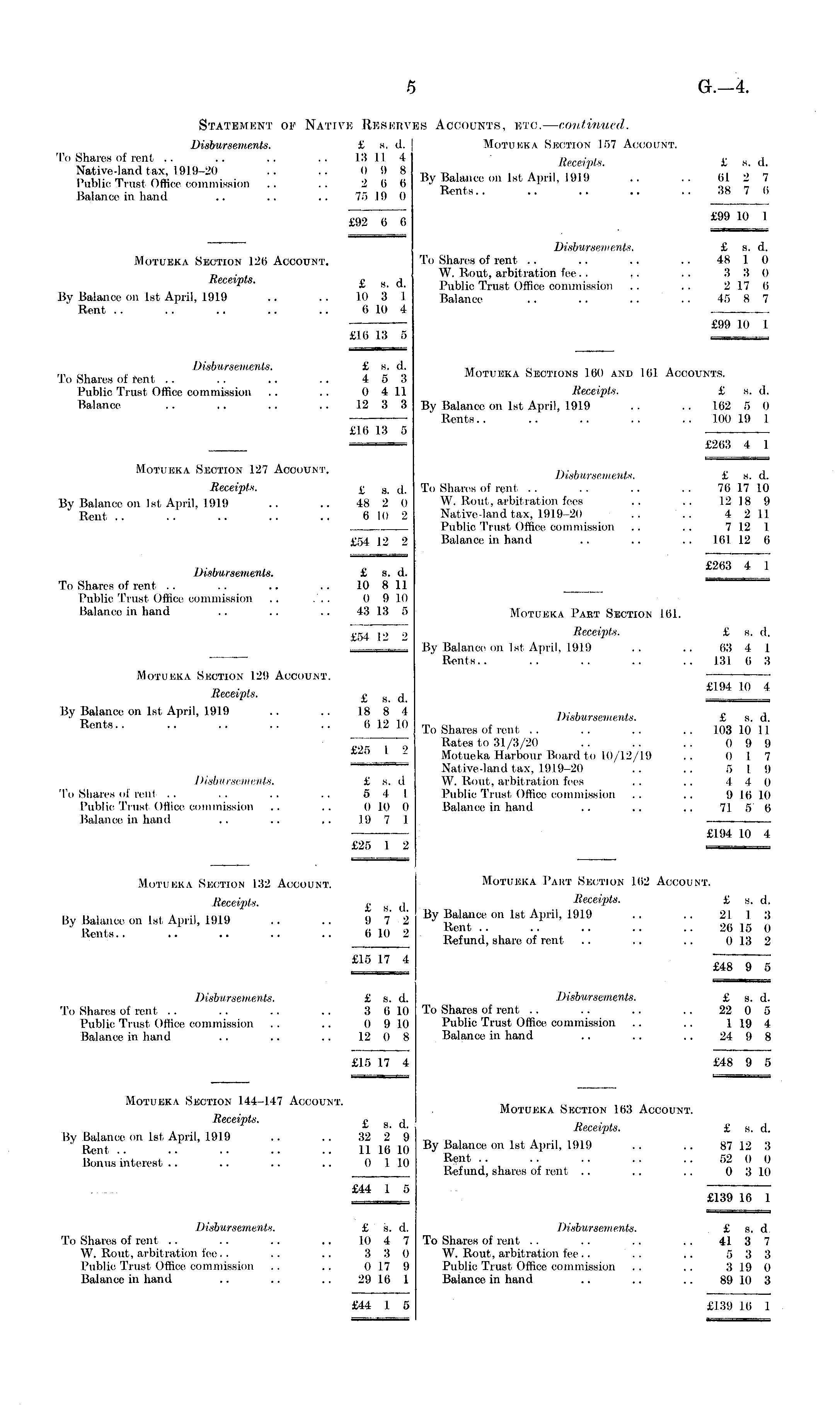 Statement of Native Reserves Accounts, etc. — continued. Disbursements. £ s, d. MotuBKA Section 157 Account. To Shares of rent .. .. .. .. 13 11 4 Receipts £ s d Native-land tax, 1919-20 .. .. 0 9 8 „ „ , , . . ~ ~.,., " ... '~' ' Public Trust Office commission .. .. 2 6 6 By Balance on Ist Apnl, 1919 .. 6.1 2 7 Balance in hand 75 19 0 Ren,K 3R 7 b £92 6 6 £9!)1 ° ' Disbursements. £ s. d. Motueka Section 126 Account. To Shares of rent .. .. .. .. 48 1 0 „ • , W. Rout, arbitration lee.. ~ .. 3 3 0 " £ s. d. Public Trust Office commission .. . . 217 6 By Balance on Ist April, 1919 .. .. 10 3 1 Balance .. .. .. .. 45 8 7 Rent .. .. .. .. .. 6 10 4 — £99 10 1 £10 13 5 =_=«= Disbursements. £ s. d. ~ „ ..,,, ~., , To Shares of rent 453 Motueka Sections 160 and I (,1 Accounts. Public Trust Office commission .. .. 0 411 Receipts. £ s. d. Balance .. .. .. .. 12 3 3 By Balance on Ist April, 1919 .. .. 162 5 0 Rents.. .. .. .. .. 100 19 I £16 13 5 — =—=—= £263 4 1 Motueka Section 127 Account. n-i„ ... ±- /i Disbursements. i. s. d. Receipts. £ s , j. To Shares of rent .. . . .. .. 76 17 10 By Balance on Ist April. 1919 .. .. 48 2 0 W. Rout, arbitration fees .. .. 12 18 9 Rent .. .. .. .. .. 6 10 2 Native-land tax, 1919-20 .. .. 4 2 11 . Public Trust Office commission .. .. 7 12 1 £54 12 2 Balance in hand .. .. . . 161 12 6 .... , „ £263 4 1 Disbursements. £ s. d. To Shares of rent .. .. .. .. 10 8 11 Public Trust Office commission .. ... 0 910 Balance in hand .. .. .. 43 1.3 5 Motueka Part Section 161. £54 ,2 2 Receipts. £ s. d. I_l By Balance on Ist April, 1919 .. .. 63 4 1 Rents.. .. .. .. .. 131 6 3 Motueka Section 129 Account. ■ „ . , £194 10 4 Receipts. £ g _ d ____ By Balance on Ist April, 1919 .. .. 18 8 4 n:i„, ... „, a r •' t, ~ ,„ ,~ Itisbiiisi'iiiiiils. £ s. d. Rents 6 12 10 To g hares Qf ren( , 103 10 1.1 or "7 Ratea t0 31/3/20 .. .. . . 0 9 9 *^ 5 L ' Motueka Harbour Board to 10/12/19 .. 0 17 Native-land tax, 1919-20 .. .. 5 19 Disbursements. £ s. d VV. Bout, arbitration fees . . .. 4 4 0 To Shares of rent .. .. .. .. 5 4 1 Public Trust Office commission .. .. 9 16 10 Public Trust Office, commission .. .. 0 10 0 Balance in hand .. .. .. 71 5 6 Balance in hand .. .. .. .19 7 1 —.—■———. £194 10 4 £25 1 2 _________ Motueka Section 132 Account. Motueka I'aut Section 162 Account. Receipts. £ d Receipts. £ 9 . d. By Balance on Ist April, 1919 .. .. 972 By Balance on Ist April, 1919 .. .. 2113 Rents.. .. 610 2 "'i" V , V 2 « « 0 Refund, share of rent .. .. . . 0 13 2 £15i7 4 _2TT~6 Disbursements. £ s. d. Disbursements. £ s. d. To Shares of rent .. .. .. .. 3 610 To Shares of rent . . .. .. .. 22 0 5 Public Trust Office commission . . .. 0 9 10 Public Trust Office commission .. .. 1 19 4 Balance in hand .. .. .. 12 0 8 Balance in hand .. .. .. 24 9 8 £15 17 4 £48 9 5 Motueka Section 144-147 Account. , r „ .„„ , Motueka Section 163 Account. ecetp ' b - £ s. d. Receipts. £ s. d. By Balance on Ist April, 1919 .. .. 32 2 9 „ „ , , , . ~ ,„,„ Rent.. .. .. .. 1116 10 By Balance on Ist April, 1919 .. .. 87 12 3 Bonus interest 7 '.'. '.'. '.'. 01 10 , " c " " " 82 0 0 ________ Refund, shares of rent .. .. .. 0 310 Ui 1 5 Disbursements. £ s. d. Disbursements. £ s. d. To Shares of rent .. .. .. .. 10 4 7 To Shares of rent .. .. .. . . 41 3 7 W. Rout, arbitration fee.. .. .. 3 3 0 W. Rout, arbitration fee. ■ .. .. 5 3 3 Public Trust Office commission .. .. 0 17 9 Public Trust Office commission . . .. 3 19 0 Balance in hand .. .. .. 29 16 1 Balance in hand .. .. .. 89 10 3 £44 I. 5 £139 16 1