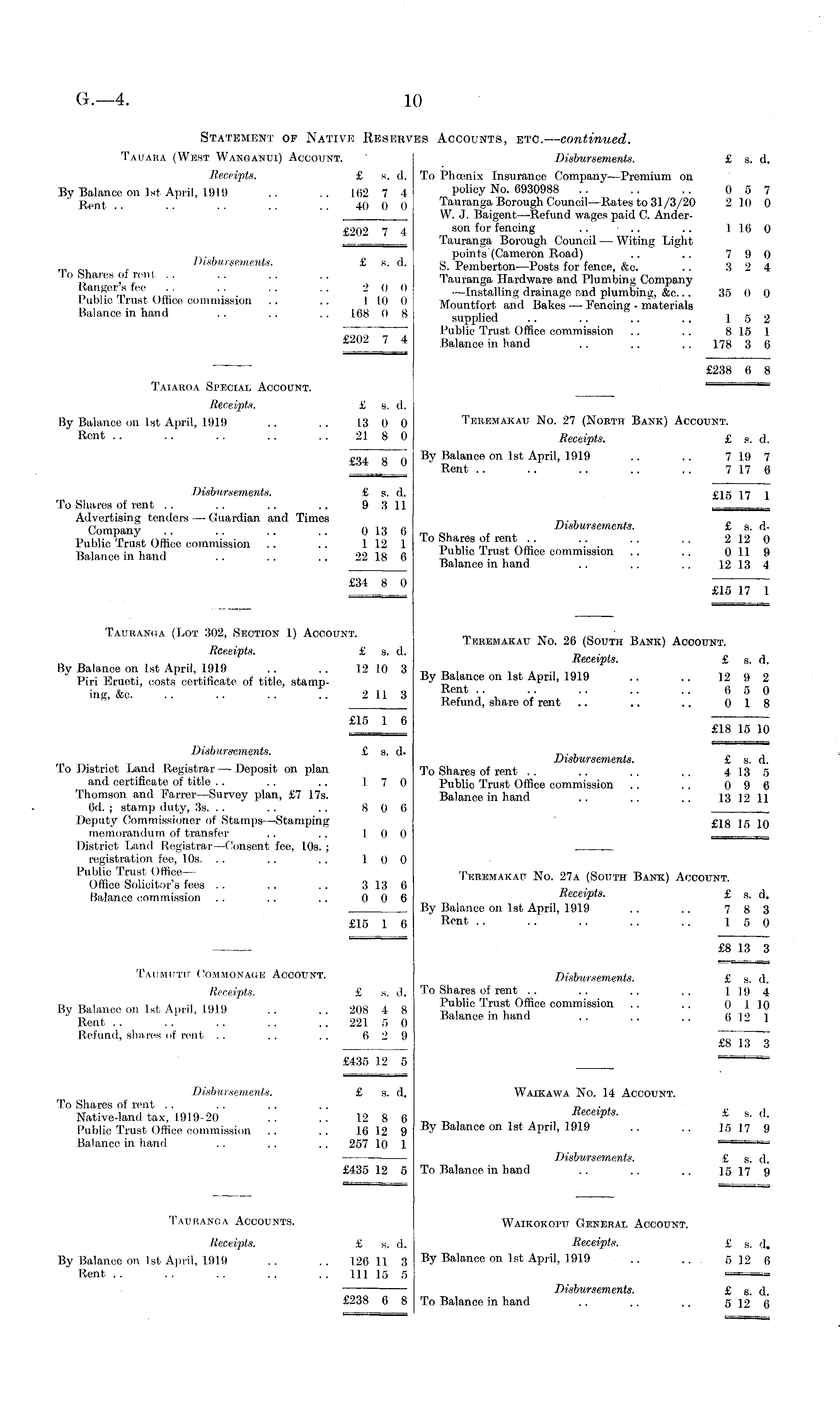 Statement of Native Resebves Accounts, etc. — continued. Tauara (West Wanganui) Account. Disbursements. £ s. d. Receipts. £ s. d. To Phoenix Insurance Company—Premium on By Balance on Ist April, 1919 .. .. 162 7 4 policy No. 6930988 .. .. .. 0 5 7 Rent .. .. .. 40 0 0 Tauranga Borough Council —Rates to 31/3/20 2 10 0 ________ W. J, Baigent—Refund wages paid C. Ander£2o2 7 4 aon * or fencing .. .. .. 116 0 __________ Tauranga Borough Council — Witing Light points (Cameron Road) .. .. 7 9 0 Disbursements. £ s. d. g. p em berton—Posts for fence, &c. .. 3 2 4 I o Shares of rent .. .. .. .. Tauranga Hardware and Plumbing Company ™y. Btee '' -.- . •• ■■ '- ,° ° —Installing drainage s>nd plumbing, &c... 35 0 0 übho Trust Office commission .. .. 110 0 Mountfort and Bakes — Fencing - materials Balance in hand . . .. .. 168 0 8 supplied I 5 2 " Public Trust Office commission .. .. 8 15 1 £20274 Balance in hand .. .. .. 178 3 6 £238 6 8 Taiaroa Special Account. _________ Receipts. £ s. d. By Balance on Ist April, 1919 .. .. 13 0 0 Tkremakau No. 27 (North Bank) Account. Rent . . .. .. .. .. 21 8 0 Receipts. £s. d. £34 8 0 By Balance on Ist April, 1919 .. .. 7 19 7 _' Rent .. .. .. .. .. 7 17 6 Disbursements. £ s. d. £15 17 j To Shares of rent .. . . .. .. 9 3 11 , Advertising tenders — Guardian and Times „. , Company 0136 „ _ , , Disbursements. £s. dPublic Trust Office commission .. .. 112 1 Tt > i*"* S. "fU" V. " " *.? ° Balance in hand 22 18 6 _" I b,, ° Tnl f °f oe commission .. .. 011 9 Balance in hand .. .. .. 12 1.3 4 _!____ ._~i7~l Taubanga (Lot 302, Section 1) Account. r „ ■_■____ t, Tkremakau No. 26 (South Bank) Account. Receipts. £ s. d. _ . , „ Receipts. £ s. d. By Balance on Ist April, 1919 .. .. 12 10 3 „ ~ , . . . ~ ~,„ Piri Eructi, costs certificate of title, stamp- By Balance on Ist April, 1919 .. .. 12 9 2 i„g &o. . 2 1.1 3 Rent 6 5 0 Refund, share of rent .. .. .. 0 18 £15 L 6 T^iJTo Disbursements. £ s. d- „. . Disbursements. £ s. d. To District Land Registrar — Deposit on plan To Shares of rent .. .. .. 4 13 5 and certificate of title .. .. .. 17 0 Public Trust Office commission .. 7 09 6 Thomson and Farrer—Survey plan, £7 17s. Balance in hand .. .. .. 13 12 11 6d. ; stamp duty, 3s. .. .. .. 8 0 6 Deputy Commissioner of Stamps—Stamping £jg jg jq memorandum of transfer .. . . 10 0 . . District Land Registrar—Consent fee, 10s. ; registration fee, 10s. .. .. . . LOO Pn }_? T _*s ? ffi ?V Tkremakau No. 27a (South BahNk) Account. Office Solicitor s fees .. .. .. 3 13 6 _ Balance commission .. .. .. 0 0 6 Receipts. £ g, d. By Balance on Ist April, 1919 .. .. 7 8 3 £15 1 6 Ben* 15 0 £8 13 3 Taumutu Commonage Account. Disbursements. £ s d Receipts. £ g. d. To Shares of rent .. .. .. .. 1 19 4 By Balance on Ist April, 1919 .. .. 208 4 8 {'"blic Trust Office commission .. 0 110 Rent .... . . .. 221 5 0 BalaUCe m himd "l 2 ] Refund, shares of rent ...... C> 2 i) _ 0 £435 12 5 r_ ' Disbursements. £ g, d. Waikawa No. 14 Account. To Shares of rent ........ „ Native-land tax, 1919-20 .. .. 12 8 6 ueeeipts. _ 8 . _, Public Trust Office commission .. 16 12 9 By Balance on Ist April, 1919 .. .. 15 17 9 Balance in hand .. .. .. 257 10 1 ' = Disbursements. £ g. d. £435 12 5 To Balance in hand . . .. .. 15 17 9 Tauranga Accounts. Waikokopu General Account. Receipts. £ s. d. Receipts. £ s . d. By Balance on Ist April, 1919 .. .. 126 11 3 By Balance on Ist April, 1919 .. .. 512 6 Rent . . .. .. .. 11l 15 5 .—-—-_, Disbursements. £ s d £238 6 8 To Balance in hand .. .. .. 512 6