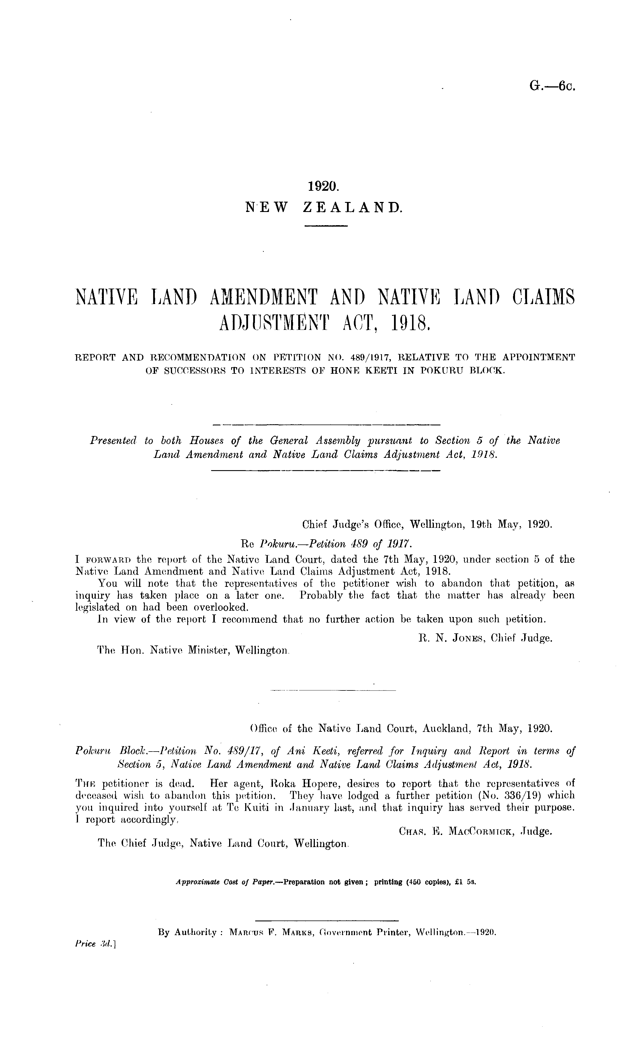 Chief Judge's Office, Wellington, 19th May, 1920. Re Pokuru.—Petition 489 of 1917. I forward the report of the Native Land Court, dated the 7th May, 1920, under section 5 of the Native Land Amendment and Native Land Claims Adjustment Act, 1918. You will note that the representatives of the petitioner wish to abandon that petition, as inquiry has taken place on a later one. Probably the fact that the matter has already been legislated on had been overlooked. In view of the report I recommend that no further action be, taken upon such petition. R. N. Jones, Chief Judge. The Hon. Native Minister, Wellington. Office of the Native Land Court, Auckland, 7th May, 1920. Pohurit Block. — Petition No. 489/17, of Ani Keeti, referred for Inquiry and Report in terms of Section 5, Native Land Amendment and Native Land Claims Adjustment Act, 1918. The petitioner is dead. Her agent, Roka Hopere, desires to report that the representatives of deceased wish to abandon this petition. They have lodged a further petition (No. 336/19) which you inquired into yourself at Te Kttiti in January last, and that inquiry has served their purpose. I report accordingly. Char. E. MacGormick, Judge. The Chief Judge, Native Land Court, Wellington.