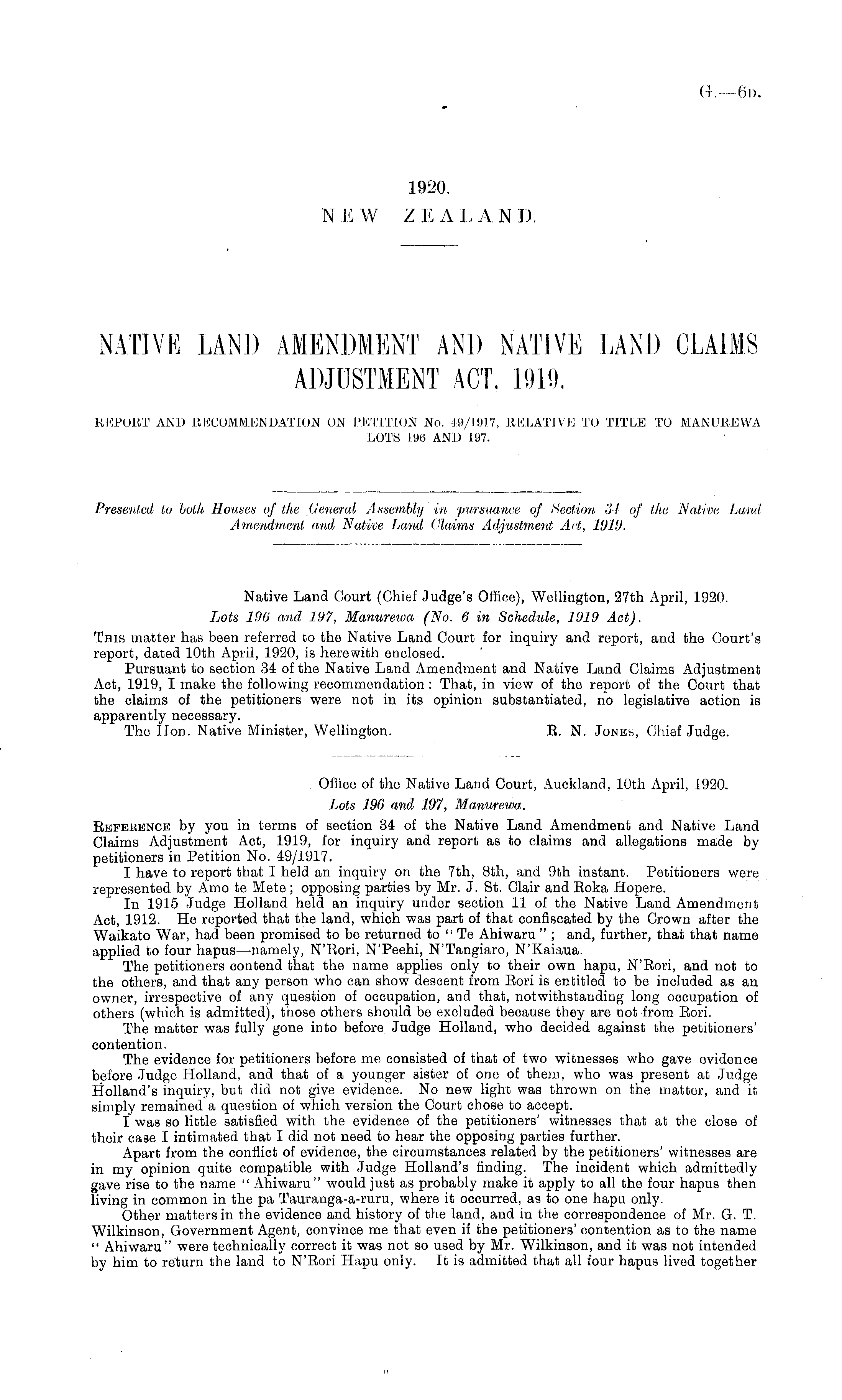 Native Land Court (Chief Judge's Office), Wellington, 27th April, 1920. Lots 196 and 197, Manurewa (No. 6 in Schedide, 1919 Act). This matter has been referred to the Native Land Court for inquiry and report, and the Court's report, dated 10th April, .1920, is herewith enclosed. Pursuant to section 34 of the Native Land Amendment and Native Land Claims Adjustment Act, 1919, I make the following recommendation : That, in view of the report of the Court that the claims of the petitioners were not in its opinion substantiated, no legislative action is apparently necessary. The Hon. Native Minister, Wellington. R. N. Jones, Chief Judge. Office of the Native Land Court, Auckland, 10th April, 1920. Lots 190 and 197, Manurewa. Reference by you in terms of section 34 of the Native Land Amendment and Native Land Claims Adjustment Act, 1919, for inquiry and report as to claims and allegations made by petitioners in Petition No. 49/1917. I have to report that I held an inquiry on the 7th, Bth, and 9th instant. Petitioners were represented by Amo te Mete; opposing parties by Mr. J. St. Clair and Roka Flopere. In 1915 Judge Holland held an inquiry under section 11 of the Native Land Amendment Act, 1912. He reported that the land, which was part of that confiscated by the Crown after the Waikato War, had been promised to be returned to " Te Ahiwaru " ; and, further, that that name applied to four hapus —namely, N'Rori, N'Peehi, N'Tangiaro, N'Kaiaua. The petitioners contend that the name applies only to their own hapu, N'Rori, and not to the others, and that any person who can show descent from Eori is entitled to be included as an owner, irrespective of any question of occupation, and that, notwithstanding long occupation of others (which is admitted), those others should be excluded because they are not from Rori. The matter was fully gone into before Judge Holland, who decided against the petitioners' contention. The evidence for petitioners before me consisted of that of two witnesses who gave evidence before Judge Holland, and that of a younger sister of one of them, who was present at Judge Holland's inquiry, but did not give evidence. No new light was thrown on the matter, and it simply remained a question of which version the Court chose to accept. I was so little satisfied with the evidence of the petitioners' witnesses that at the close of their case I intimated that I did not need to hear the opposing parties further. Apart from the conflict of evidence, the circumstances related by the petitioners' witnesses are in my opinion quite compatible with Judge Holland's finding. The incident which admittedly gave rise to the name " Ahiwaru" would just as probably make it apply to all the four hapus then living in common in the pa Tauranga-a-ruru, where it occurred, as to one hapu only. Other matters in the evidence and history of the land, and in the correspondence of Mr. G. T. Wilkinson, Government Agent, convince me that even if the petitioners' contention as to the name " Ahiwaru" were technically correct it was not so used by Mr. Wilkinson, and it was not intended by him to return the land to N'Rori Hapu only. It is admitted that all four hapus lived together