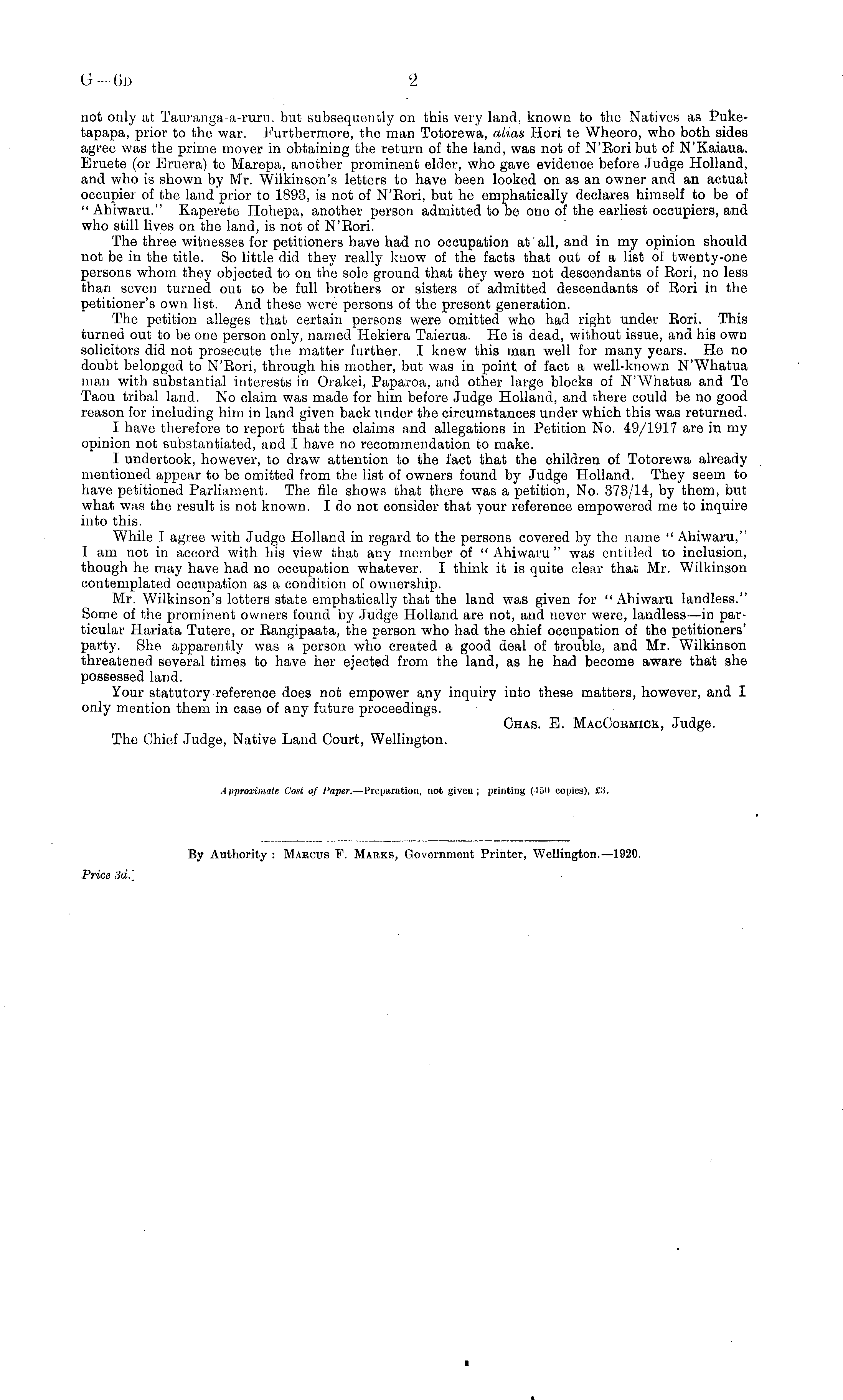 not only at Tauranga-a-ruru. but subsequently on this very land, known to the Natives as Puketapapa, prior to the war. Furthermore, the man Totorewa, alias Hori te Wheoro, who both sides agree was the prime mover in obtaining the return of the land, was not of N'Rori but of N'Kaiaua. Eruete (or Eruera) te Marepa, another prominent elder, who gave evidence before Judge Holland, and who is shown by Mr. Wilkinson's letters to have been looked on as an owner and an actual occupier of the land prior to 1893, is not of N'Rori, but he emphatically declares himself to be of "Ahiwaru." Kaperete Hohepa, another person admitted to bo one of the earliest occupiers, and who still lives on the land, is not of N'Rori. The three witnesses for petitioners have had no occupation at all, and in my opinion should not be in the title. So little did they really know of the facts that out of a list of twenty-one persons whom they objected to on the sole ground that they were not descendants of Rori, no less than seven turned out to be full brothers or sisters of admitted descendants of Rori in the petitioner's own list. And these were persons of the present generation. The petition alleges that certain persons were omitted who had right under Rori. This turned out to be one person only, named Hekiera Taierua. He is dead, without issue, and his own solicitors did not prosecute the matter further. I knew this man well for many years. He no doubt belonged to N'Rori, through his mother, but was in point of fact a well-known N'Whatua man with substantial interests in Orakei, Paparoa, and other large blocks of N'Whatua and Tc Taou tribal land. No claim was made for him before Judge Holland, and there could be no good reason for including him in land given back under the circumstances under which this was returned. I have therefore to report that the claims and allegations in Petition No. 49/1917 are in my opinion not substantiated, and I have no recommendation to make. I undertook, however, to draw attention to the fact that the children of Totorewa already mentioned appear to be omitted from the list of owners found by Judge Holland. They seem to have petitioned Parliament. The file shows that there was a petition, No. 373/14, by them, but what was the result is not known. Ido not consider that your reference empowered me to inquire into this. While I agree with Judge Holland in regard to the persons covered by tho name " Ahiwaru," I am not in accord with his view that any member of " Ahiwaru" was entitled to inclusion, though he may have had no occupation whatever. I think it is quite clear that Mr. Wilkinson contemplated occupation as a condition of ownership. Mr. Wilkinson's letters state emphatically that the land was given for "Ahiwaru landless." Some of the prominent owners found by Judge Holland are not, and never were, landless—in particular Hariata Tutere, or Rangipaata, the person who had the chief occupation of the petitioners' party. She, apparently was a person who created a good deal of trouble, and Mr. Wilkinson threatened several times to have her ejected from the land, as he had become aware that she possessed land. Your statutory reference does not empower any inquiry into these matters, however, and I only mention them in case of any future proceedings. Chas. E. MacCormick, Judge. The Chief Judge, Native Land Court, Wellington.