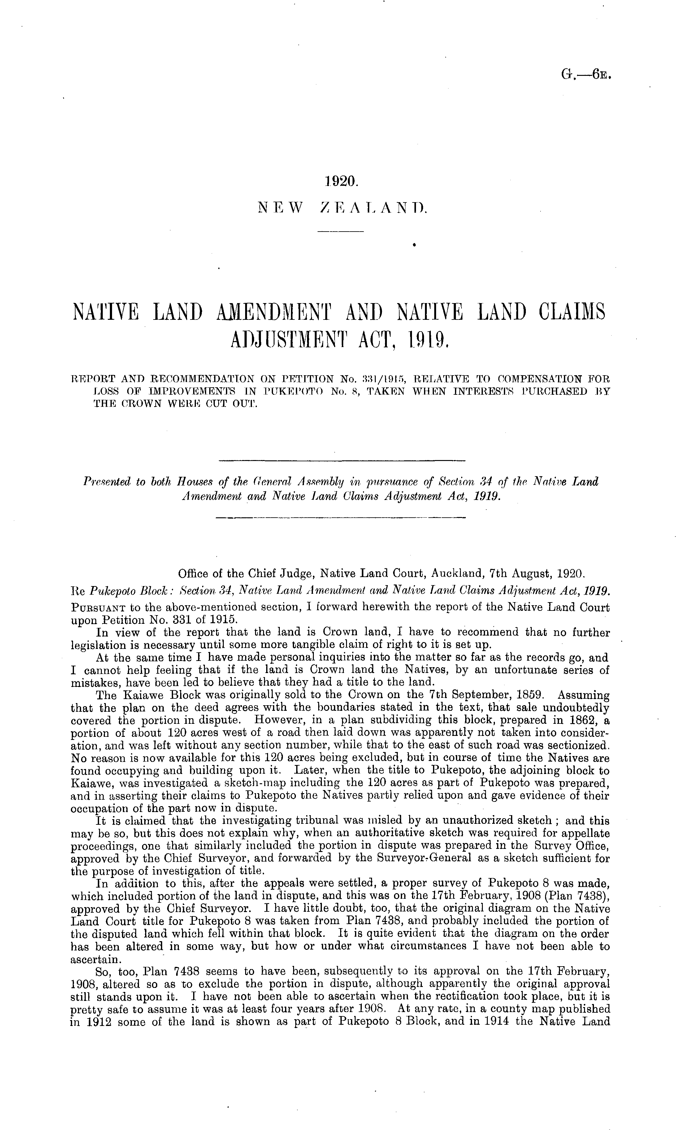 NATIVE LAND AMENDMENT AND NATIVE LAND CLAIMS ADJUSTMENT ACT, 1919. REPORT AND RECOMMENDATION ON PETITION No. 331/1915, RELATIVE TO COMPENSATION FOR LOSS OF IMPROVEMENTS IN PUKEPOTO No. 8, TAKEN WHEN INTERESTS PURCHASED BY THE CROWN WERE CUT OUT.