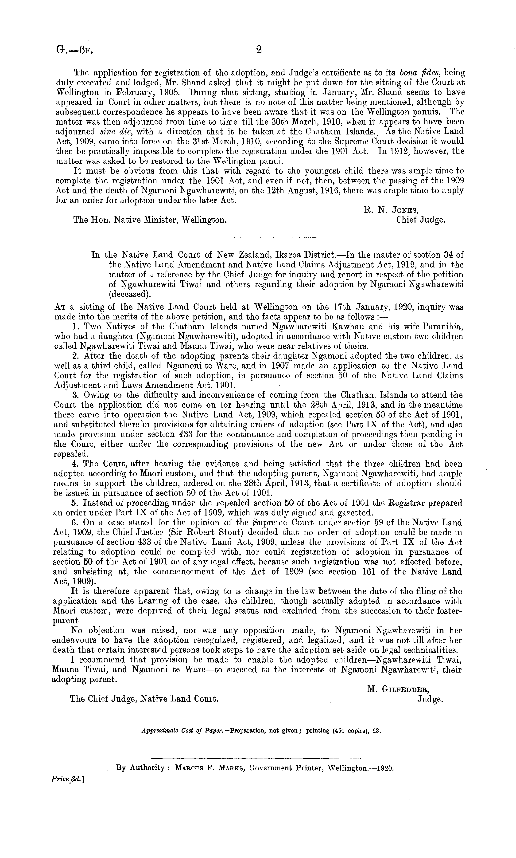 The application for registration of the adoption, and Judge's certificate as to its bona fides, being duly executed and lodged, Mr. Shand asked that it might be put down for the sitting of the Court at Wellington in February, 1908. During that sitting, starting in January, Mr. Shand seems to have appeared in Court in other matters, but there is no note of this matter being mentioned, although by subsequent correspondence he appears to have been aware that it was on tho Wellington panuis. The matter was then adjourned from time to time till the 30th March, 1910, when it appears to have been adjourned sine die, with a direction that it be taken at the Chatham Islands. As the Native Land Act, 1909, came into force on the 31st March, 1910, according to the Supreme Court decision it would then be practically impossible to complete the registration under the 1901 Act. In 1912, however, the matter was asked to bo restored to the Wellington panui. It must be obvious from this that with regard to the youngest child there was ample time to complete the registration under the 1901 Act, and even if not, then, between the passing of the 1909 Act and the death of Ngamoni Ngawharewiti, on the 12th August, 1916, there was ample time to apply for an order for adoption under the later Act. R. N. Jones, The Hon. Native Minister, Wellington. Chief Judge.
