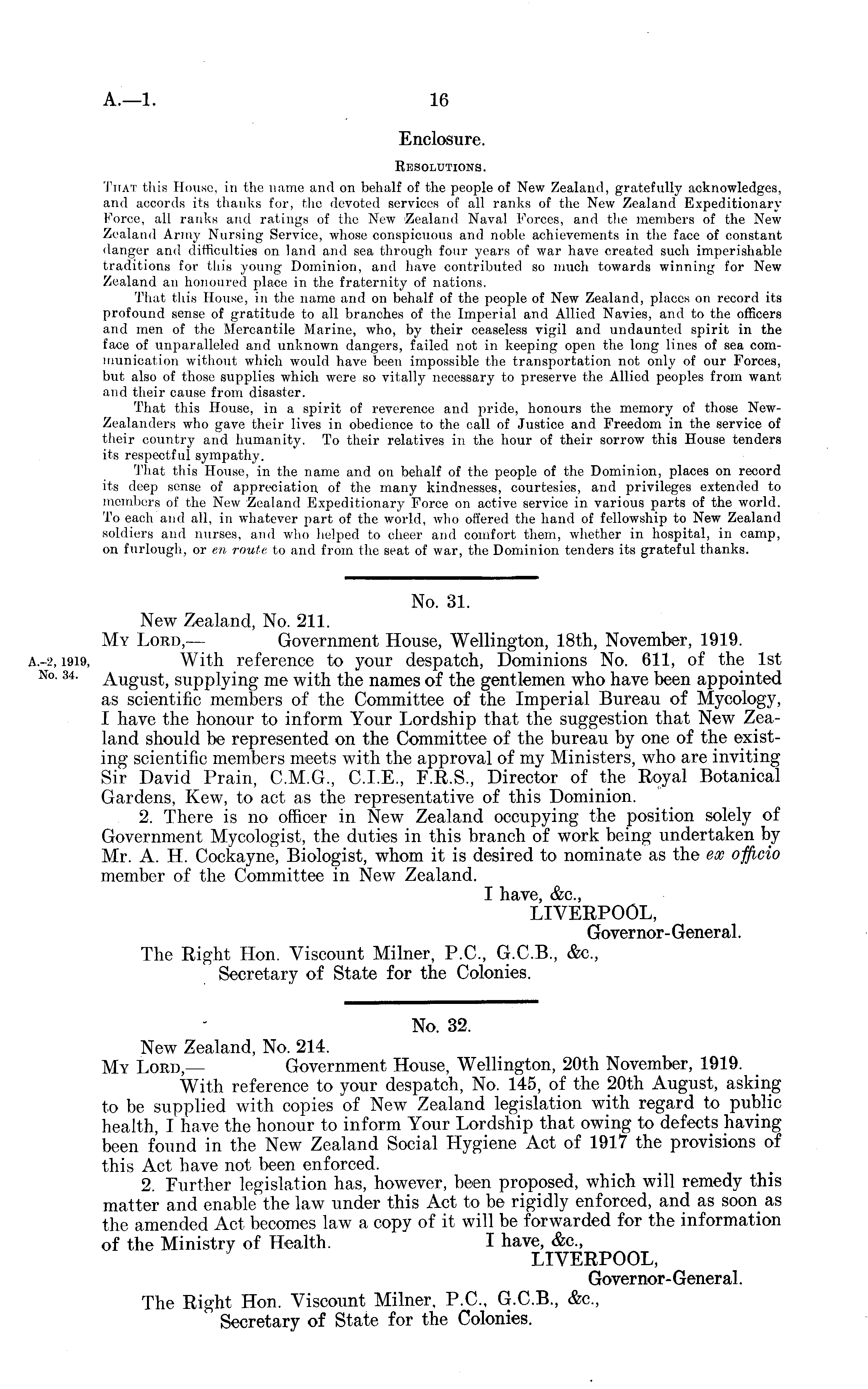 No. 31. New Zealand, No. 211. My Lord,— Government House, Wellington, 18th, November, 1919. With reference to your despatch, Dominions No. 611, of the Ist August, supplying me with the names of the gentlemen who have been appointed as scientific members of the Committee of the Imperial Bureau of Mycology, I have the honour to inform Your Lordship that the suggestion that New Zealand should be represented on the Committee of the bureau by one of the existing scientific members meets with the approval of my Ministers, who are inviting Sir David Pram, C.M.G., CLE., F.R.S, Director of the Royal Botanical Gardens, Kew, to act as the representative of this Dominion. 2. There is no officer in New Zealand occupying the position solely of Government Mycologist, the duties in this branch of work being undertaken by Mr. A. H. Cockayne, Biologist, whom it is desired to nominate as the ex officio member of the Committee in New Zealand. I have, &c, LIVERPOOL, Governor-General. The Right Hon. Viscount Milner, P.C, G.C.8., &c, Secretary of State for the Colonies.