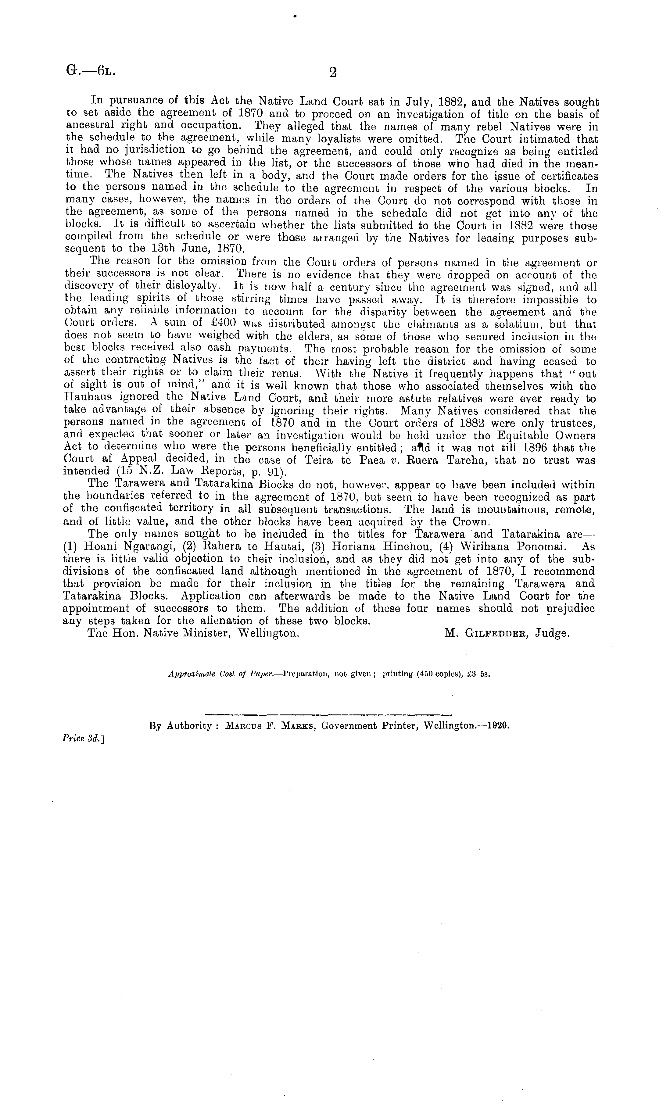 In pursuance of this Act the Native Land Court sat in July, 1882, and the Natives sought to set aside the agreement of 1870 and to proceed on an investigation of title on the basis of ancestral right and occupation. They alleged that the names of many rebel Natives were in the schedule to the agreement, while many loyalists were omitted. The Court intimated that it had no jurisdiction to go behind the agreement, and could only recognize as being entitled those whose names appeared in the list, or the successors of those who had died in the meantime. The Natives then left in a body, and the Court made orders for the issue of certificates to the persons named in the schedule to the agreement in respect of the various blocks. In many cases, however, the names in the orders of the Court do not correspond with those in the agreement, as some of the persons named in the schedule did not get into any of the blocks. It is difficult to ascertain whether the lists submitted to the Court in 1882 we're those compiled from the schedule or were those arranged by the Natives for leasing purposes subsequent to the 13th June, 1870. The reason for the omission from the Court orders of persons named in the agreement or their successors is not clear. There is no evidence that they were dropped on account of the discovery of their disloyalty. It is now half a century since the agreement was signed, and all the leading spirits of those stirring times have passed away. It is therefore impossible to obtain any reliable information to account for the disparity between the agreement and the Court orders. A sum of £400 was distributed amongst the claimants as a solatium, but that does not seem to have weighed with the elders, as some of those who secured inclusion in the best blocks received also cash payments. The most probable reason for the omission of some of the contracting Natives is the fact of their having left the district and having ceased to assert their rights or to claim their rents. With the Native it frequently happens that " out of sight is out of mind," and it is well known that those who associated themselves with the Ilauhaus ignored the Native Land Court, and their more astute relatives were ever ready to take advantage of their absence by ignoring their rights. Many Natives considered that the persons named in the agreement of 1870 and in the Court orders of 1882 were only trustees, and expected that sooner or later an investigation would be held under the Equitable Owners Act to determine who were the persons beneficially entitled ; aftd it was not till 1896 that the Court af Appeal decided, in the case of Teira te Paea v. Ruera Tareha, that no trust was intended (15 N.Z. Law Reports, p. 91). The Tarawera and Tatarakina Blocks do not, however, appear to have been included within the boundaries referred to in the agreement of 1870, but seem to have been recognized as part of the confiscated territory in all subsequent transactions. The land is mountainous, remote, and of little value, and the other blocks have been acquired by the Crown. The only names sought to be included in the titles for Tarawera and Tatarakina are— (1) Hoani Ngarangi, (2) Rahera te Hautai, (3) Horiana Hinehou, (4) Wirihana Ponomai. As there is little valid objection to their inclusion, and as they did not get into any of the subdivisions of the confiscated land although mentioned in the agreement of 1870, I recommend that provision be made for their inclusion in the titles for the remaining Tarawera and Tatarakina Blocks. Application can afterwards be made to the Native Land Court for the appointment of successors to them. The addition of these four names should not prejudice any steps taken for the alienation of these two blocks. The Hon. Native Minister, Wellington. M. Gilfedder, Judge.