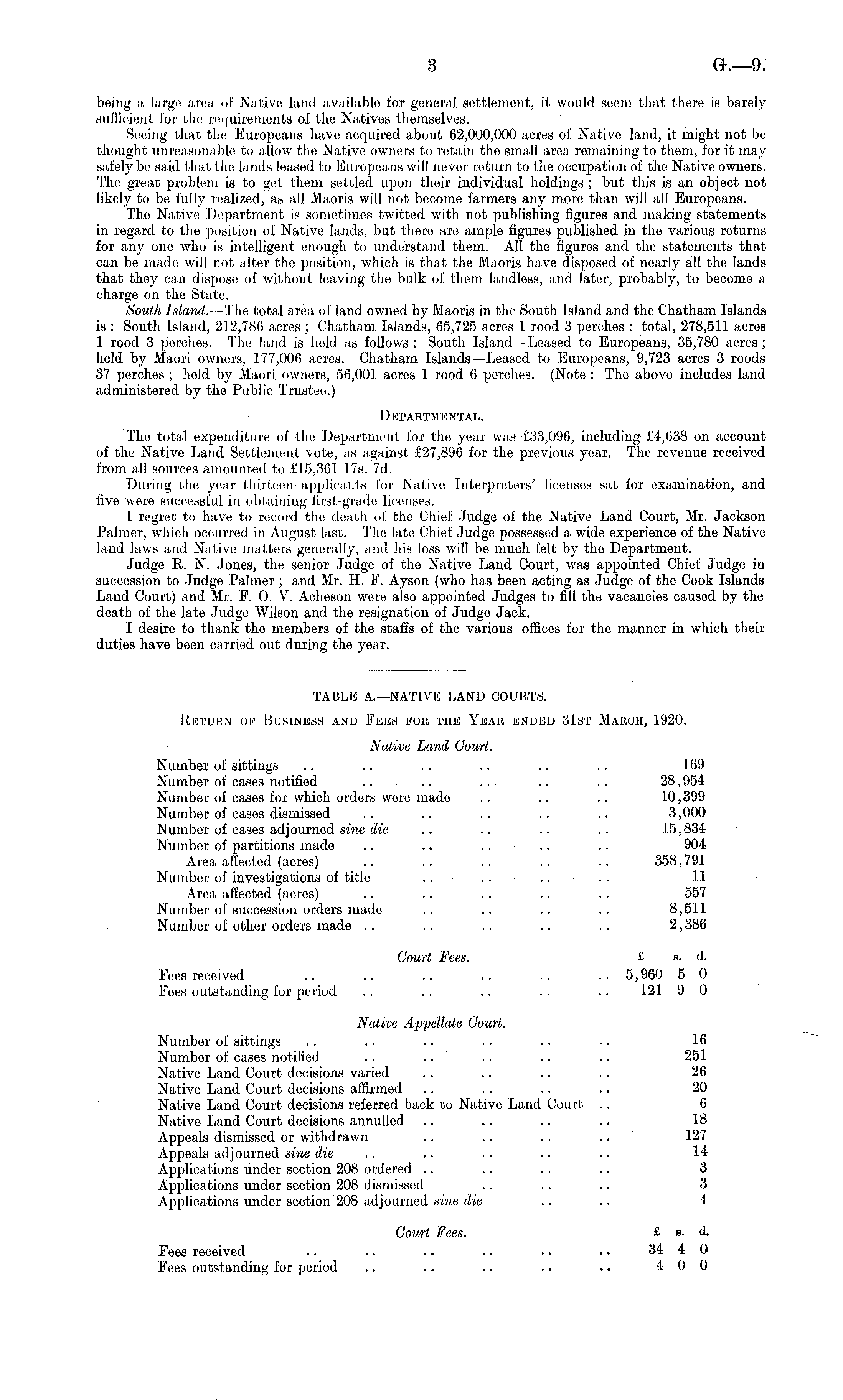 TABLE A.—NATEVE LAND COURTS. Return of Business and Fees for the Year ended 31st March, 1920. Native Land Court. Number of sittings .. .. .. .. .. .. 169 Number of cases notified .. .. .. .. .. 28,954 Number of cases for which orders were made .. .. .. 10,399 Number of cases dismissed .. .. .. .. .. 3,000 Number of cases adjourned sine die .. .. .. .. 15,834 Number of partitions made .. .. . . .. .. 904 Area affected (acres) .. .. .. .. .. 358,791 Number of investigations of title .... .. .. 11 Area affected (acres) .. .. .. .. .. 557 Number of succession orders made .. .. .. .. 8,511 Number of other orders made .. .. .. .. .. 2,386 Court Fees. £ s. d. Fees received .. .. .. .. .. .. 5,960 5 0 Fees outstanding for period . . .. ... . . .. 121 9 0 Native Appellate Court. Number of sittings .. .. .. .. .. .. 16 Number of cases notified .. .. .. .. .. 251 Native Land Court decisions varied .. .. .. .. 26 Native Land Court decisions affirmed .. .. .. .. 20 Native Land Court decisions referred back to Native Land Court .. 6 Native Land Court decisions annulled .. .. .. .. 18 Appeals dismissed or withdrawn .. .. .. .. 127 Appeals adjourned sine die .. .. .. .. 14 Applications under section 208 ordered .. .. .. .. 3 Applications under section 208 d ismissed .. .. .. 3 Applications under section 208 adjourned sine die .. .. 4 Court Fees. £ b. d. Fees received .. .. .. •. ■ • • • 34 4 0 Fees outstanding for period .. .. .. .. .. 4 0 0
