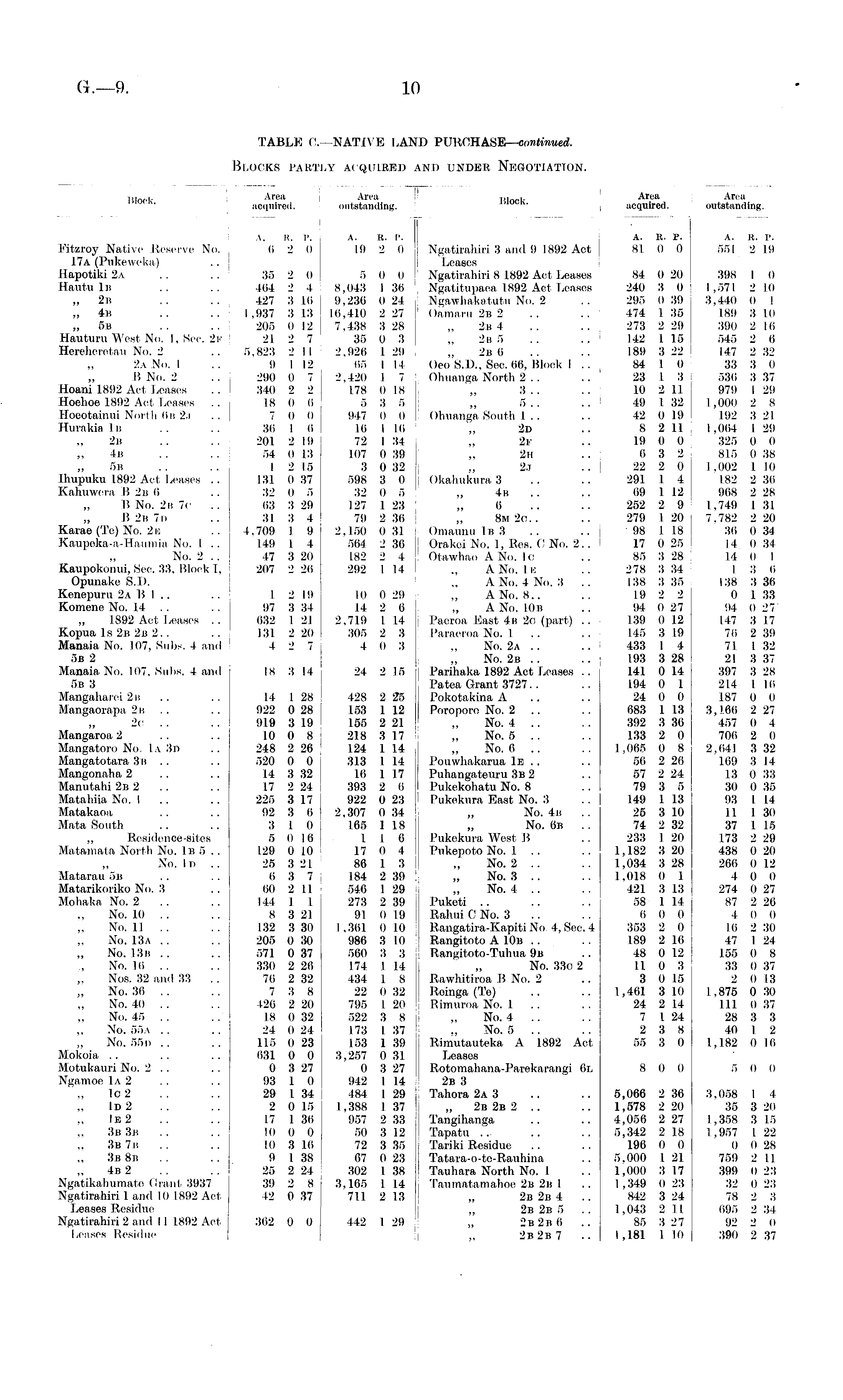 Block. i Area acquired. Area outstanding. Block-. i Ngatirahiri 3 and 9 1892 Act Leases Ngatirahiri 8 1892 Aet Leases Ngatitupaea 1892 Act Leases Ngawhakatutu No. 2 ! Oamaru 2b 2 . . 2b 4 2t) 5 2b 6 Geo S.D., Sec. 66, Block I . . , Ohuanga North 2 . . 3 . . ,, 5 . . Ohuanga South 1 . . 2d 2f 2h 2.t Okahukura 3 4e. 6 8m 2c. Omaunu IB 3 Orakei No. 1, Res. C No. 2.. Otawhao A No. lo A No. 1 b A No. 4 No. 3 .. A No. 8.. A No. 10b Paeroa East 4 b 2o (part) .. Paraeroa No. I .. No. 2a . . No. 2b .. Parihaka 1892 Act Leases .. Patea Grant 3727 Pokotakina A Poroporo No. 2 .. No. 4 . . No. 5 . . No. 6 .. Fouwhakarua Ik . . Puhangateuru 3b 2 Pukekohatu No. 8 Pukekura East No. 3 „ No. 4b „ No. 6b Pukokura West B Pukepoto No. 1 .. No. 2 . . No. 3 . . No. 4 .. Puketi Rahui C No. 3 .. Rangatira-Kapiti No 4, See. 4 Rangitoto A 10b . . llangitoto-Tuhua 9b No. 33o 2 Rawhitiroa B No. 2 Roinga (Te) Rimuroa No. 1 .. No. 4 No. 5 .. Rimutauteka A 1892 Act Leases Rotomahana-Parekarangi 6l 2b 3 Tahora 2a 3 2b 2b 2 .. Tangihanga Tapatu Tariki Residue Tatara-o-te-Rauhina Tauhara North No. 1 Taumatainahoe 2b 2b 1 „ 2b 2b 4 2b 2b 5 . . „ 2b 2b 6 2b2b7 .. Area acquired. A. R. P. 81 0 0 84 0 20 240 3 0 295 0 3!) 474 1 35 273 2 29 142 L 15 189 3 22 84 1 0 23 1 3 10 2 11 49 1 32 42 0 19 8 2 11 19 0 0 6 3 2 22 2 0 291 1 4 69 I 12 252 2 9 279 I 20 98 1 18 17 0 25 85 3 28 278 3 34 138 3 35 19 2 2 94 0 27 139 0 12 145 3 19 433 1 4 193 3 28 141 0 14 194 0 1 24 0 0 683 1 13 392 3 36 133 2 0 1.065 0 8 56 2 26 57 2 24 79 3 5 149 1 13 25 3 10 74 2 32 233 J 20 1,182 3 20 1,034 3 28 1.018 0 1 421 3 13 58 1 14 6 0 0 353 2 0 189 2 16 48 0 12 11 0 3 3 0 15 1,461 3 10 24 2 14 7 1 24 2 3 8 55 3 0 8 0 0 5.066 2 36 1,578 2 20 4,056 2 27 5,342 2 18 196 0 0 5.000 I 21 1,000 3 17 1,349 0 23 842 3 24 1,043 2 11 85 3 27 1,181 I 10 Area outstanding. Eitzroy Native Reserve No. 17a (Pukewcka) Hapotiki 2a Hautu In .. .. „ 2b „ 4b „ 5b Hauturu West No. I, Sec. 2k Hereheretau No. 2 .. 2a No. 1 B No. 2 Hoani 1892 Act Leases Hoehoe 1892 Aet Leases Hoeotainui North 6n 2,i Hurakla In 2b „ 4b 5b Ihupuku 1892 Act Leases .. Kahuwera B 2b 6 B No. 2 is 7c B 2b 7i> Karae (Te) No. 2 k Kaupoka-a-Hauniia No. 1 .. No. 2 .. Kaupokonui, See. 33, Block I, Opunake S.D. Kenepuru 2a B I .. Komene No. 14 1892 Aet Leases . . Kopua Is 2b 2b 2. . Manaia No. 107, Subs. 4 and 5b 2 Manaia No. 107, Subs. 4 and 5b 3 Mangaharei 2u Mangaorapa 2b 2c . . Mangaroa 2 Mangatoro No. 1a 3d Mangatotara 3n Mangonaha2 Manutahi 2b 2 Matahiia No. I .. Matakaoa Mata South „ Residence-sites Matamata North No. 1b 5 .. No. Id Matarau ob Matarikoriko No. 3 Mohaka No. 2 .. No. 10 . . No. 11 . . No. 13a . . No. 13b .. No. 16 Nos. 32 and 33 .. No. 36 No. 40 . . No. 45 .. No. 55a .. ,, No. 55n . . .. iVlotukauri No. 2 .. Ngamoe 1a 2 lo 2 Id 2 1e2 3b 3b 3b 7b 3b 8b 4b 2 Ngatikahumate Grant 3937 Ngatirahiri 1 and 10 1892 Act Leases Residue Ngatirahiri 2 and 11 1892 Aet Leases Residue A. it. p. 6 2 0 35 2 0 464 2 4 427 3 16 1,937 3 13 205 0 12 21 2 7 5.823 2 I I 9 I 12 290 0 7 340 2 2 18 0 (i 7 0 0 36 I 6 201 2 I!) 54 0 13 I 2 15 131 0 37 32 0 5 63 3 29 31 3 4 4.709 I 9 149 1 4 47 3 20 207 2 26 1 2 1!) 97 3 34 633 1 21 131 2 20 4 2 7 18 3 14 14 I 28 922 0 28 919 3 19 10 0 8 248 2 26 520 0 0 14 3 32 17 2 24 225 3 17 92 3 6 3 1 0 5 0 16 129 0 10 25 3 21 6 3 7 60 2 11 144 I 1 8 3 21 132 3 30 205 0 30 571 0 37 330 2 26 76 2 32 7 3 8 426 2 20 18 0 32 24 0 24 115 0 23 631 0 0 0 3 27 93 1 0 29 1 34 2 0 15 17 1 36 10 0 0 10 3 16 9 1 38 25 2 24 39 2 8 42 0 37 362 0 0 A. B. I'. 19 2 0 A. R. p. 551 2 19 5 0 0 8,043 1 36 9,236 0 24 16,410 2 27 7,438 3 28 35 0 3 2,926 1 29 65 I LI 2,420 1 7 1.78 0 18 5 3 5 947 0 0 16 I 16 72 I 34 107 0 3!) 3 0 32 598 3 0 32 0 5 127 1 23 79 2 36 2,150 0 31 564 2 36 182 2 4 292 I 14 II) 0 29 14 2 6 2,719 1 14 305 2 3 4 0 3 24 2 15 398 1 I) 1,571 2 10 3,440 0 I 189 3 1(1 390 2 16 545 2 ti 147 2 32 33 3 0 536 3 37 979 I 29 1,000 2 8 192 3 21 1.064 I 29 325 0 0 815 0 38 1,002 1 10 182 2 36 968 2 28 1.749 I 31 7.782 2 20 36 0 34 14 0 34 14 I) I 1 3 6 138 3 36 0 1 33 !)4 0 27 147 3 17 7(i 2 3!) 71 1 32 21 3 37 397 3 28 214 I l(i 187 0 t) 3,166 2 27 457 0 4 706 2 0 2,641 3 32 169 3 14 13 0 33 30 0 35 93 I 14 11 1 30 37 1 15 173 2 29 438 0 20 266 0 12 4 0 0 274 0 27 87 2 26 4 0 0 16 2 30 47 I 24 155 0 8 33 0 37 2 0 13 I,875 0 30 111 0 37 28 3 3 40 I 2 1,182 I) 16 428 2 25 153 1 12 155 2 21 218 3 17 124 1 14 313 I 14 16 I 17 393 2 6 922 0 23 2,307 0 34 165 1 1.8 1 I 6 17 0 4 86 1 3 184 2 39 546 1 29 273 2 39 91 0 19 1.361 0 10 986 3 10 560 3 3 174 1 14 434 1 8 22 0 32 795 I 20 522 3 8 173 I 37 153 I 39 3,257 0 31. 0 3 27 942 I 14 484 I 29 1.388 I 37 957 2 33 50 3 12 72 3 35 67 0 23 302 I 38 3,165 I 14 711 2 13 5 I) 0 3,058 I 4 35 3 20 1,358 3 15 1,957 I 22 I) 0 28 759 2 11 399 (1 23 32 (I 23 78 2 3 695 2 3-1 92 2 II 390 2 37 442 I 2!)
