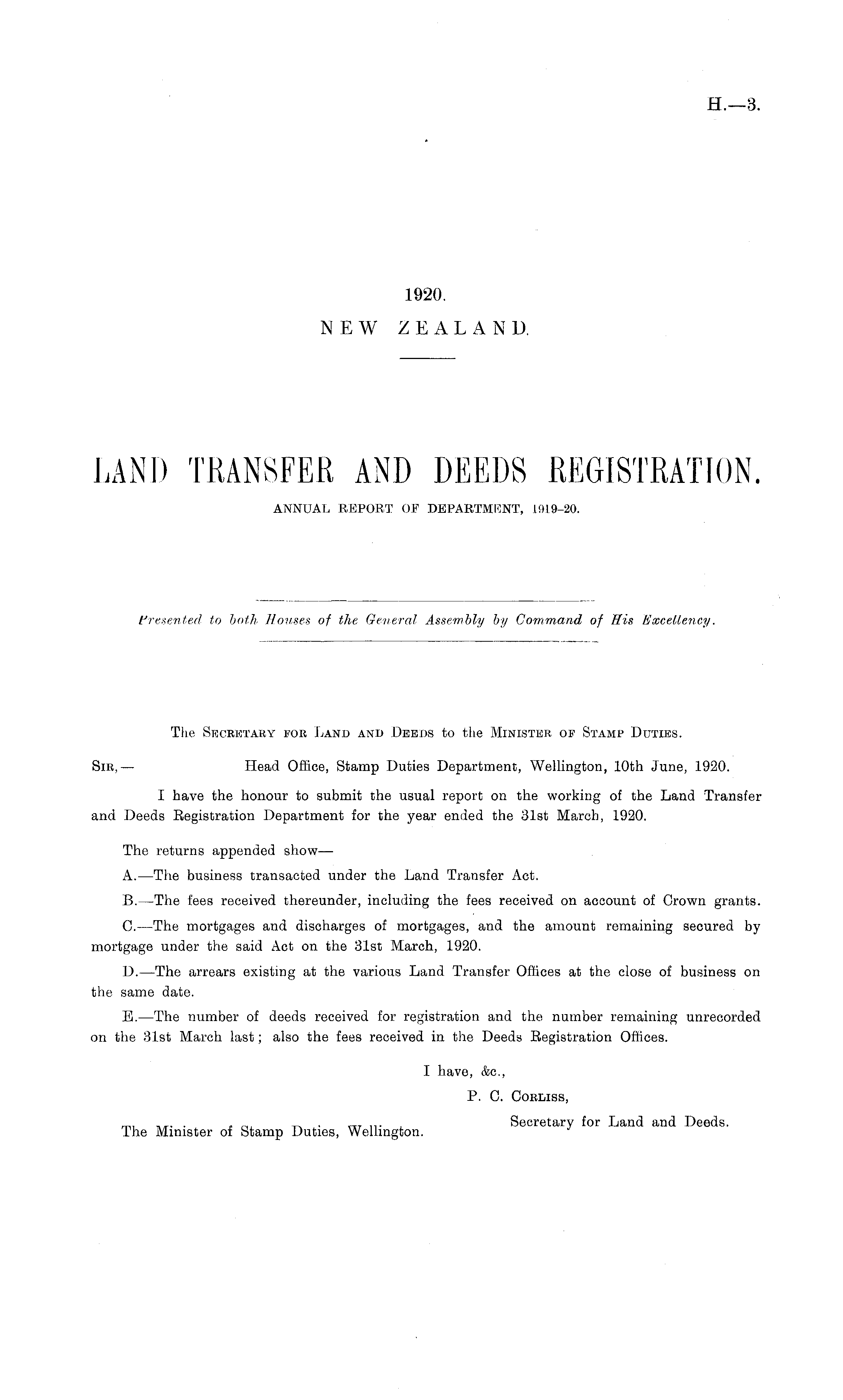 The Secretary for Land and Deeds to the Minister of Stamp Duties. Sir, — Head Office, Stamp Duties Department, Wellington, 10th June, 1920. I have the honour to submit the usual report on the working of the Land Transfer and Deeds Registration Department for the year ended the 31st March, 1920. The returns appended show— A.—The business transacted under the Land Transfer Act. B.—The fees received thereunder, including the fees received on account of Grown grants. o.—The mortgages and discharges of mortgages, and the amount remaining secured by mortgage under the said Act on the 31st March, 1920. D.—The arrears existing at the various Land Transfer Offices at the close of business on the same date. B.—The number of deeds received for registration and the number remaining unrecorded on the 31st March last; also the fees received in the Deeds Registration Offices. I have, &c, P. C. Corliss, _, ~, , ,„, _ . „. „. Secretary for Land and Deeds. The Minister of Stamp Duties, Wellington.