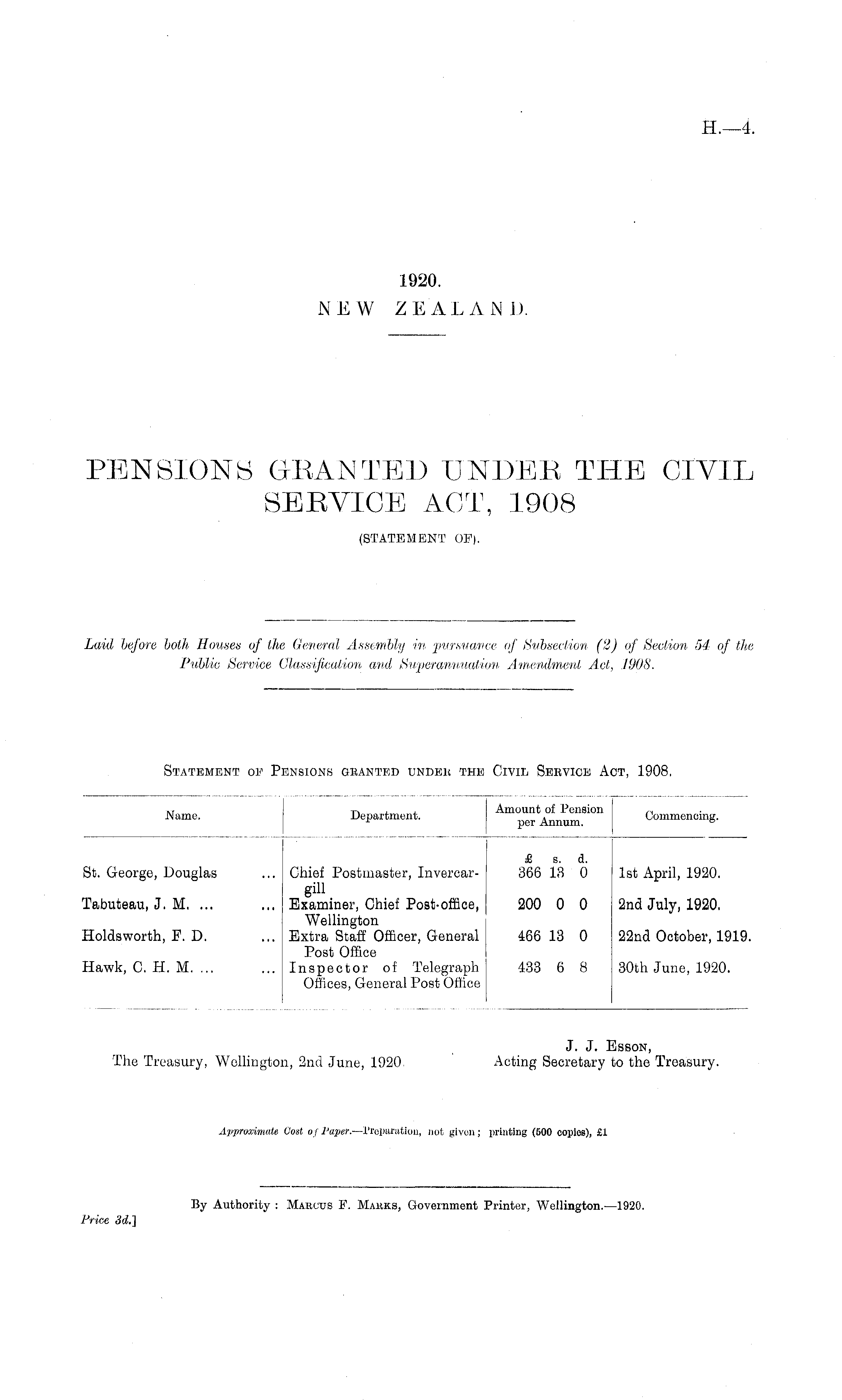 Name. Department. Amount of Pension per Annum. Commencing. St. George, Douglas Tabuteau, J. M. ... Holdsworth, F. D. Chief Postmaster, Invercargill Examiner, Chief Post-office, Wellington Extra Staff Officer, General Post Office Inspector of Telegraph Offices, General Post Office £ s. 366 18 200 0 466 13 d. 0 0 0 1st April, 1920. 2nd July, 1920. 22nd October, 1919 Hawk, C. H. M. ... 433 6 8 30th June, 1920.