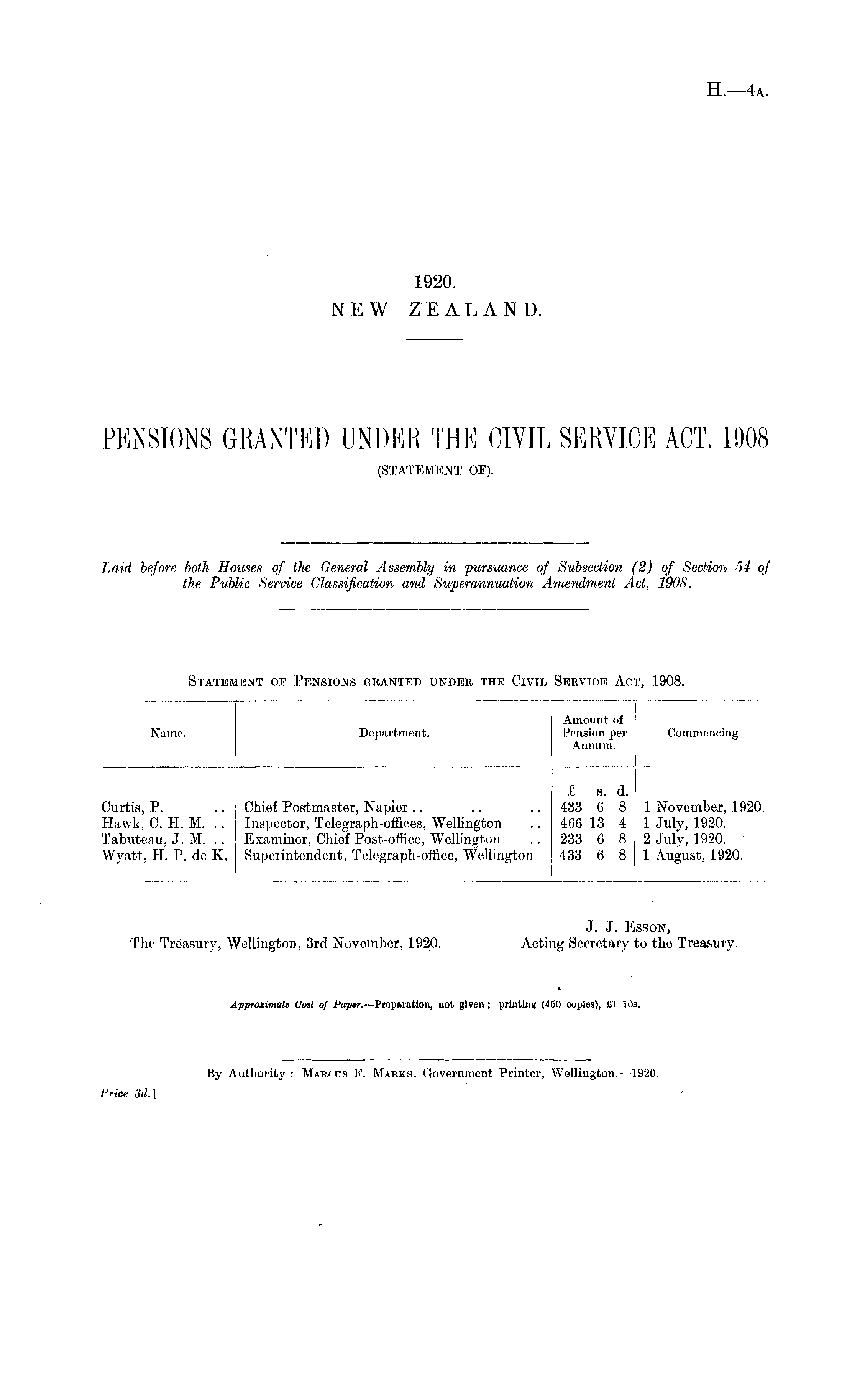 J. J. Esson, The Treasury, Wellington, 3rd November, 1920. Acting Secretary to the Treasury.