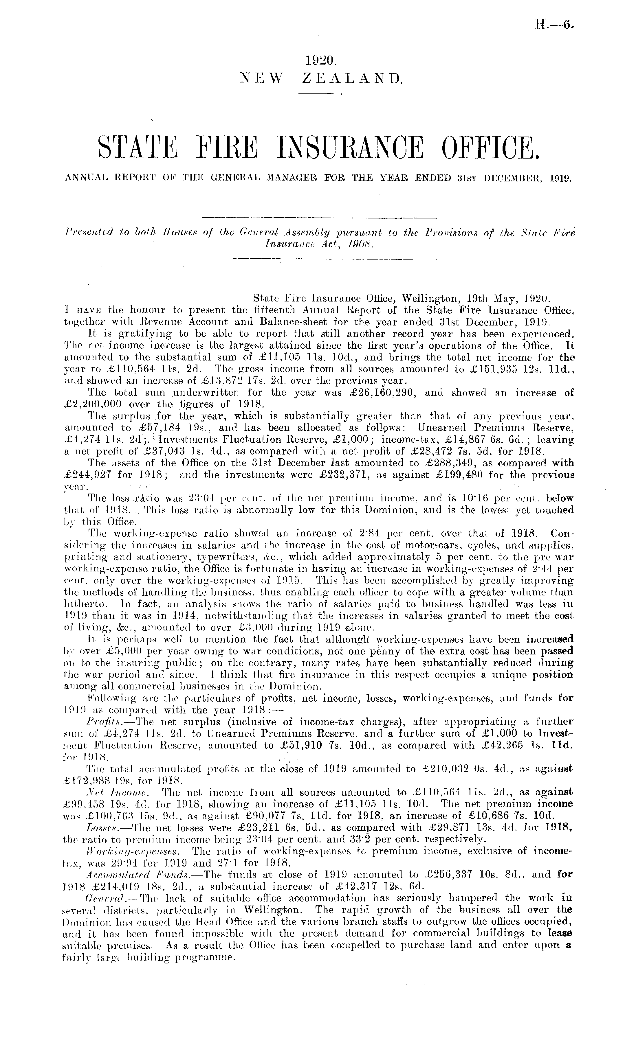 State Fire Insurance Office, Wellington, 19th May, 1920. I have the honour to present the fifteenth Annual Report of the State Fire Insurance Office, together with Revenue Account and Balance-sheet for the year ended 31st December, 1919. It is gratifying to be able to report that still another record year has been experienced. The net income increase is the largest attained since the first year's operations of the Office. It amounted to the substantial sum of £11,105 lis. 10d., and brings the total net income for the year to ,£110,564 lis. 2d. The gross income from all sources amounted to £151,935 12s. lid., and showed an increase of £13,872 17s. 2d. over the previous year. The total sum underwritten for the year was £26,160,290, and showed an increase of £2,200,000 over the figures of 1918. The surplus for the year, which is substantially greater than that of any previous year, amounted to £57,184 195., and has been allocated as follpws: Unearned Premiums Reserve, £4,274 lis. 2d;. Investments Fluctuation Reserve, £1,000; income-tax, £14,867 6s. 6d.; leaving a net profit of £37,043 Is. 4d., as compared with a net profit of £28,472 7s. sd. for 1918. The assets of the Office on the 31st December last amounted to £288,349, as compared with £244,927 for 1918; and the investments were £232,371, as against £199,480 for the previous year. '" The loss ratio was 23'04 per cent, ol' the net premium income, and is 10"16 per cent, below that of 1918. j This loss ratio is abnormally low for this Dominion, and is the lowest yet touched by this Office. The working-expense ratio showed, an increase of 2'84 per cent, over that of 1918. Considering the increases in salaries and the increase in the cost of motors-cars, cycles, and supplies, printing and stationery, typewriters, &c, which added approximately 5 per cent, to the pre-war working-expense ratio, the Office is fortunate in having an increase in working-expenses of 2 44 per cent, only over the working-expenses of 1915. This has been accomplished by greatly improving the methods of handling the business, thus enabling each officer to cope with a greater volume than hitherto. In fact, an analysis shows the ratio of salaries paid to business handled was less in 1919 than it was in 1914, notwithstanding that the increases in salaries granted to meet the cost of living, &c, amounted to over £3,000 during 1919 alone. It is perhaps well to mention the fact that although working-expenses have been increased by over £5,000 per year owing to war conditions, not one penny of the extra cost has been passed on to the insuring public; on the contrary, many rates have been substantially reduced during the war period and since. I think that fire insurance in this respect occupies a unique position among all commercial businesses in the Dominion. Following are the particulars of profits, net income, losses, working-expenses, and funds for 1919 as compared with the year 1918 : — Profits. —The net surplus (inclusive of income-tax charges), after appropriating a further sum of £4,274 lis. 2d. to Unearned Premiums Reserve, and a further sum of £1,000 to Investment Fluctuation Reserve, amounted to £51,910 7s. 10d., as compared with £42,265 Is. lid. for 1918. The total accumulated profits at the close of 1919 amounted to £210,032 os. 4d., as against £172,988 19s. for 1918. Net Income. —The net income from all sources amounted to £11.0,564 lis. 2d., as against £99.458 19s. 4d. for 1918, showing an increase of £11,105 lis. lOd. The net premium income was £100,763 15s. 9d., as against £90,077 7s. lid. for 1918, an increase of £10,686 7s. lOd. Losses. —The net losses were £23,211 6s. 5d., as compared with £29,871 13s. 4d. for 1918, the ratio to premium income being 23'04 per cent, and 33'2 per cent, respectively. Working-expenses. —The ratio of working-expenses to premium income, exclusive of incometax, was 29-94 for 1919 and 27*1 for 1918. Accumulated Funds. —The funds at close of 1919 amounted to £256,337 10s. Bd., and for 1918 £214,019 18s. 2d., a substantial increase of £42,317 I2s. 6d. General. —The lack of suitable office accommodation has seriously hampered the work in several districts, particularly in Wellington. The rapid growth of the business all over the Dominion has caused the Head Office and the various branch staffs to outgrow the offices occupied, and it has been found impossible with the present demand for commercial buildings to lease suitable premises. As a result the Office has been compelled to purchase land and enter upon a fairly large building programme.