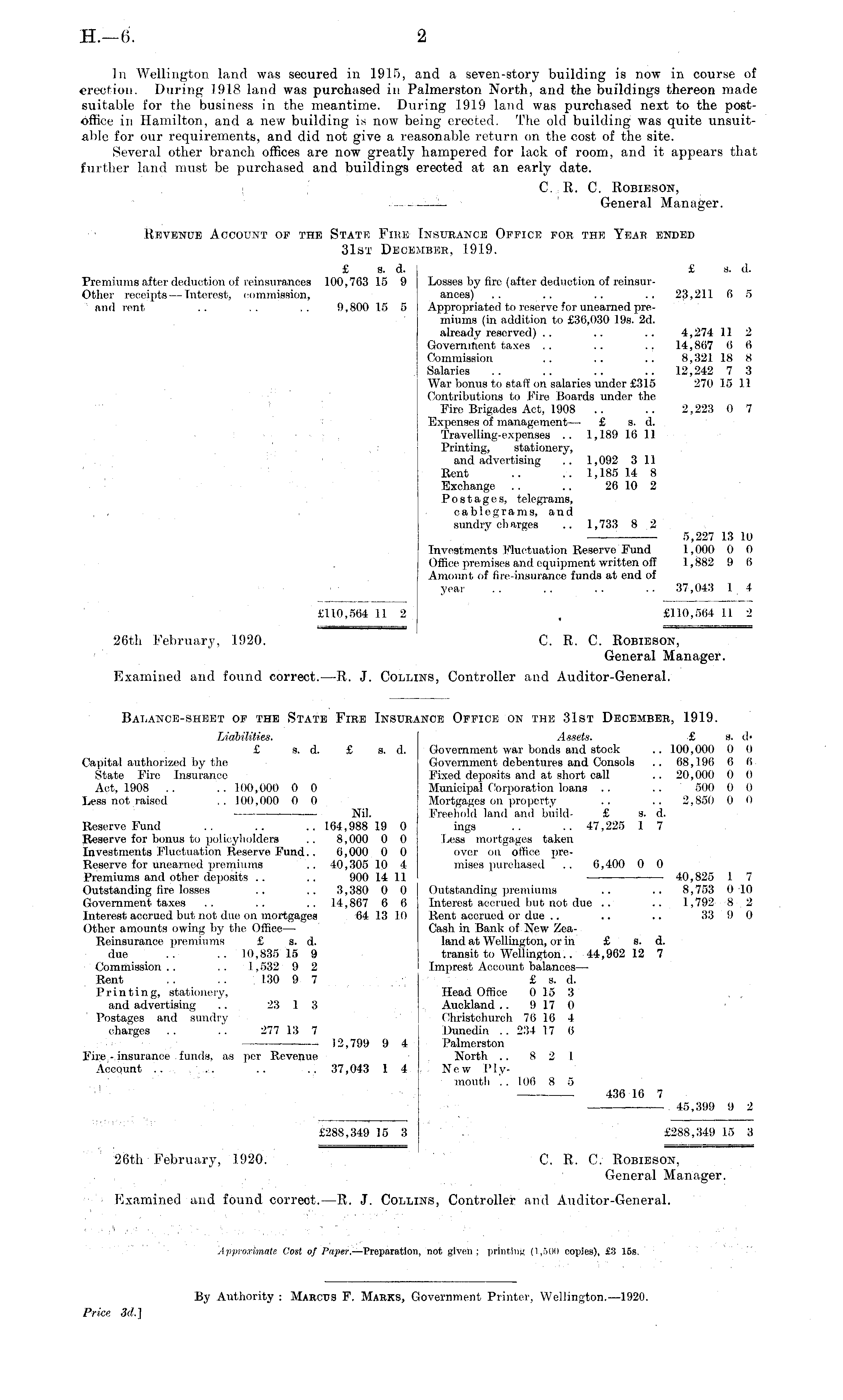 Revenue Account of the State Fire' Insurance Office for the Year ended 31st December, 1919. £ s. d. £ s. (1. Premium, after deduction of reinsurances 100,763 15 9 Losses by fire (after deduction of reinsurOthcr receipts — Interest, commission,, ances) .. .. .. .. 23,211 fi 5 and rent .. .. .. 9,800 15 5 Appropriated to reserve for unearned premiums (in addition to £36,030 19s. 2d. already reserved) .. .. .. 4,274 11 2 Government taxes .. .. .. 14,867 6 6 Commission .. .. .. 8,321 18 8 Salaries .. .. .. .. 12,242 7 3 War bonus to staff on salaries under £315 270 15 11 Contributions to Fire Boards under the Fire Brigades Act, 1908 .. .. 2,223 0 7 Expenses of management— £ s. d. Travelling-expenses .. 1,189 16 11 Printing, stationery, and advertising .. 1,092 3 II Rent .. .. 1,185 14 8 Exchange . . .. 26 10 2 Postages, telegrams, ' , , cablegrams, and sundry charges .. 1,733 8 2 5,227 13 10 Investments Fluctuation Reserve Fund 1,000 0 0 Office premises and equipment written off 1,882 9 6 Amount of fire-insurance funds at end of year .. .. .. .. 37,043 1 4 £110,564 11 2 £110,564 11 2 26th February, 1920. C. R. C. Robieson, General Manager. Examined and found correct. —R. J. Collins, Controller and Auditor-General. Balance-sheet of the State Fire Insurance Office on the 31st December, 1919. Liabilities. Assets. £ s. d- £ s. d. £ s. d. Government war bonds and stock .. 100,000 0 0 Capital authorized by the Government debentures and Consols .. 68,196 6 6 State Fire Insurance Fixed deposits and at short call .. 20,000 0 (I Act, 1908 . ... 100,000 0 0 Municipal Corporation loans . . .. 500 0 0 Less not raised .. 100,000 0 0 Mortgages on property .. .. 2,850 0 0 Nil. Freehold land and build- £ s. d. Reserve Fund .. .. .. 164,988 19 0 ings .. .. 47,225 1 7 Reserve for bonus to policyholders .. 8,000 0 0 Less mortgages taken Investments Fluctuation Reserve Fund.. 6,000 0 0 over on office preReserve for unearned premiums .. 40,305 10 4 mises purchased .. 6,400 0 0 Premiums and other deposits .. .. 900 14 11 —■ — 40,825 1 7 Outstanding fire losses .. .. 3,380 0 0 Outstanding premiums .. .. 8,753 010 Government taxes .. .. .. 14,867 6 6 Interest accrued but not due .. .. 1,792 8 2 Interest accrued but not due on mortgages 64 13 10 Rent accrued or due .. .. .. 33 9 0 Other amounts owing by the Office— Cash in Bank- of New ZeaReinsurance premiums £ a. d. land at Wellington, or in £ s. d. due .. .. 10,835 15 9 transit to Wellington.. 44,962 12 7 Commission.. .. 1,532 9 2 Imprest Account balances— Rent . . . . , 130 9 7 £ s. d. Printing, stationery, Head Office 015 3 and advertising .. 23 1 3 Auckland .. 917 0 Postages and sundry Christchurch 76 16 4 charges .. .'. 277 13 7 Dunedin .. 234 17 6 12,799 9 4 Palmerston Fire-insurance funds, as per Revenue North .. 8 2 1 Account .. ... .. .. 37,043 1 4 New IMvmoutli '.. 106 8 5 — 436 16 7 —.45,399 9 2 £288,349 15 3 £288,349 15 3 26th February, 1920. C. R. C. Robieson, Ceneral Manager. Examined and found correct. —R. J. Collins, Controller and Auditor-General.