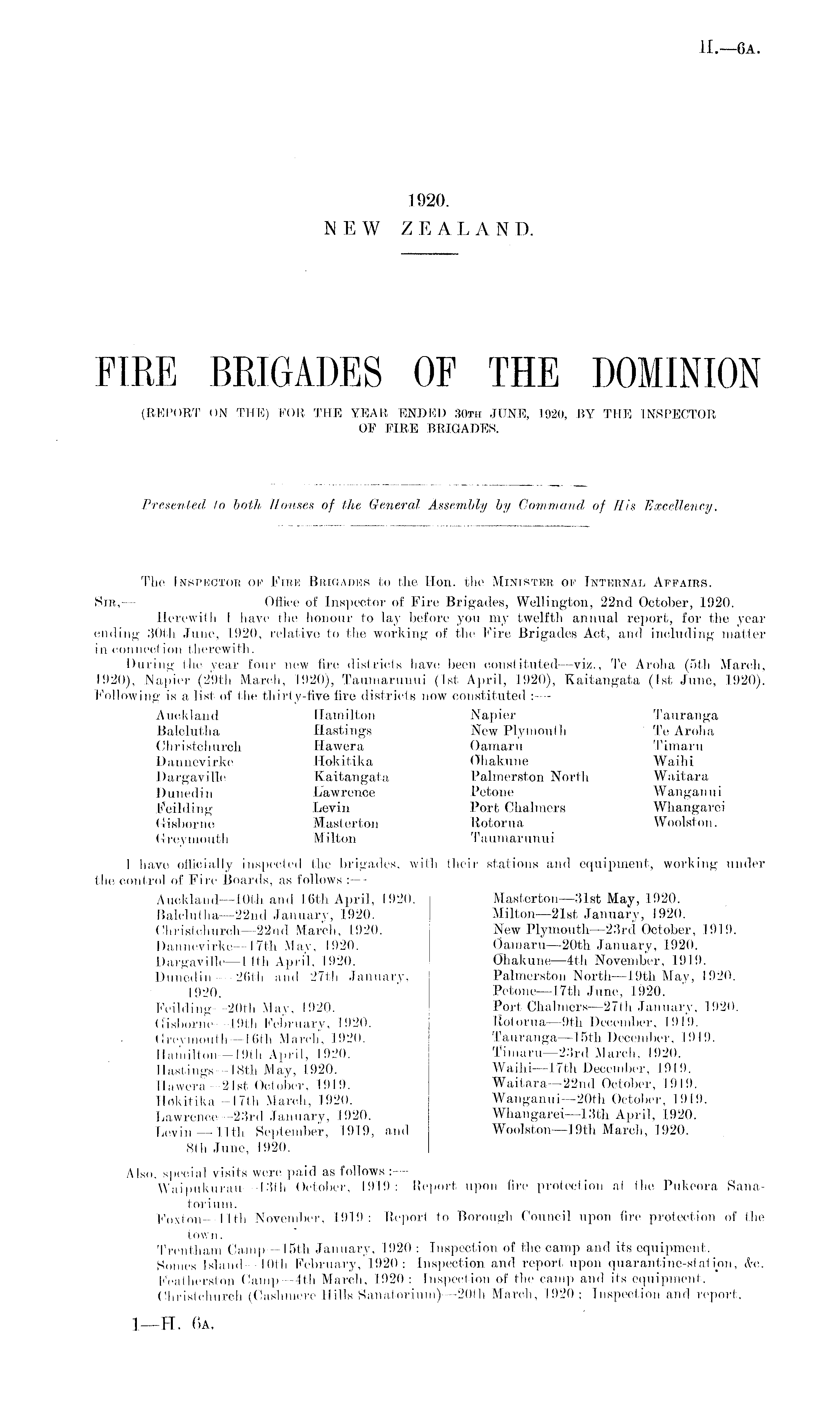 FIRE BRIGADES OF THE DOMINION (REPORT ON THE) FOR THE YEAR ENDED 30th JUNE, 1920, BY THE INSPECTOR OF FIRE BRIGADES.