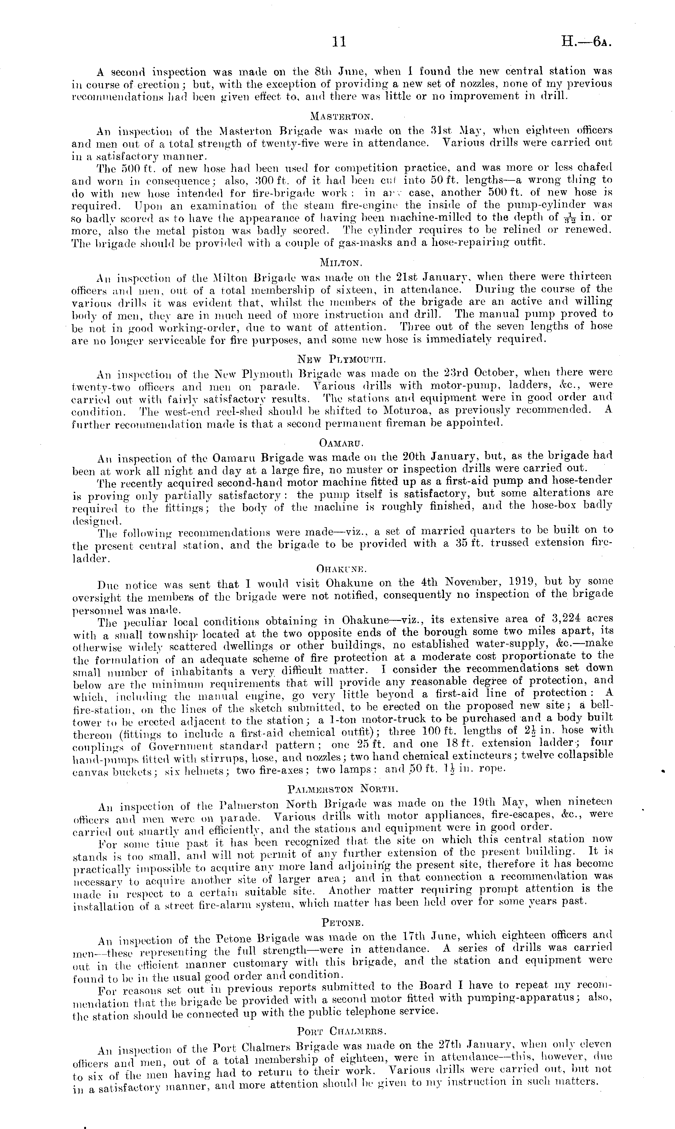 A second inspection was made on the Bth June, when I found the new central station was in course of erection; but, with the exception of providing a new set of nozzles, none of toy previous recommendations had been given effect to, and there was little or no improvement in drill. Masterton. An inspection of the Masterton Brigade was made on the 31st May, when eighteen officers and men out of a total strength of twenty-five were in attendance. Various drills were carried out in a satisfactory manner. The 500 ft. of new hose had been used for competition practice, and was more or less chafed and worn in consequence; also. 300 ft. of it had been cut into 50ft. lengths —a wrong thing to do with new hose intended for fire-brigade work: in arv case, another 500 ft. of new hose is required. Upon an examination of the steam fire-engine the inside of the pump-cylinder was so badly scored as to have the appearance of having been machine-milled to the depth of in. or more, also the metal piston was badly scored. The cylinder requires to be relined or renewed. The brigade should be provided with a couple of gas-masks and a hose-repairing outfit. Milton. An inspection of the Milton Brigade was made on the 21st January, when there were thirteen officers and men, out of a total membership of sixteen, in attendance. During the course of the various drills it was evident that, whilst the members of the brigade are an active and willing body of men, they are in much need of more instruction and drill. The manual pump proved to be not in good working-order, due to want of attention. Three out of the seven lengths of hose are no longer serviceable for fire purposes, and some new hose is immediately required. New Plymouth. An inspection of the New Plymouth Brigade was made on the 23rd October, when there were twenty-two officers and men on' parade. Various drills with motor-pump, ladders, &0., were carried out with fairly satisfactory results. The stations and equipment were in good order and condition. The west-end reel-shed should be shifted to Moturoa, as previously recommended. A further recommendation made is that a second permanent fireman be appointed. Oamaru. An inspection of the Oamaru Brigade was made on the 20th January, but, as the brigade had been at work all night and day at a large fire, no muster or inspection drills were carried out. The recently acquired second-hand motor machine fitted up as a first-aid pump and hose-tender is proving only partially satisfactory : the pump itself is satisfactory, but some alterations are required to the fittings; the body of the machine is roughly finished, and the hose-box badly designed. The following recommendations were made —viz., a set of married quarters to be built on to the present central station, and the brigade to be provided with a 35 ft. trussed extension fireladder. Ohakune. Due notice was sent that I would visit Ohakune on the 4th November, 1919, but by some oversight the membens of the brigade were not notified, consequently no inspection of the brigade personnel was made. _ The peculiar local conditions obtaining in Ohakune—viz., its extensive area of .5,224 acres with a small township located at the two opposite ends of the borough some two miles apart, its otherwise widely scattered dwellings or other buildings, no established water-supply, &c—make the formulation of an adequate scheme of fire protection at a moderate cost proportionate to the small number of inhabitants a very difficult matter. I consider the recommendations set down below are the minimum requirements that will provide any reasonable degree of protection, and which including the manual engine, go very little beyond a first-aid line of protection : A fire-station, on the lines of the sketch submitted, to be erected on the proposed new site; a belltower to be' erected adjacent to the station; a 1-ton motor-truck to be purchased and a body built thereon (fittings to include a first-aid chemical outfit); three 100 ft. lengths of 2J in. hose with couplings of Government standard pattern; one 25ft. and one 18ft. extension ladder; four hand-pumps fitted with stirrups, hose, and nozzles ; two hand chemical extincteurs; twelve collapsible canvas buckets; six helmets j two fire-axes ; two lamps : and 50 ft, H in. rope. Palmerston North. An inspection of the Palmerston North Brigade was made on the 19th May, when nineteen officers and men were on parade. Various drills with motor appliances, fire-escapes, &c, were carried out smartly and efficiently, and the stations and equipment were in good order. For some time past it has been recognized that the site on which this central station now stands is too small, and will not permit of any further extension of the present building It is practically impossible to acquire any more land adjoining the present site, therefore it has become necessary to acquire another site of larger area; and in that connection a recommendation was made in respect to a certain suitable site. Another matter requiring prompt attention is the installation of a street fire-alarm system, which matter has been held over for some years past. Petone. An inspection of the Petone Brigade was made on the 17th June, which eighteen officers and men—these representing the full strength—were in attendance. A series of drills was carried out in the efficient manner customary with this brigade, and the station and equipment were found to be in the usual good order and condition. ,„„,,,, For reasons set out in previous reports submitted to the Board I have to repeat my recommendation that the brigade be provided with a second motor fitted with pumping-apparatus; also, the station should be connected up with the public telephone service. Port CHALMERS. An inspection of the Port Chalmers Brigade was made on the 27th January, when only eleven officers and men, out of a total membership of eighteen, were in attendance—this however due to six of the men having