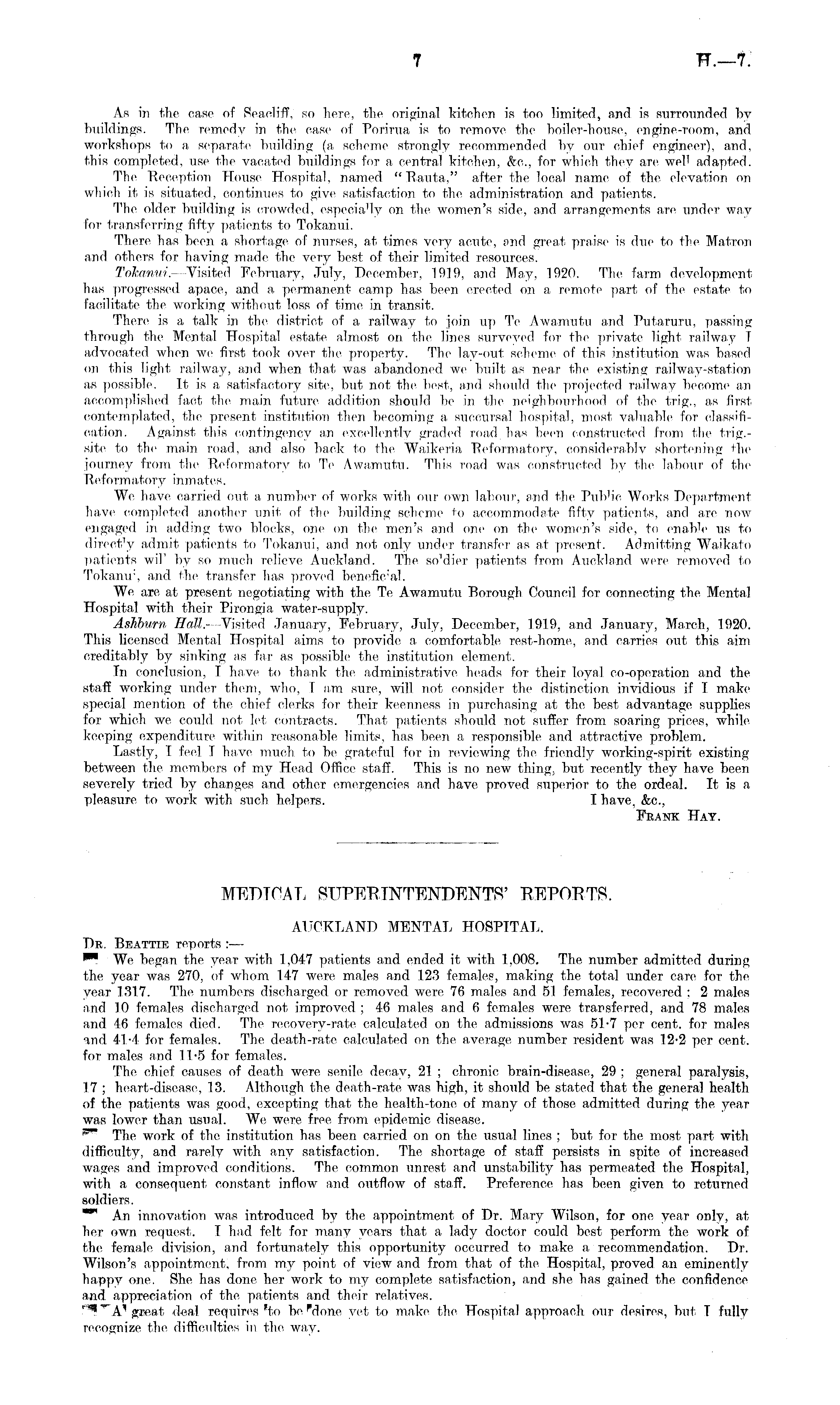 MTCDTOAL STTPTCTCTNTTCNPTCNTR' "REPORTS. AUCKLAND MENTAL HOSPITAL. Dr. Beattie reports : — We began the year with 1,047 patients and ended it with 1,008. The number admitted during the year was 270, of whom 147 were males and 123 females, making the total under care for the year 1317. The numbers discharged or removed were 76 males and 51 females, recovered ; 2 males and 10 females discharged not improved ; 46 males and 6 females were transferred, and 78 males and 46 females died. The recovery-Bate calculated on the admissions was 51-7 per cent, for males and 41-4 for females. The death-rate calculated on the average, number resident was 12-2 per cent, for males and 11-5 for females. The chief causes of death were senile, decay, 21 ; chronic brain-disease, 29 ; general paralysis, 17 ; heart-disease, 13. Although the death-rate was high, it should be stated that the genera] health of the patients was good, excepting that the health-tone of many of those, admitted during the year was lower than usual. We were free from epidemic disease. The work of the institution has been carried on on the usual lines ; but for the most part with difficulty, and rarely with any satisfaction. The. shortage of staff persists in spite of increased wages and improved conditions. The common unrest and unstability has permeated the Hospital, with a consequent constant inflow and outflow of staff. Preference has been given to returned soldiers. """ An innovation was introduced by the appointment of Dr. Mary Wilson, for one year only, at her own request. I had felt for many years that a lady doctor could best perform the work of the female division, and fortunately this opportunity occurred to make a recommendation. Dr. Wilson's appointment, from my point of view and from that of the Hospital, proved an eminently happy one. She has done her work to my complete satisfaction, and she has gained the confidence and appreciation of the, patients and their relatives. '"^.^ A 1 great deal requires'to be Mone yet to make the Hospital approach our desires, but T fully recognize the difficulties in the way.