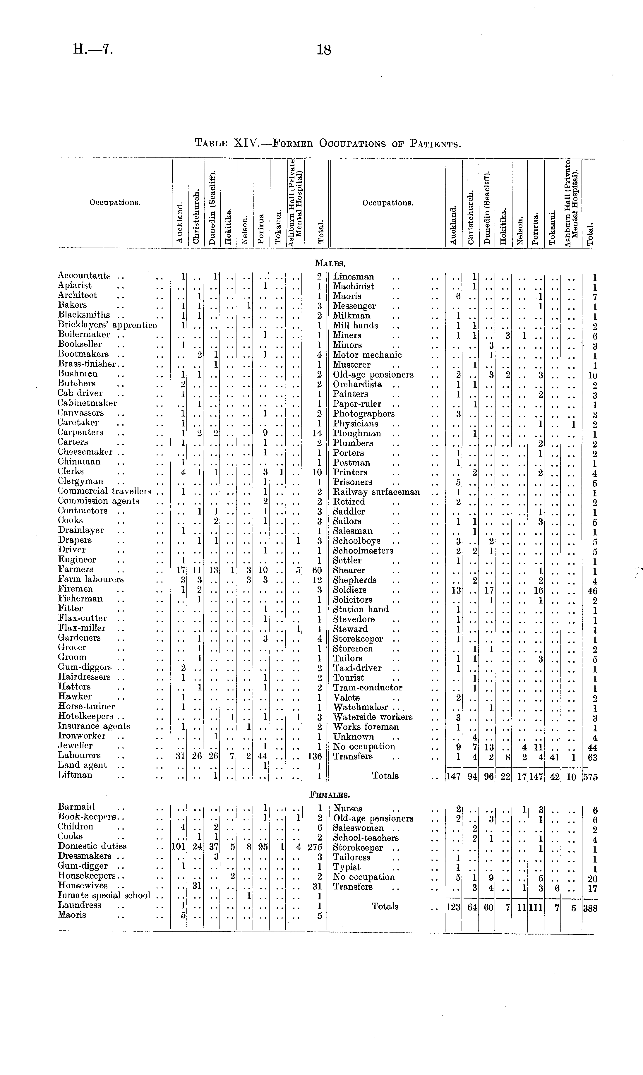 Occupations. ■a « p -4 4 3 A HJ II. 0 i» s D CO a ID a a D +6 •Ej Oh Th & =3 4H w: a* 8 o ssS CO -r; Occupations. .a o u a si V CO 'C £1 B a <o CO 3 -o ID a s R ill Id £1 —p. —. CO -3 ° a j 3 3 40« DO cS £ 0 H 9 3 o u x '2 id o 9 5 o3 M 0 H 3 o 3 | o 3 < a £] 4= 3 o W a o en i» Z 3 a o 3 a c3 o H o H Mai JES. Accountants Apiarist Architect Bakers Blaoksmiths .Bricklayers' apprentice Boilermaker Bookseller Bootmakers Brass-finisher.. Bushmen Butchers Cab-driver Cabinetmaker Canvassers Caretaker Carpenters Carters Cheesemakcr Chinaman Clerks Clergyman Commercial travellers .. Commission agents Contractors Cooks Drain layer Drapers Driver Engineer Farmers Farm labourers Firemen Fisherman Fitter Flax-cutter Flax-miller Gardeners Grocer Groom Gum-diggers Hairdressers Hatters Hawker Horse-trainer Hotolkeopcrs Insurance agents Ironworker Jeweller Labourers Land agent Liftman .. 1 1 1 1 1 4 2 1 2 i 2 i i - i i 9 i i 3 1 1 2 1 1 i ••I 2 1 1 3 2 1 1 1 4 1 2 2 1 I 2 1 14 2 1 1 10 1 2 2 3 3 1 3 1 1 60 12 3 1 1 1 1 4 1 1 2 2 2 1 1 3 2 1 1 136 1 1 Linesman Machinist Maoris Messenger Milkman Mill hands Miners Minors Motor mechanic Musterer Old-age pensioners Orchardists Painters Paper-ruler Photographers Physicians Ploughman .. Plumbers Porters Postman Printers Prisoners Railway surfaceman Retired Saddler Sailors Salesman Schoolboys Schoolmasters Settler Shearer Shepherds Soldiers Solicitors Station hand Stovedore Steward Storekeeper .. Storemen Tailors Taxi-driver .. Tourist Tram-conductor Valets Watchmakor .. Waterside workers Works foreman Unknown No occupation Transfers 6 I 1 I 2 1 1 3 i 1 5 1 2 i I 2 i l 1 1 3 1 3 3 2 1 3 i l 3 2 i 2 1 2 1 1 7 1 1 2 6 3 1 1 10 2 3 1 3 2 1 2 2 1 4 5 1 2 1 5 1 5 5 1 1 4 46 2 1 I 1 1 2 5 1 1 1 2 1 3 1 4 44 63 i i i i 3 .. 2 2 1 .. 2 1 2 17 11 3 2 13 3 3 io 3 5 2 1 2 16 1 .. 2 13 .. 17 1 i i i 1 .. 1 .. 1 .. 1 .. 3 .. 1 1 1 1 .. i l i 3 i 1 1 .. 1 i l • -i .. 1 2 .. i i 3 .. 1 .. .. 4 9 7 1 4 i • •: . .i i i 44 1 13 2 I 2 ii! 4 1 31 26 26 7 8 ii i I Totals 147 94 96 22 17 147; 42 10 575 Barmaid Book-keepers.. Children Cooks Domestic duties Dressmakers Gum-digger Housekeepers Housewives Inmate special school . . Laundress Maoris Femj .LES. 2 .. 2 .. 4 ioi i 24 2 1 37 3 5 8 1 1 95 i 1 4 1 2 6 2 275 3 1 2 31 1 1 5 Nurses Old-age pensioners Saleswomen .. School-teachers Storekeeper .. Tailoress Typist No occupation Transfers .. 2 2 2 3 i 1 i 1 3 1 6 6 2 4 1 1 1 20 17 i 2 1 1 6 81 i 3 .9 4 I 5 3 (i i 1 5 Totals 123 64 60 7 111 5 388 II