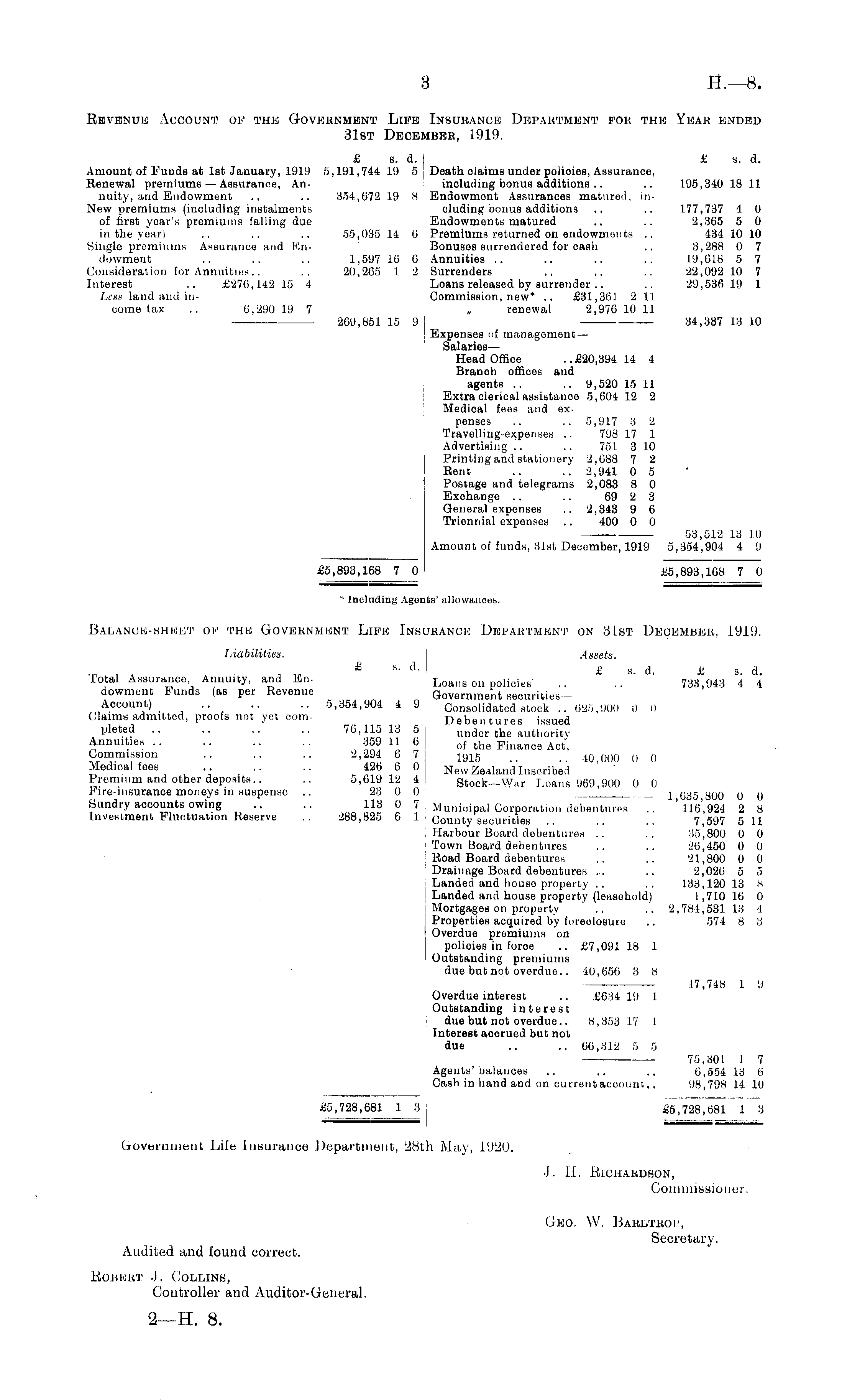 Revenue Account of the Government Life Insurance Department pok the Year ended 31st December, 1919. £ s. d. I £ s. d. Amount of Funds at Ist January, 1919 5,191,744 19 5 ; Death claims under polioies, Assurance, Renewal premiums — Assurance, An- inclueling bonus additions .. .. 195,340 18 11 nuity, and Endowment .. .. 354,672 19 8 Endowment Assurances matured, inNew premiums (including instalments oluding bonus additions .. .. 177,737 4 0 of first year's premiums falling due : Endowments matured .. .. 2,365 5 0 in the year) .. .. .. 55,035 14 0 | Premiums returned on endowments .. 434 10 10 Single premiums Assurance and En- Bonuses surrendered for cash .. 3,288 0 7 dowment .. .. .. 1,597 16 6 Annuities .. .. .. .. 19,618 5 7 Consideration for Annuities.. '.. 20,2(55 1 2 Surrenders .. .. .. 22,092 10 7 Interest .. .£276,142 15 4 Loans released by surrender .. .. 29,536 19 1 Less land and in- Commission, new* .. £31,361 2it come tax .. 6,290 19 7 „ renewal 2,976 10 11 269,851 15 9 , 34,337 13 10 Expenses of management— Salaries— Head Office ..£20,394 14 4 Branoh offioes and agents .. .. 9,520 15 11 Extra clerical assistance 5,604 12 2 Medical fees and expenses .. .. 5,917 8 2 Travolling-exponses .. 798 17 1 Advertising .. .. 751 3 10 Printing and stationery 2,688 7 2 Rent .. .. 2,941 0 5 Postage and telegrams 2,083 8 0 Exchange .. .. 69 2 3 General expenses .. 2,343 9 6 Triennial expenses .. 400 0 0 53,512 13 10 Amount of funds, 31st December, 1919 5,354,904 4 9 £5,893,168 7 0 80,893,168 7 v ! Including Agents' allowances, Balance-bhket of the Government Life Insurance Department on 81st December, 1919. Liabilities. Assets. £ s. d. £sd £sd Total Assurance Annuity, and En- Loans on policies .. .. 733,943 i i dowment Funds (as per Revenue Government securities - Account) .. .. 5,354,904 4 9 Consolidated stock .. 625,<)0<) 0 0 Claims admitted, proofs not yet com- Debentures issued yleted 76,115 13 5 under the authority Annuities 359 11 6 of tiro Finance Aot", Commission 2,294 6 7 1918 ~ ~ 10000 0 0 Medical fees . .. .. 420 6 0 New Zealand Inscribed Premium and other deposits.. .. 0,619 12 4 Btook—War Loans 969,900 0 0 Fire-insurance moneys in suspense .. 23 0 0 , j (jyj y O O 0 Sundry accounts owing .. 113 0 7 Municipal Corporation debentures .. ' 1ie',924 2 8 Investment Fluctuat.on Reserve .. 288,825 6 1 County securities .. .. 7,597 511 Harbour Board debentures .. .. 35,800 0 0 Town Board debentures .. .. 26,450 0 0 Road Board debentures .. .. 21,800 0 0 Drainage Board debentures .. .. 2,026 5 5 Landed and bouse property .. .. 133,120 13 8 Landed and house property (leasehold) 1,710 16 0 Mortgages on property .. .. 2,784,531 13 4 Properties acquired by foreclosure .. 574 8 3 Overdue premiums on policies in force .. £7,091 18 1 Outstanding premiums due but not overdue.. 40,656 8 8 17,748 1 9 Overdue interest .. £634 19 1 Outstanding interest due but not overdue.. 8,353 17 1 Interest aoorued but not due .. .. 66,312 5 5 75,301 1 7 Agents' balances .. .. .. 6,554 13 6 Cash in hand and on current account,.. 98,798 14 10 £5,728,681 1 3 £0,728,681 1 3 Government Life Insurance Department, 28th May, L'JW. •I. 11. Richardson, Commissioner. Geo. W. Babltbop, Secretary. Audited and found correct. Robert J. Collins, Controller and Auditor-General.