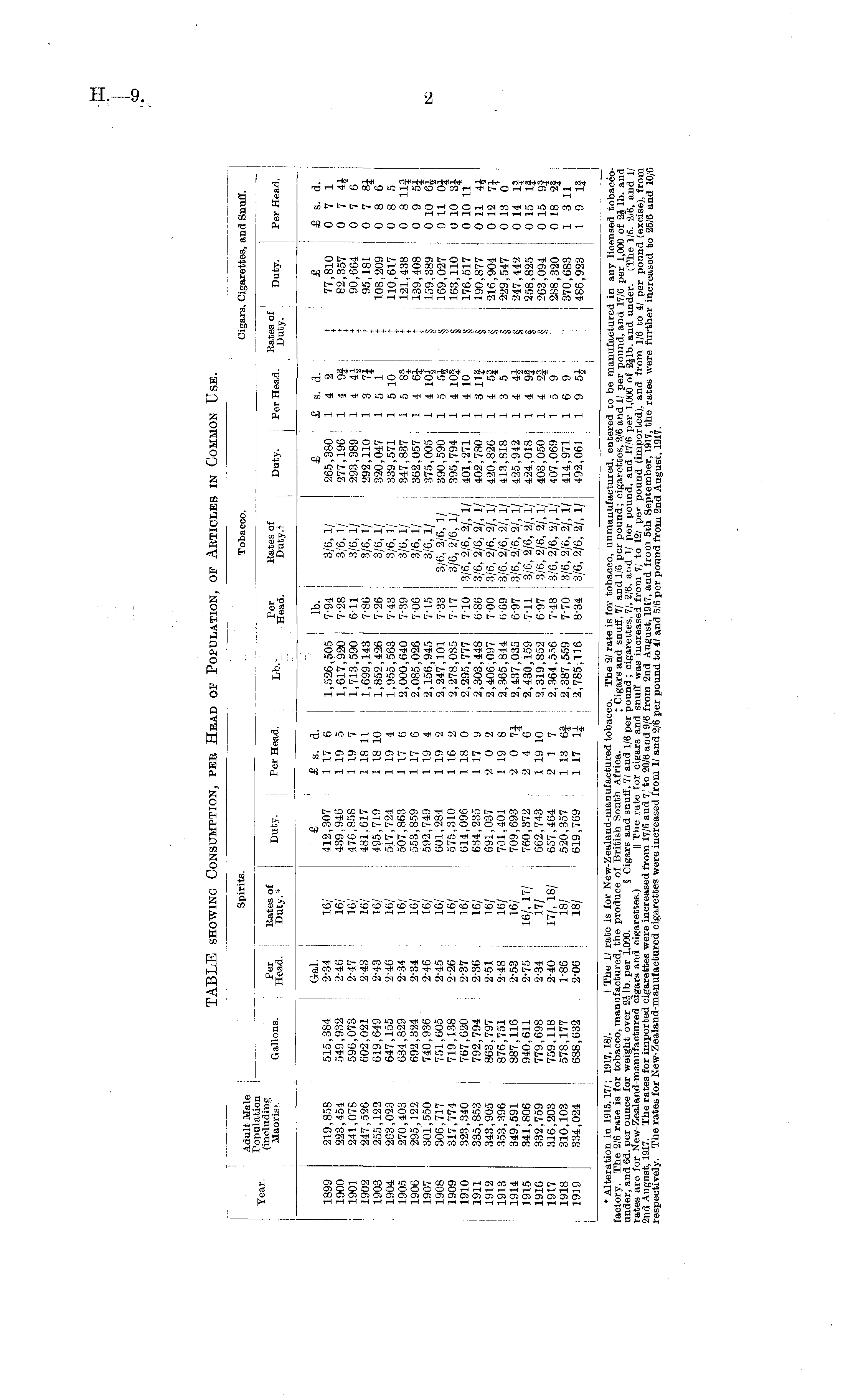 Spirits. Tobacco. Cigars, Cigarettes, and Snuff. Adult Male Year. (including Maoris). Gallons. Per Head. Bates of Duty. * Duty. Per Head. Lb. Per Head. Rates of Duty.t Duty. Per Head. Kates of Duty. Duty. Per Head. 1899 1900 1901 1902 1903 1904 1905 1906 1907 1908 1909 1910 1911 1912 1913 1914 1915 1916 1917 1918 1919 219,858 223,454 241,078 247,526 255,122 263,023 270,403 295,122 301,550 306,717 317,774 323,340 335,853 343,905 353,396 349,591 341,806 332,759 316,203 310,103 334,024 515,384 549,932 596,073 602,021 619,649 647,155 634,829 692,324 740,936 751,605 719,138 767,620 792,794 863,797 876,751 887,116 940,611 779,698 759,118 578,177 688,632 Gal. 2-34 2-46 2-47 2-43 2-43 2-46 2-34 2-34 2-46 2-45 2-26 2-37 2-36 2-51 2-48 2-53 2-75 2-34 2-40 1-86 2-06 16/ 16/ 16/ 16/ 16/ 16/ 16/ 16/ 16/ 16/ 16/ 16/ 16/ 16/ 16/ 16/ 16/, 17/ 17/ 17/, 18/ 18/ 18/ £ 412,307 439,946 476,858 481.617 495,719 517,724 507,863 553,859 592,749 601,284 575,310 614,096 634,235 691,037 701,401 709,693 760,372 662,743 657,464 520,357 619,769 £ s. a. 1 17 6 1,526,505 1 19 5 | 1,617,920 1 19 V i 1,713,590 1 18 11 ' 1,699,143 1 18 10 1.852,426 1 19 4 1.955,563 1 17 6 2,000,640 1 17 6 ' 2,085,026 1 19 4 2,156,945 1 19 2 2,247,101 1 16 2 2,278,035 1 18 0 2,295,777 1 17 9 2,303,448 2 0 2 2,406,097 1 19 8 2,365,844 2 0 7J 2,437,035 2 4 6 2,430,159 1 19 10 ' 2,319,852 2 17 2,364,556 1 13 6f 2,387,559 1 17 lj 2,785,116 lb. £ £ s. d. 7-94 3/6, 1/ 265,380 14 2 7-28 3/6, 1/ I 277,196 1 4 9| 6-11 3/6, 1/ ' 293,389 1 4 4± 7-86 3/6,1/ 292,110 1 3 7J 7-26 3/6, 1/ 320,047 1 5 1 7-43 3/6, 1/ 339,571 1 5 10 7-39 3/6,1/ 347,837 1 5 Sf 7-06 3/6,1/ 362,057 1 4 6J 7-15 3/6, 1/ 375,005 1 4 10£ 7-33 3/6, 2/6, 1/ 390,590 1 15 5J 7 17 3/6,2/6,1/ 395,794 1 4 10| 7-10 3/6, 2/6, 2/, 1/ 401,271 1 4 10 6-86 3/6, 2/6, 2/, 1/ 402,780 1 3 llf 700 3/6, 2/6, 2/, 1/ 420,826 1 4 5f 6-69 3/6, 2/6, 2/, 1/ 413,818 13 5 6-97 3/6, 2/6, 2/, 1/ 425,942 14 4* 7-11 3/6, 2/6, 2/, 1/ 424,018 1 4 9f 6-97 3/6, 2/6, 2/, 1/ 403,050 1 4 2f 7-48 3,6, 2/6, 2/, 1/ 407,069 1 5 9 7-70 3/6, 2/6, 2/, 1/ 414,971 1 6 9 8-34 3/6, 2/6, 2/, 1/ 492,061 1 9 5 J + + + + + + § § § || £ & a. d. 77,810 0 7 1 82,357 0 I 4J 90,664 0 7 6 95,181 0 7 8J 108,209 i 0 8 6 110,617 ! 0 8 5 121,438 0 8 llf 139,408 0 9 5J 159,389 0 10 6| 169,027 0 11 0J 163,110 0 10 3| 176,517 0 10 11 190,877 0 11 44 216,904 0 12 7* 229,547 i 0 13 0 247,442 i 0 14 If 258,825 0 15 If 263,094 I 0 15 9} 288,320 0 18 2f 370,683 1 3 11 486,923 1 9 If * Alteration in 1915, 17/; 1917, 18/. t The 1/ rate is for Xew-Zealand-manufactured tobacco. The 2' rate is for tobacco, unmanufactured, entered to be manufactured in any licensed tobaccofactory. The 2,6 rate is for tobacco, manufactured, the produce of British South Africa. J Cigars and snuff, 7/ and 1 6 per pound; cigarettes, 2/6 and 1/ per pound and 17-6 per ! 000 of 2i lb and under, and 6d. per ounce for weight over 2J lb. per 1,000. § Cigars and snuff, 7; and 1/6 per pound ; cigarettes. 7', 2!6, and 1/ per pound, and 17,6 per 1,000 of 2§lb and under (The 1/6 2 6 and 1/ rates are for New-Zealand-manufactured cigars and cigarettes.) | The rate for cigars and snuff was increased from 7 to 12; per pound (imported), and from 1/6 to il per pound (excise) from 2nd August, 1917. The rates for imported cigarettes were increased from 17/6 and 7, to 20/6 and 9/6 from 2nd August, 1917, and from 5th September. 1917, the rates were further increased to 25/6 and 10/6 respectively. The rates for New-Zealand-manufactured cigarettes were increased from 1/ and 2/6 per pound to il and 5,6 per pound from 2nd August 1917